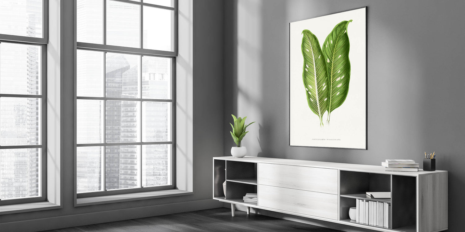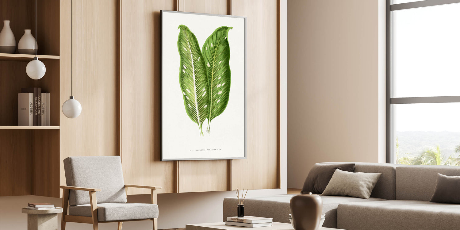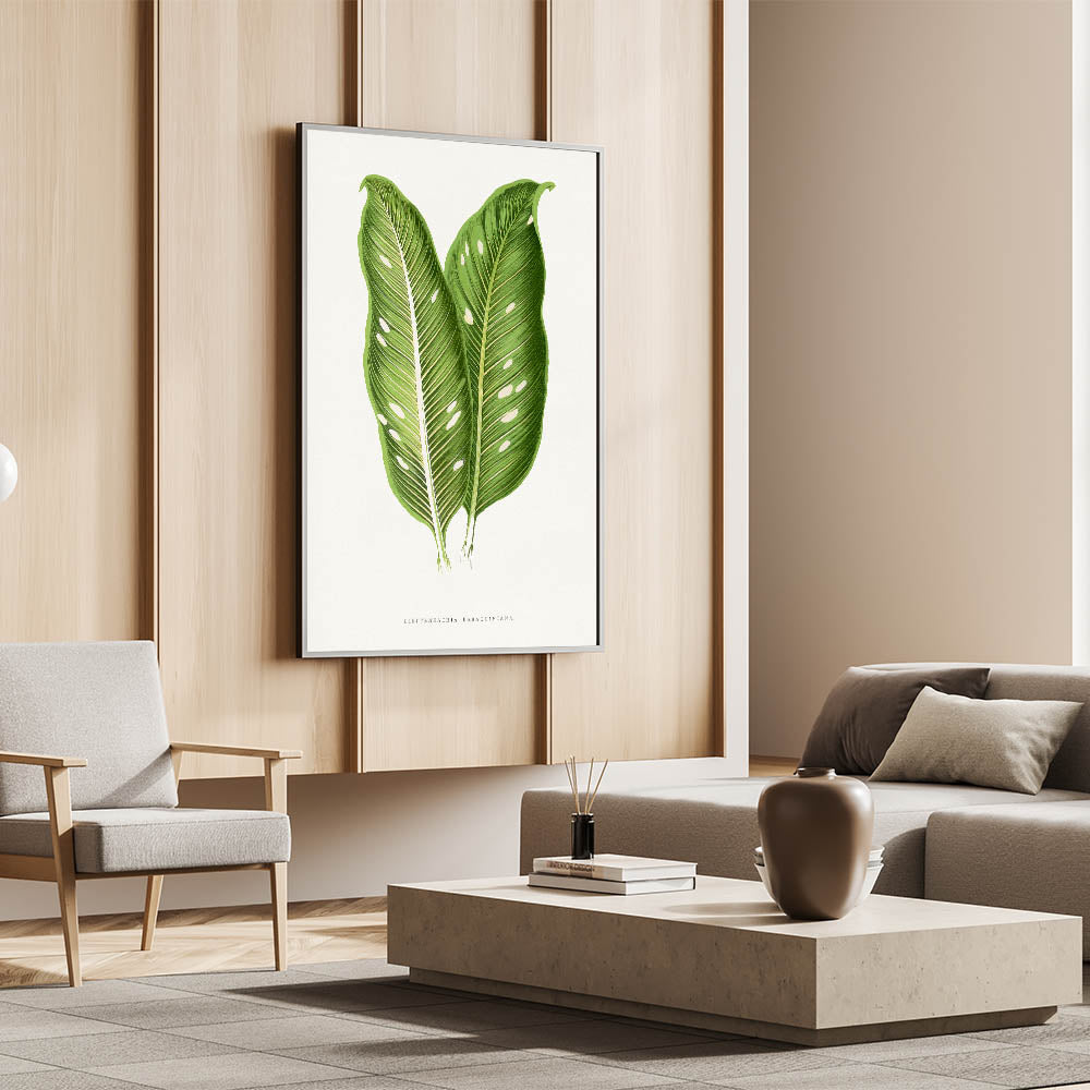 Transform your space with this elegant Romanticism style wall art, showcasing the intricate Green Dieffenbachia Baraquiniana leaf. This botanical masterpiece originates from the 1865 edition of Les Plantes à Feuillage Coloré by Alexander Francis Lydon and Benjamin Fawsett. Its lush, detailed rendering of vibrant green leaves with delicate white markings reflects the classic art of the Romantic era, celebrating the beauty and intricacy of nature.