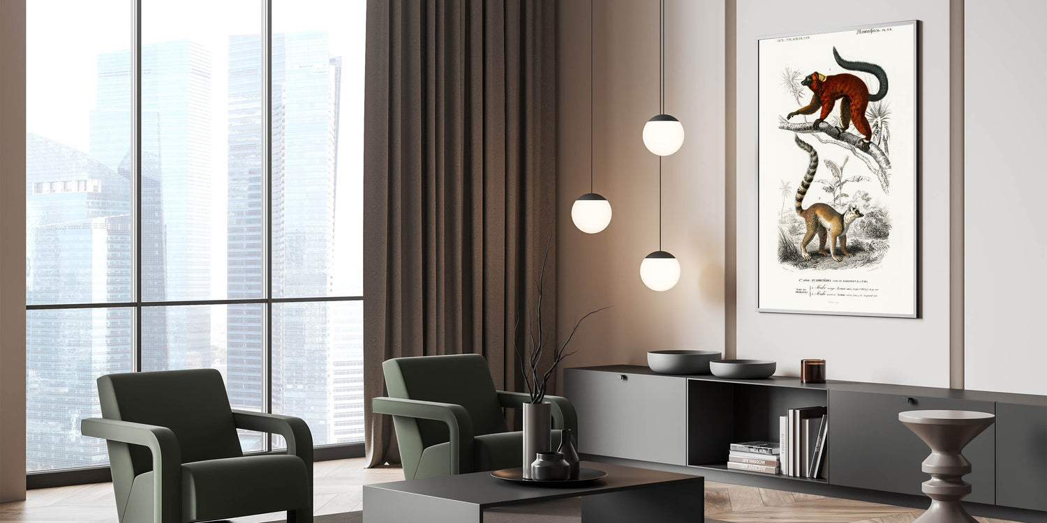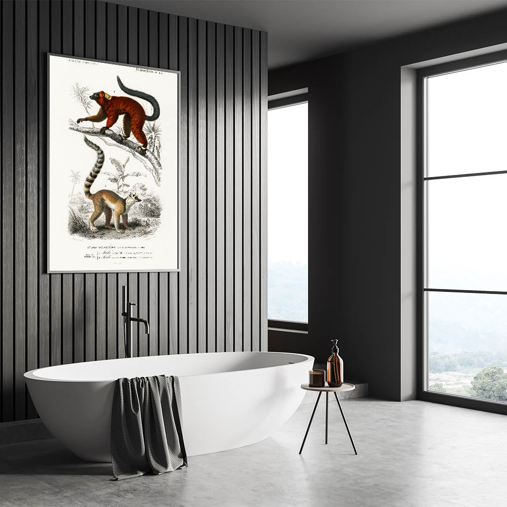 Capture the exotic charm of wildlife with "Lemurs" by Charles Dessalines D'Orbigny. This beautifully detailed Romanticism illustration brings the world of lemurs to life, set amidst lush natural surroundings. The artwork highlights the era’s fascination with nature, offering emotional landscapes and portraits that bring a sense of wonder to your decor.