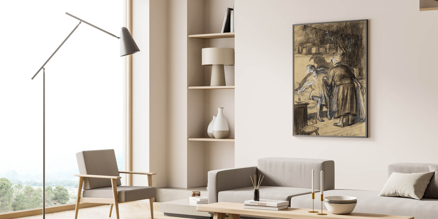 Bring a moment of humor and warmth to your decor with "Here Are Your Trousers" by William James Glackens, a unique piece from our Realism Art Prints collection. This expressive scene captures a humorous domestic moment as a woman hands a man his trousers in a rustic interior setting. Rendered in charcoal and sepia tones, the artwork’s detailed shading and character expressions evoke a sense of charm and nostalgia, making it a perfect addition to any space that values personality and timeless stories.