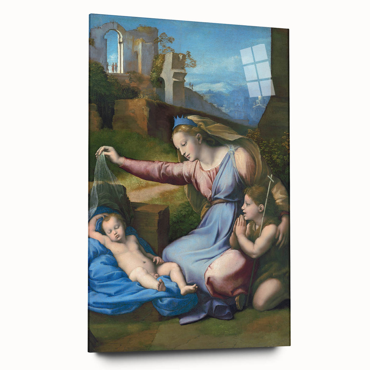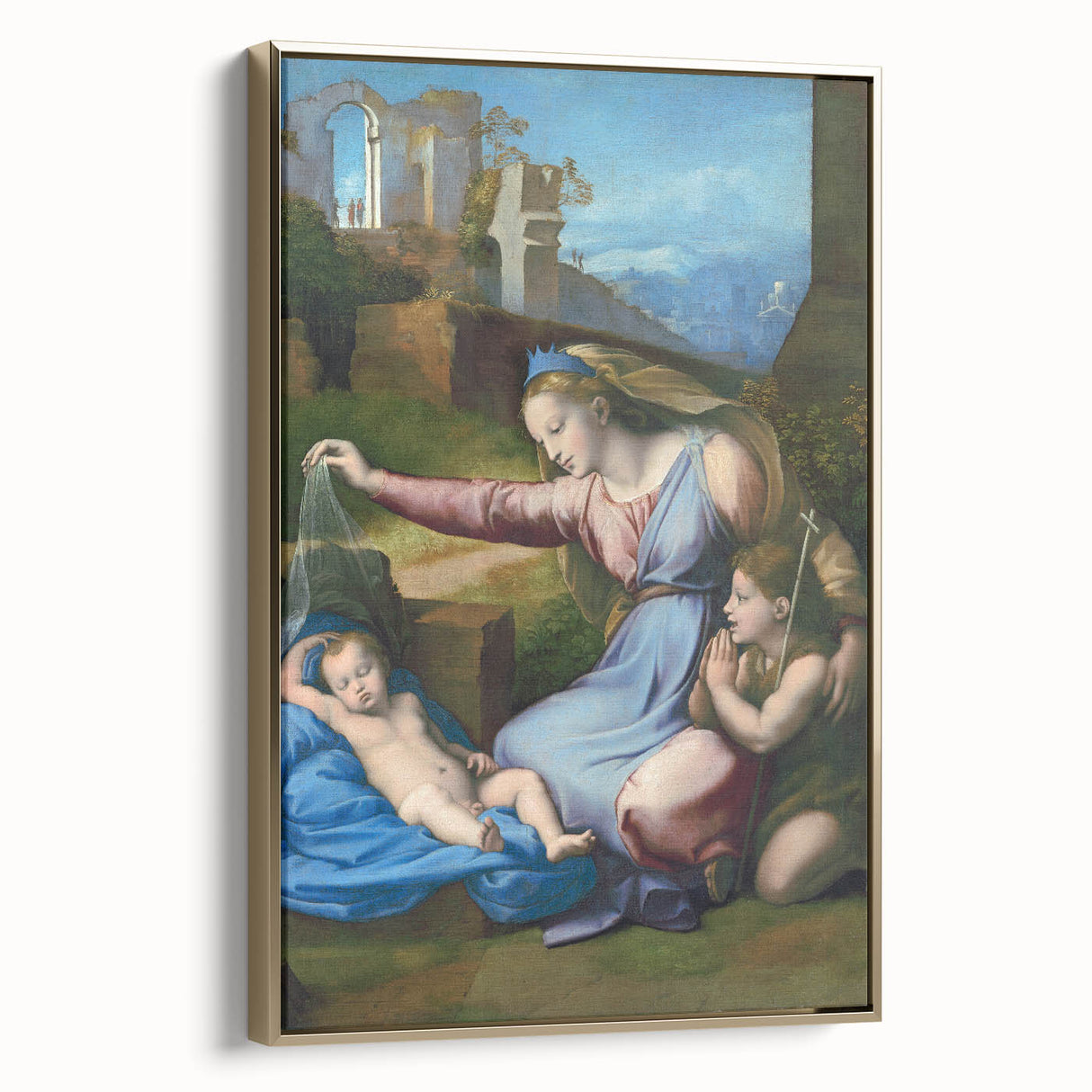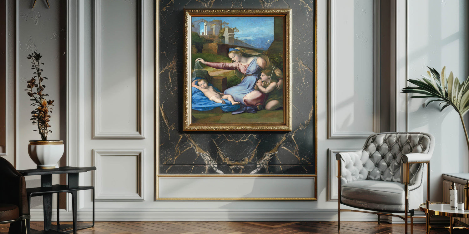 Infuse your home with the serene beauty of the Renaissance with this iconic "Madonna and Child" artwork. This stunning depiction portrays the Virgin Mary tenderly watching over the sleeping Christ child, with young John the Baptist praying beside them. The lush landscape and architectural ruins in the background highlight the Renaissance's artistic mastery in blending spirituality with naturalism. Perfect for lovers of classic Renaissance decor, this piece adds a sense of cultural elegance to any room.