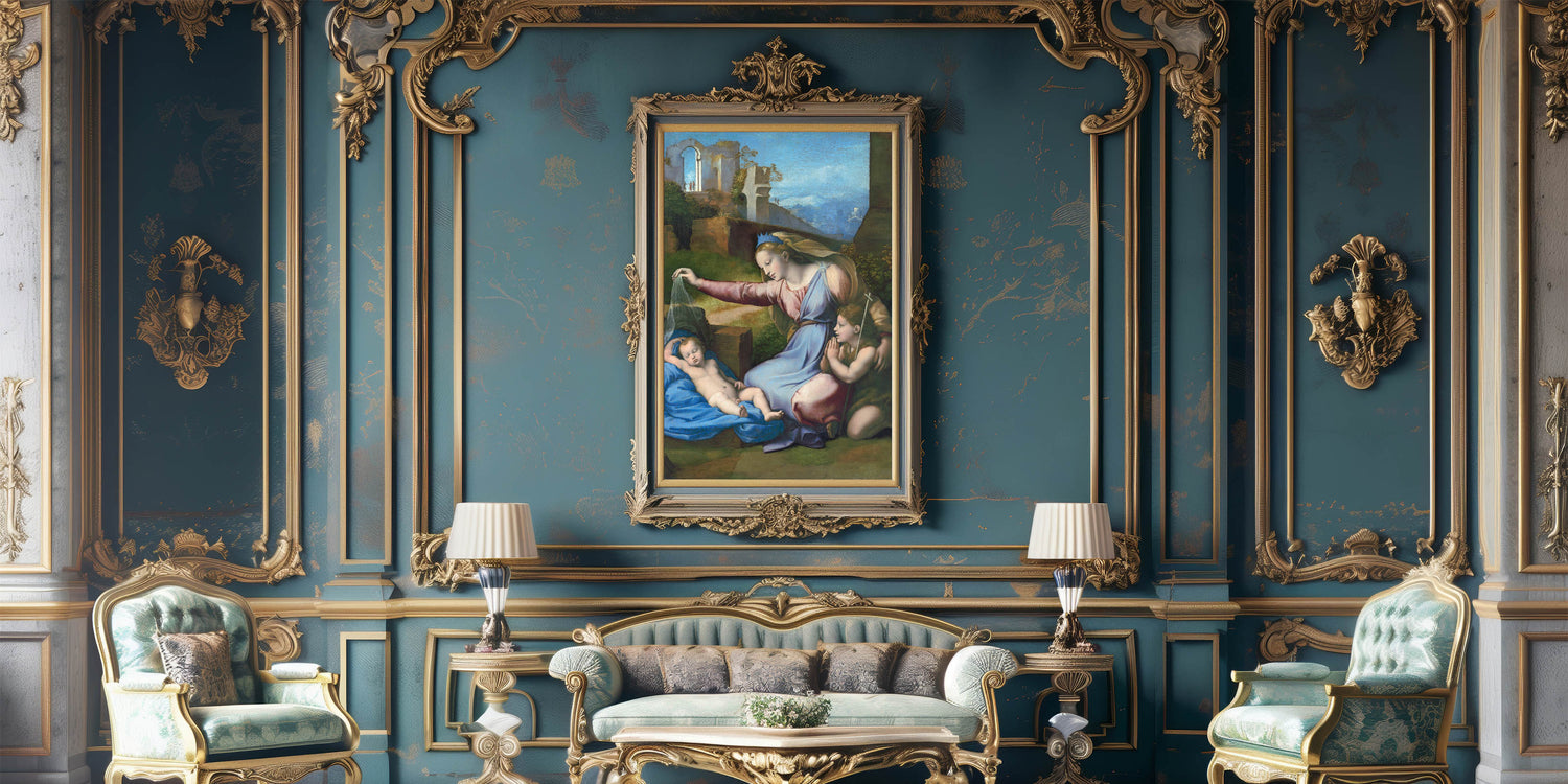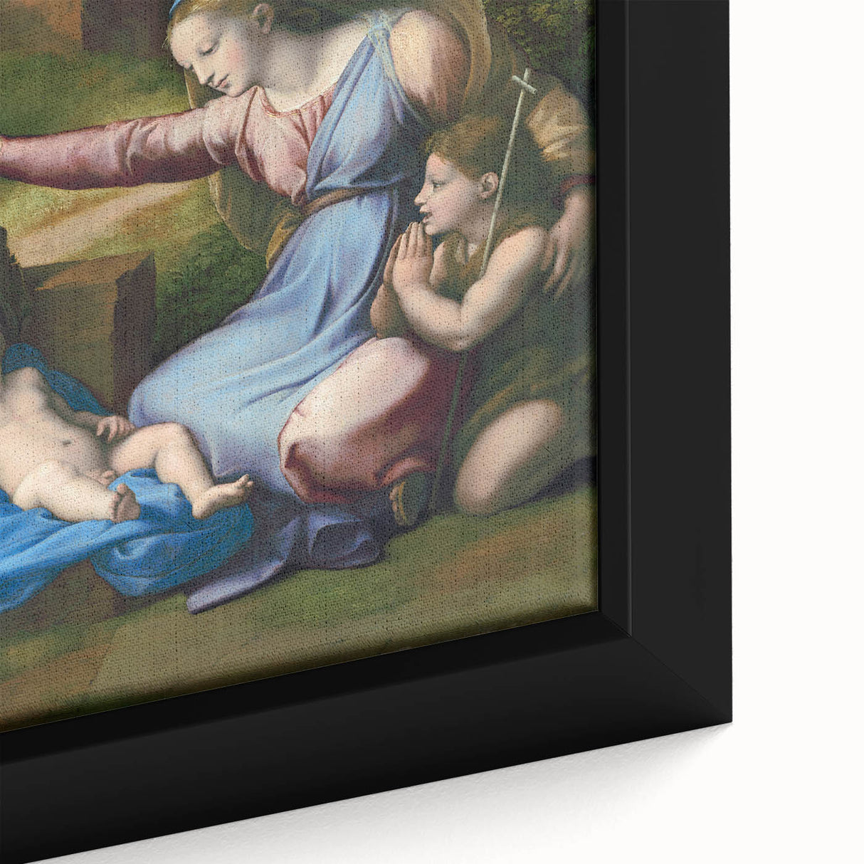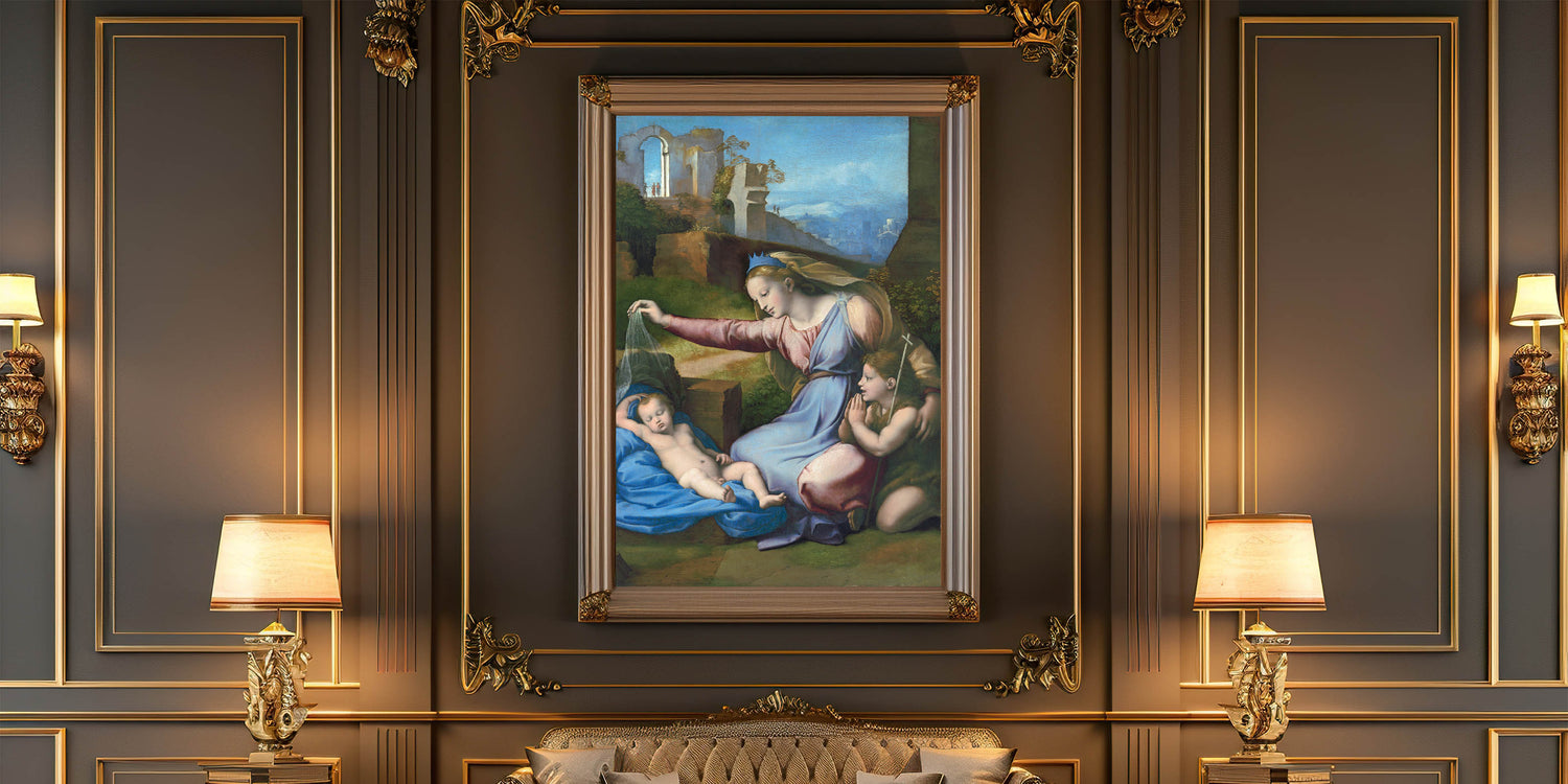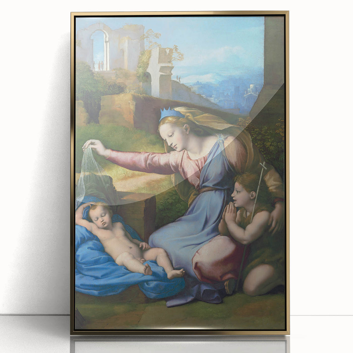 Infuse your home with the serene beauty of the Renaissance with this iconic "Madonna and Child" artwork. This stunning depiction portrays the Virgin Mary tenderly watching over the sleeping Christ child, with young John the Baptist praying beside them. The lush landscape and architectural ruins in the background highlight the Renaissance's artistic mastery in blending spirituality with naturalism. Perfect for lovers of classic Renaissance decor, this piece adds a sense of cultural elegance to any room.