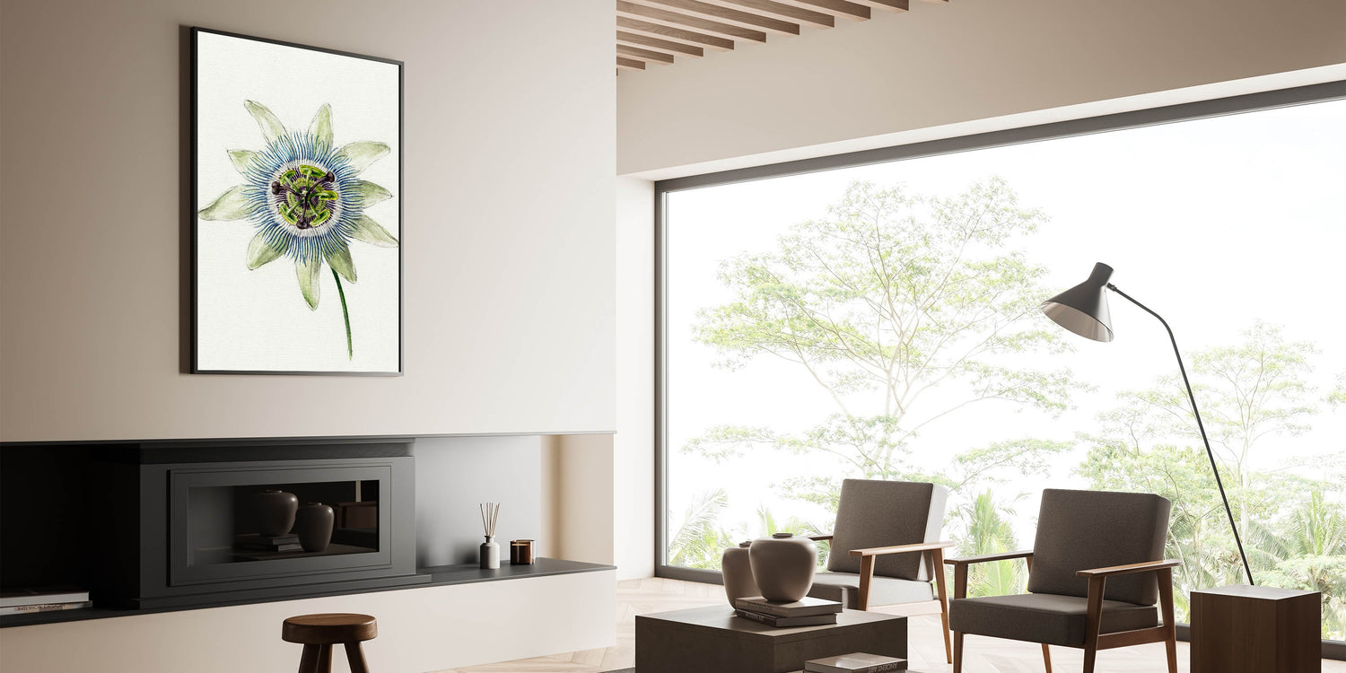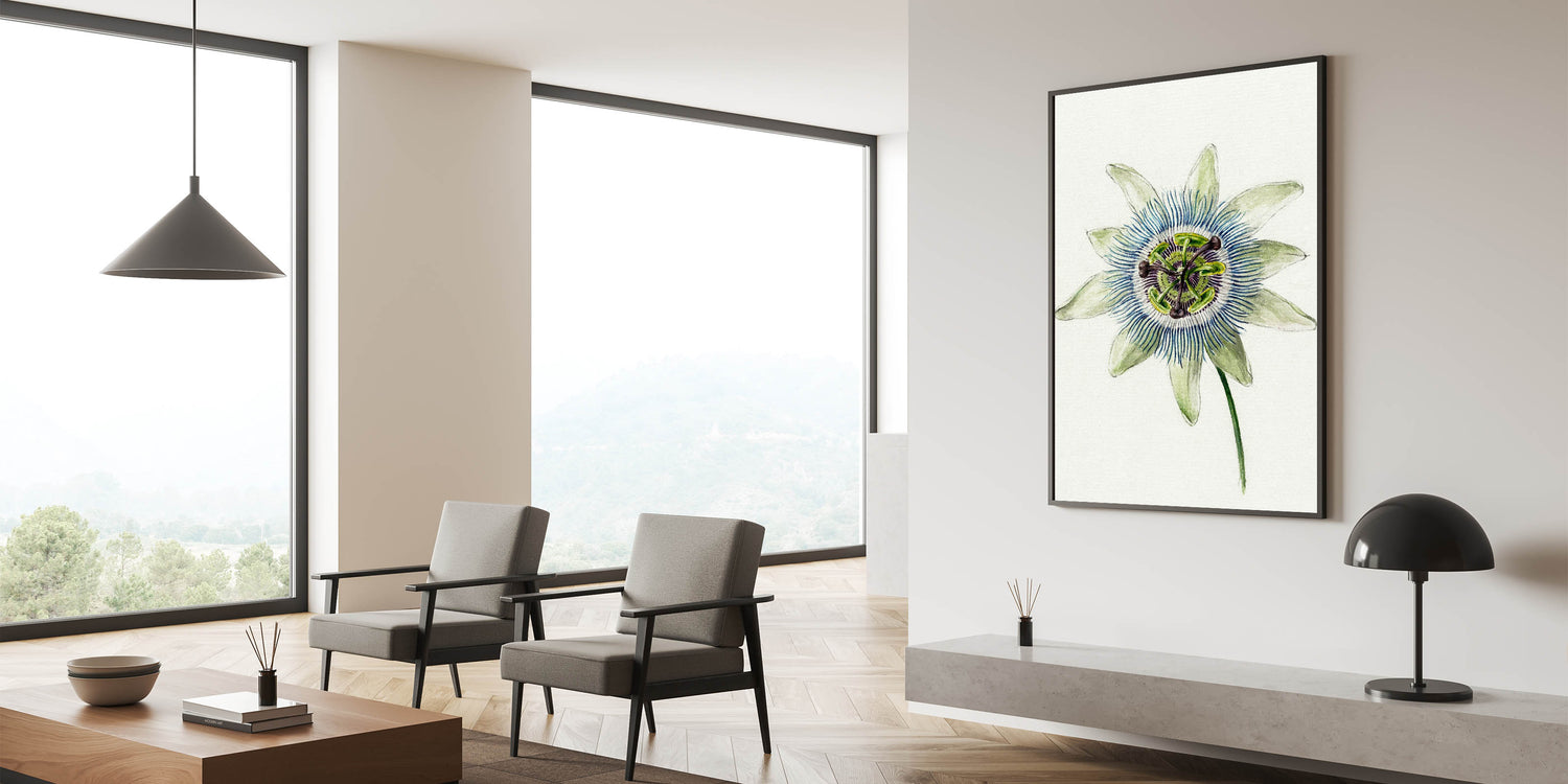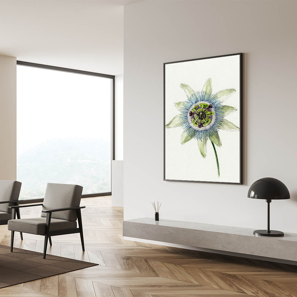 Add "Passion Flower" to your collection to elevate your decor with the delicate beauty of Romanticism style wall art. This piece serves as a centerpiece that exudes timeless charm and sophistication.