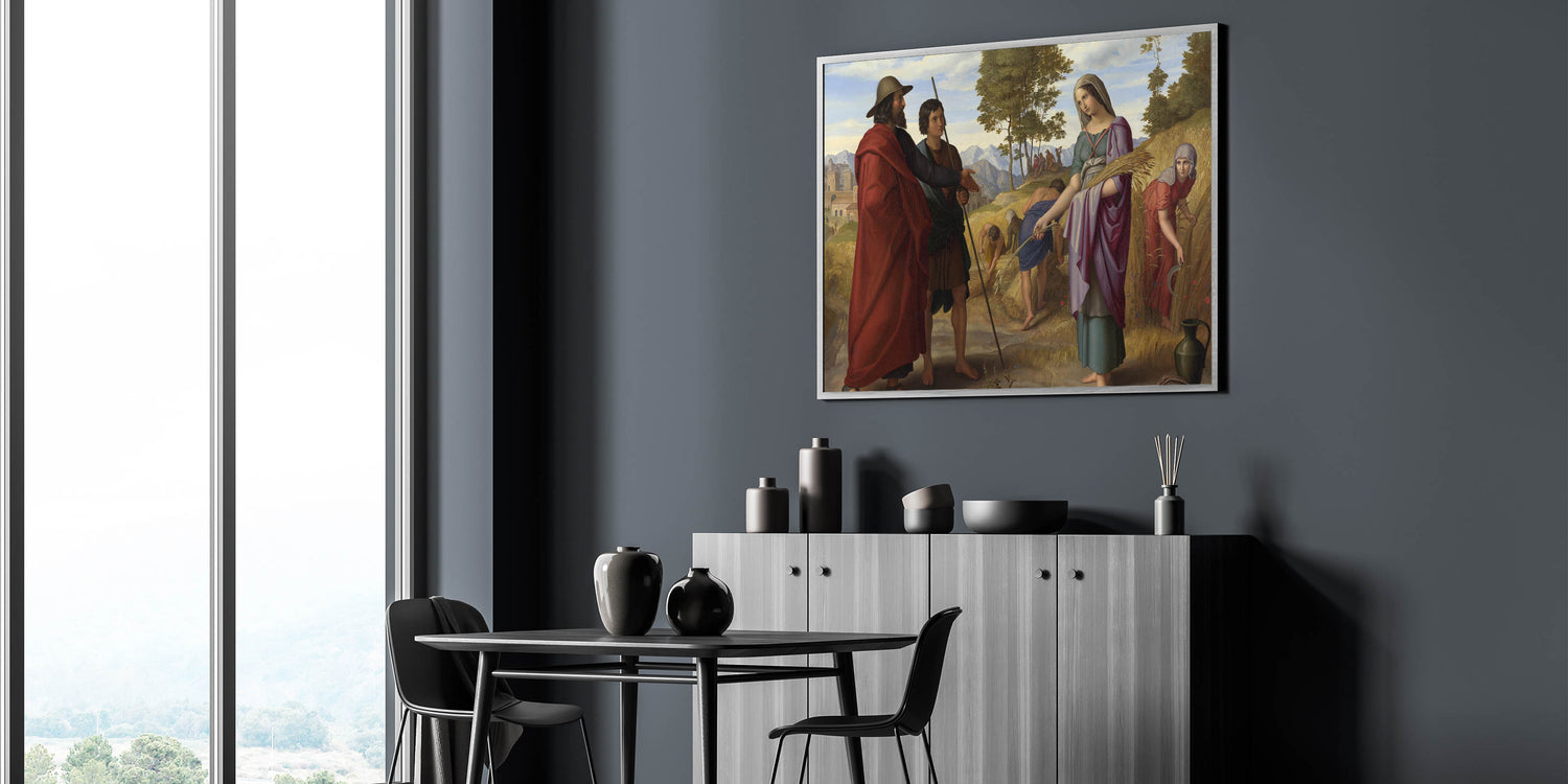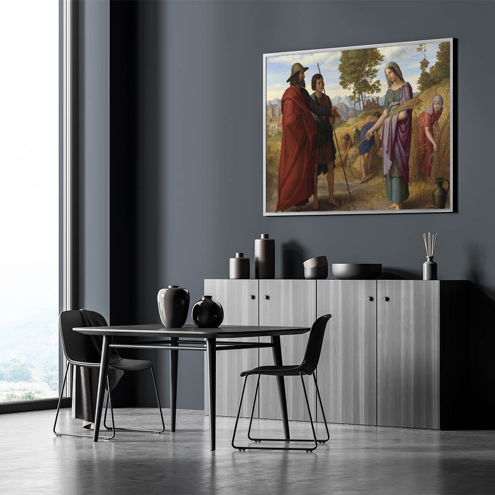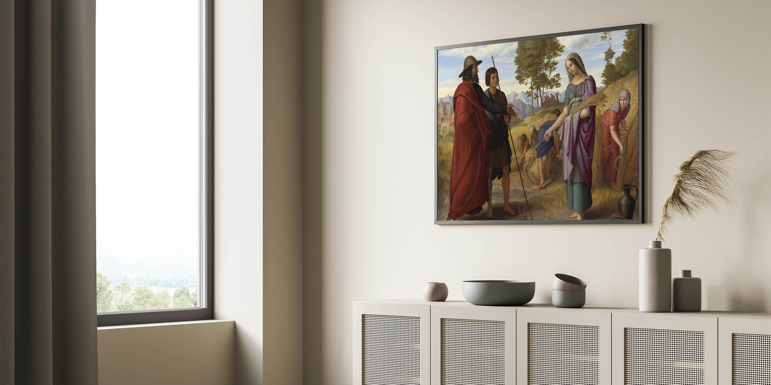 Celebrate the timeless elegance of Romanticism style wall art with Julius Schnorr von Carolsfeld's "Ruth in the Field of Boaz." This stunning masterpiece combines biblical storytelling with the Romantic era's signature emphasis on emotion and beauty. The vibrant composition depicts the iconic moment of Ruth gleaning in the fields, surrounded by golden wheat, lush greenery, and rolling mountains in the background. The interplay of light and color showcases the classic art of the Romantic era, making it a profound addition to any collection.