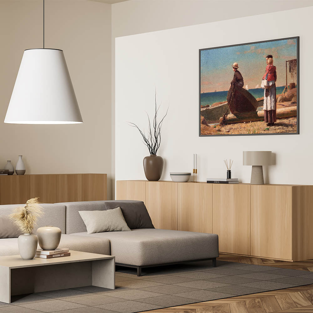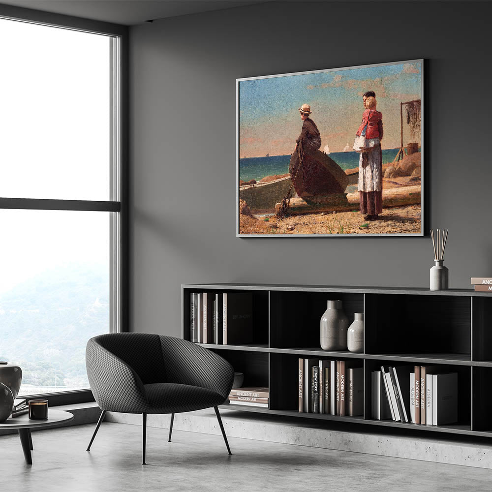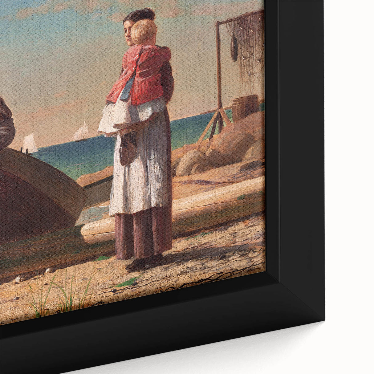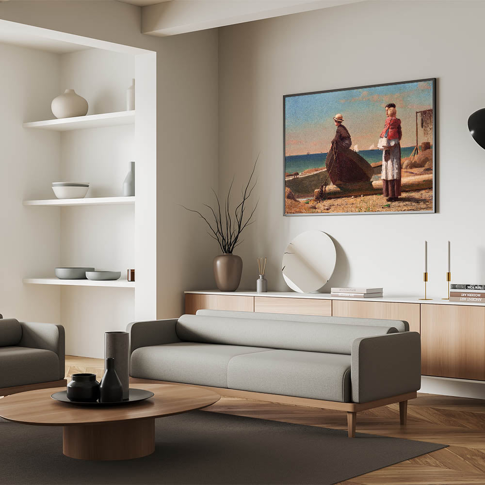 Capture the charm of seaside life with this stunning realism art print, depicting a serene coastal scene of a family awaiting the return of their loved one. With its warm, earthy tones and the glistening blue of the ocean, this classical realism canvas art brings an emotional and nostalgic atmosphere to any space. The intricate details of the figures, boats, and serene horizon make it a timeless piece of art.