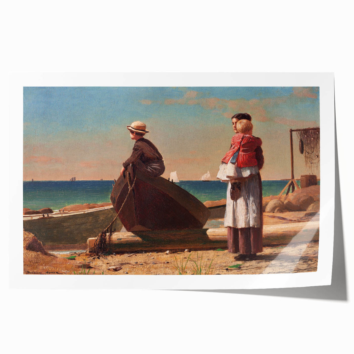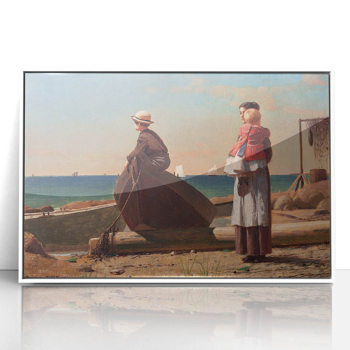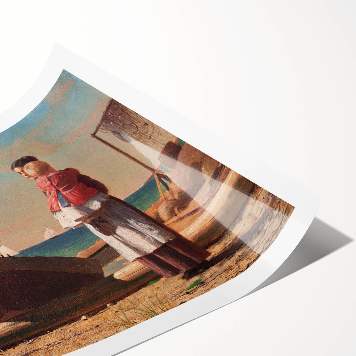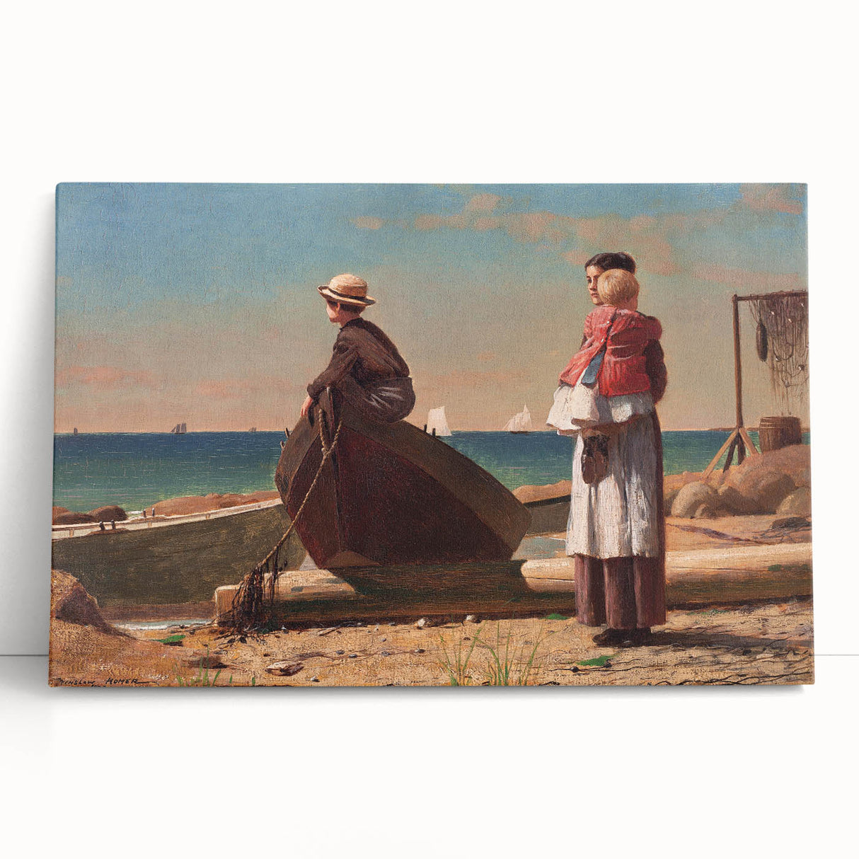Capture the charm of seaside life with this stunning realism art print, depicting a serene coastal scene of a family awaiting the return of their loved one. With its warm, earthy tones and the glistening blue of the ocean, this classical realism canvas art brings an emotional and nostalgic atmosphere to any space. The intricate details of the figures, boats, and serene horizon make it a timeless piece of art.