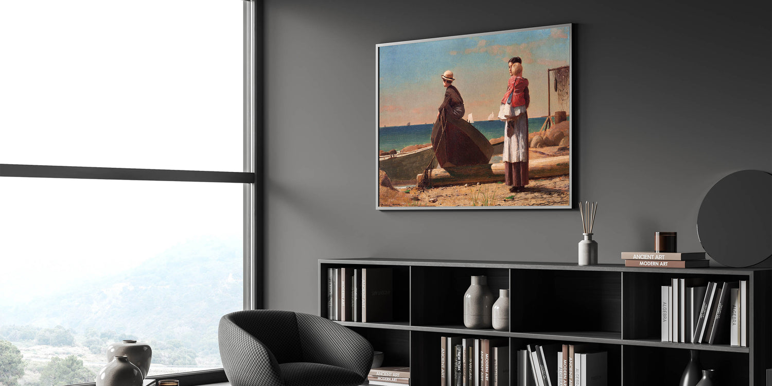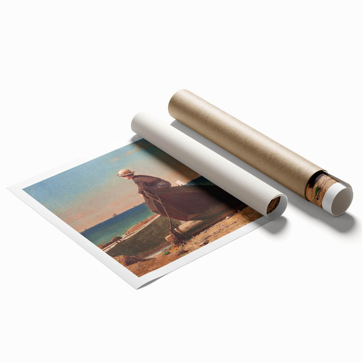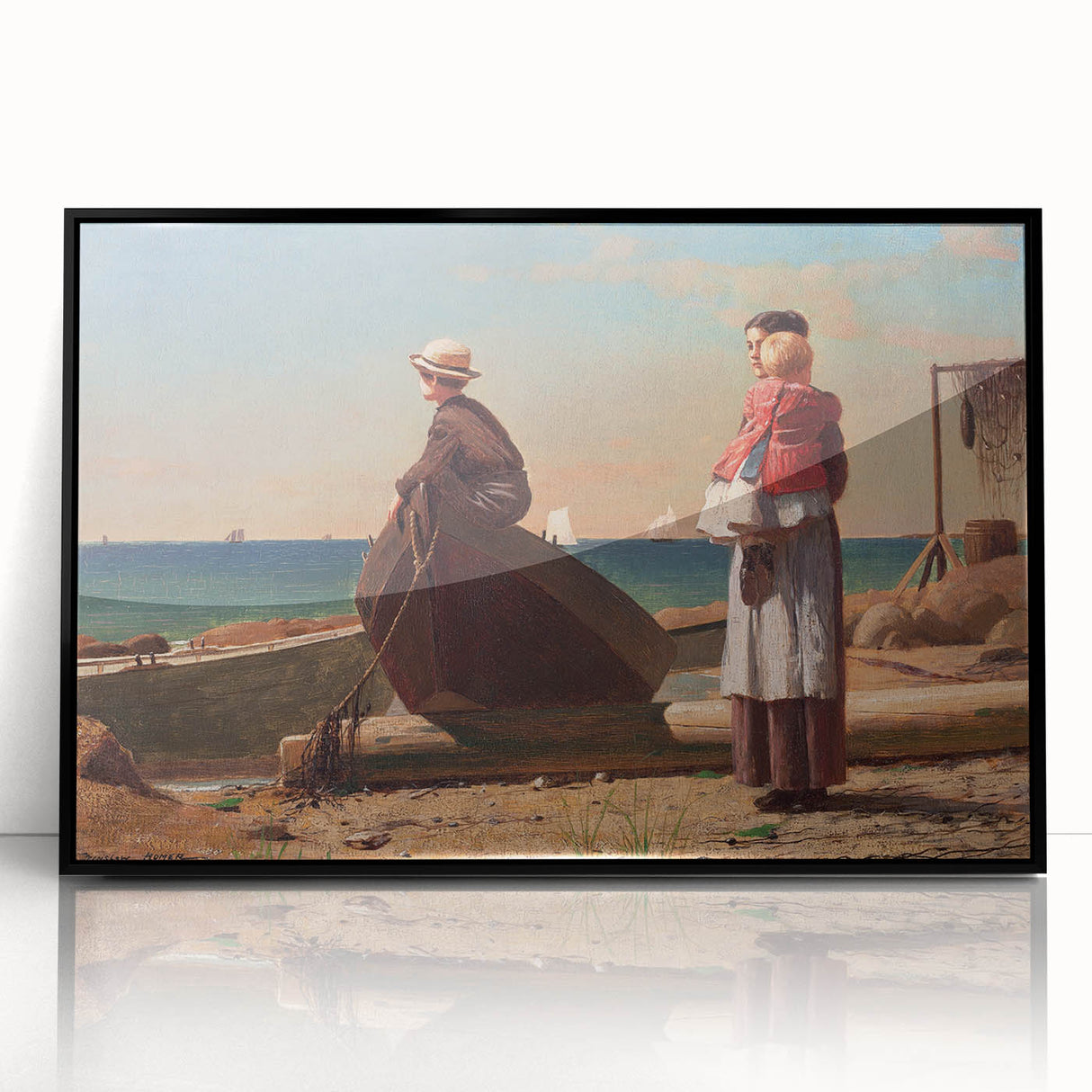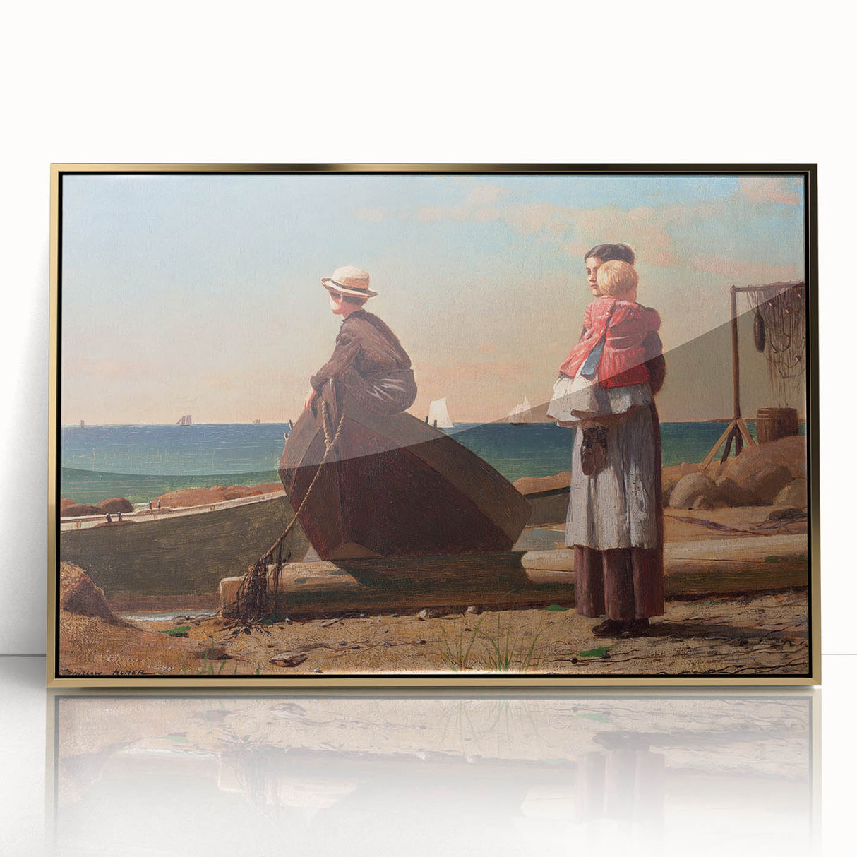 Capture the charm of seaside life with this stunning realism art print, depicting a serene coastal scene of a family awaiting the return of their loved one. With its warm, earthy tones and the glistening blue of the ocean, this classical realism canvas art brings an emotional and nostalgic atmosphere to any space. The intricate details of the figures, boats, and serene horizon make it a timeless piece of art.