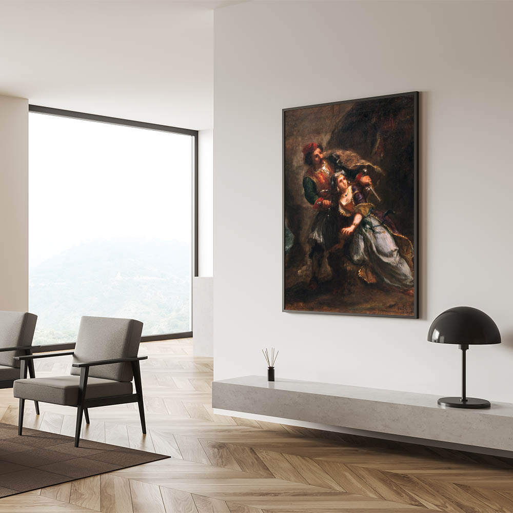 Dive into the dramatic intensity of Romanticism with "Selim and Zuleika", a masterpiece by Eugène Delacroix inspired by Lord Byron's poem The Bride of Abydos. This artwork beautifully conveys the emotional turmoil and passion of the characters, skillfully depicted through Delacroix’s signature use of dynamic brushstrokes, vivid colors, and intricate details.