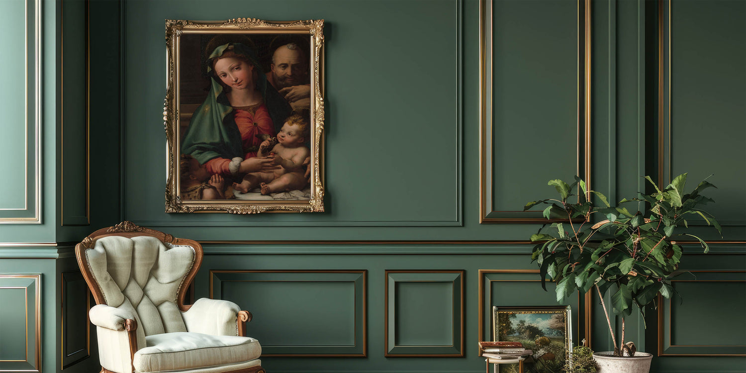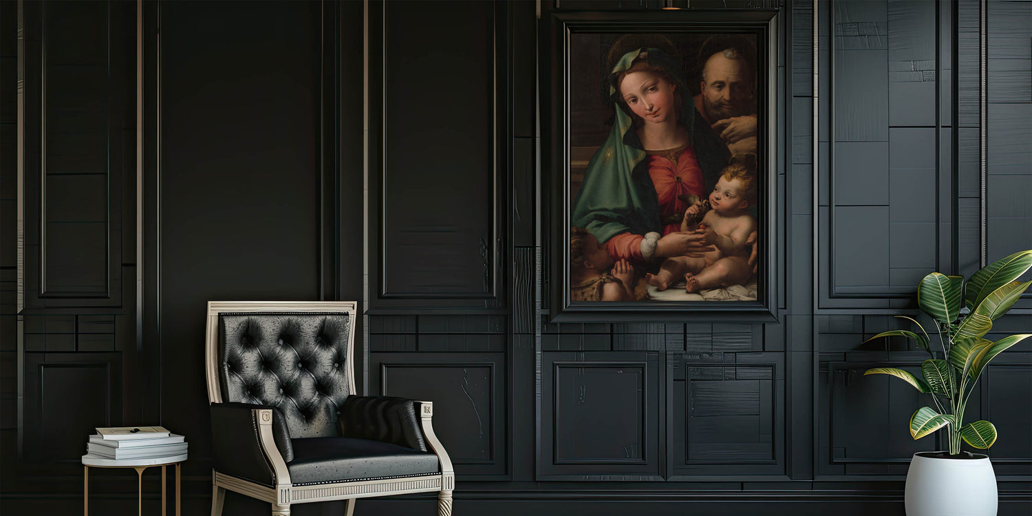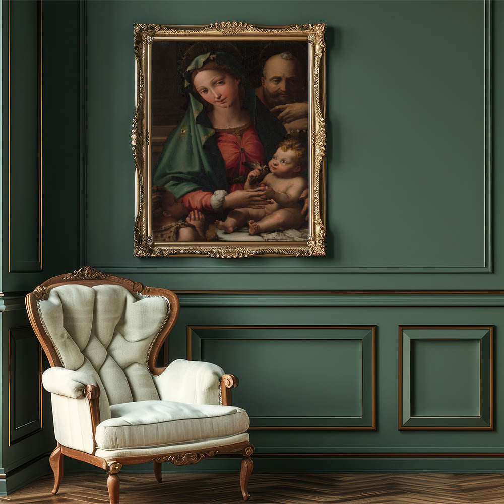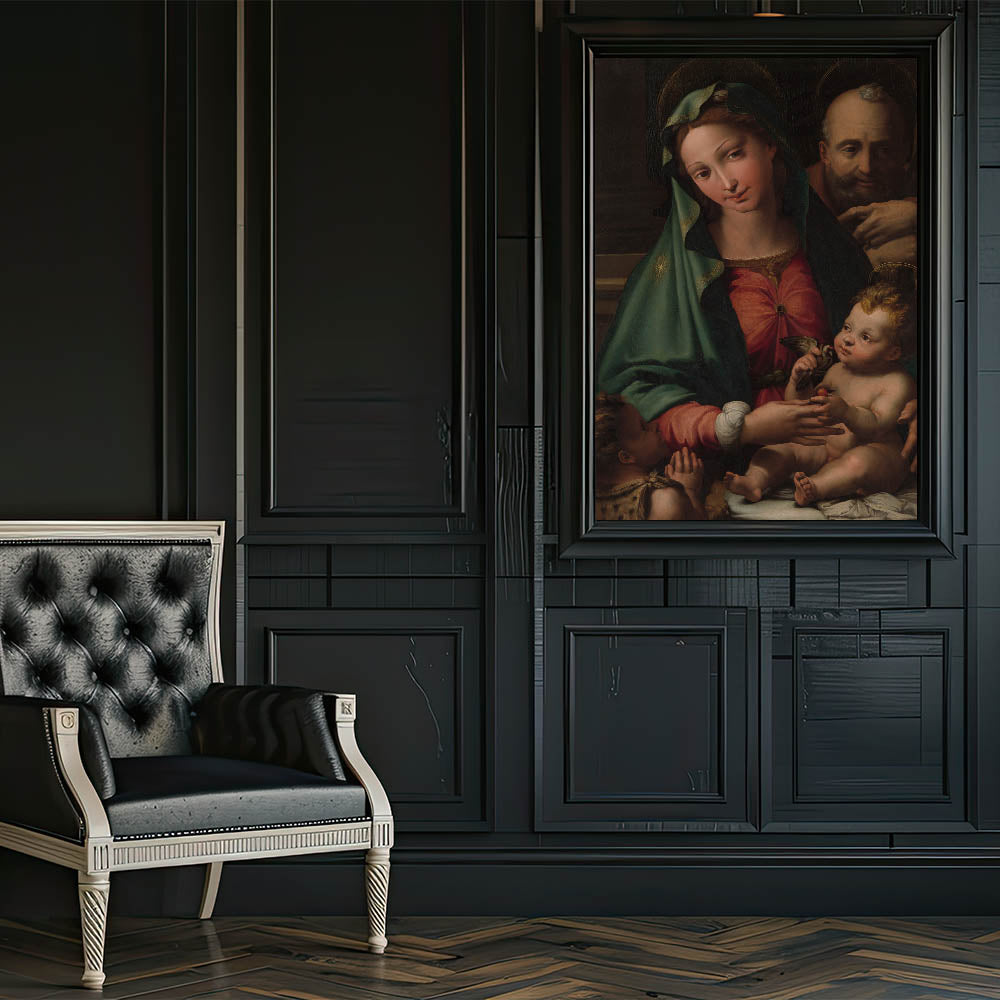 Bring home the warmth and beauty of the Renaissance with The Holy Family with the Infant Saint John the Baptist by Perino del Vaga. This exquisite masterpiece captures the Virgin Mary, Saint Joseph, the Christ Child, and Saint John in a tender and intimate moment. The artist’s exceptional use of light, vibrant colors, and fine detailing brings a sense of depth and emotion to the scene, making it a timeless piece of religious and artistic significance.