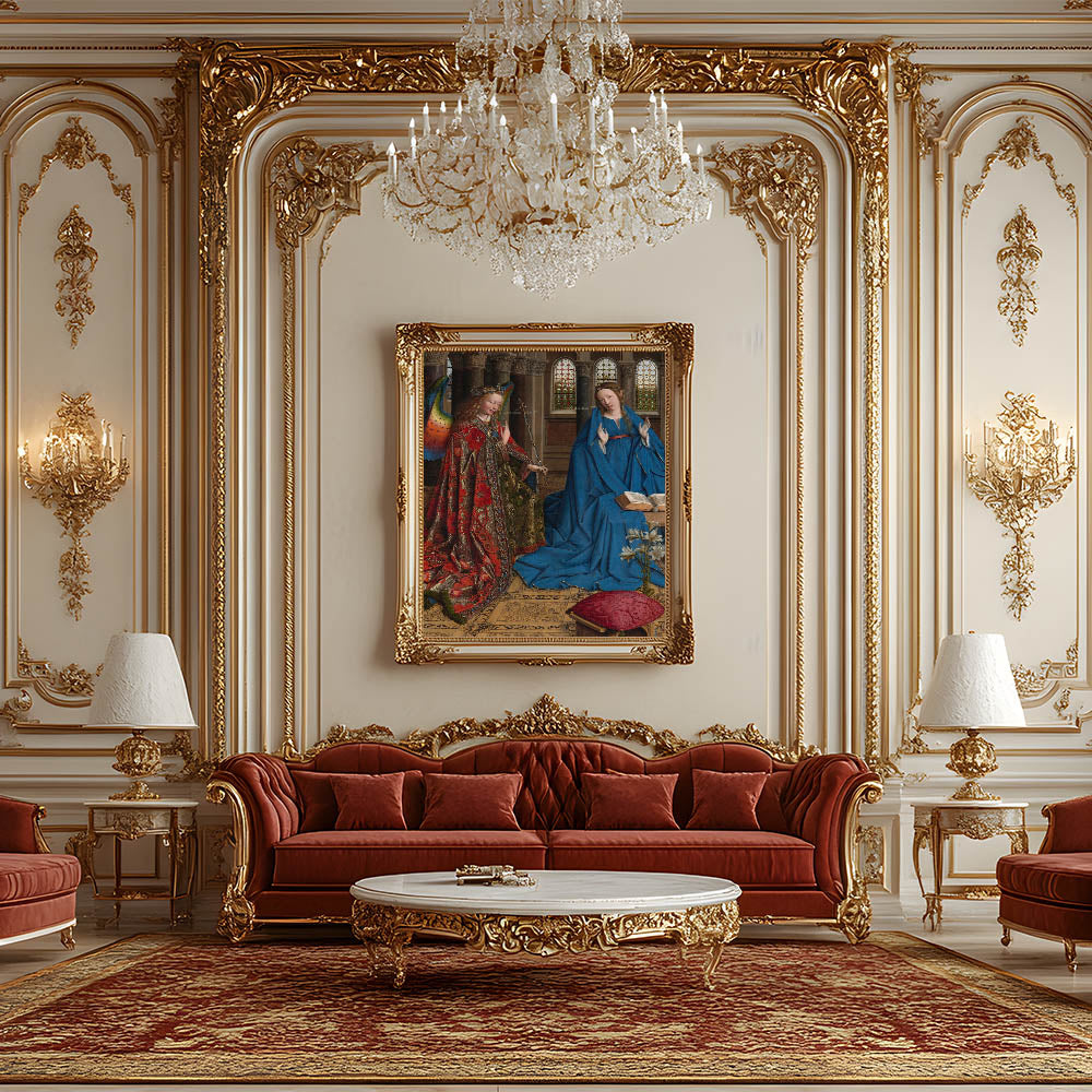 Immerse your space in the grandeur of Renaissance art with Jan van Eyck's The Annunciation. This breathtaking artwork, a hallmark of the Early Renaissance, exemplifies meticulous attention to detail and religious symbolism. Featuring the Archangel Gabriel and the Virgin Mary in a richly adorned interior, the piece radiates cultural and artistic brilliance.