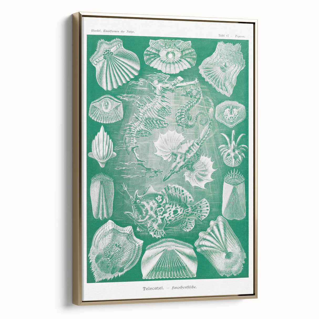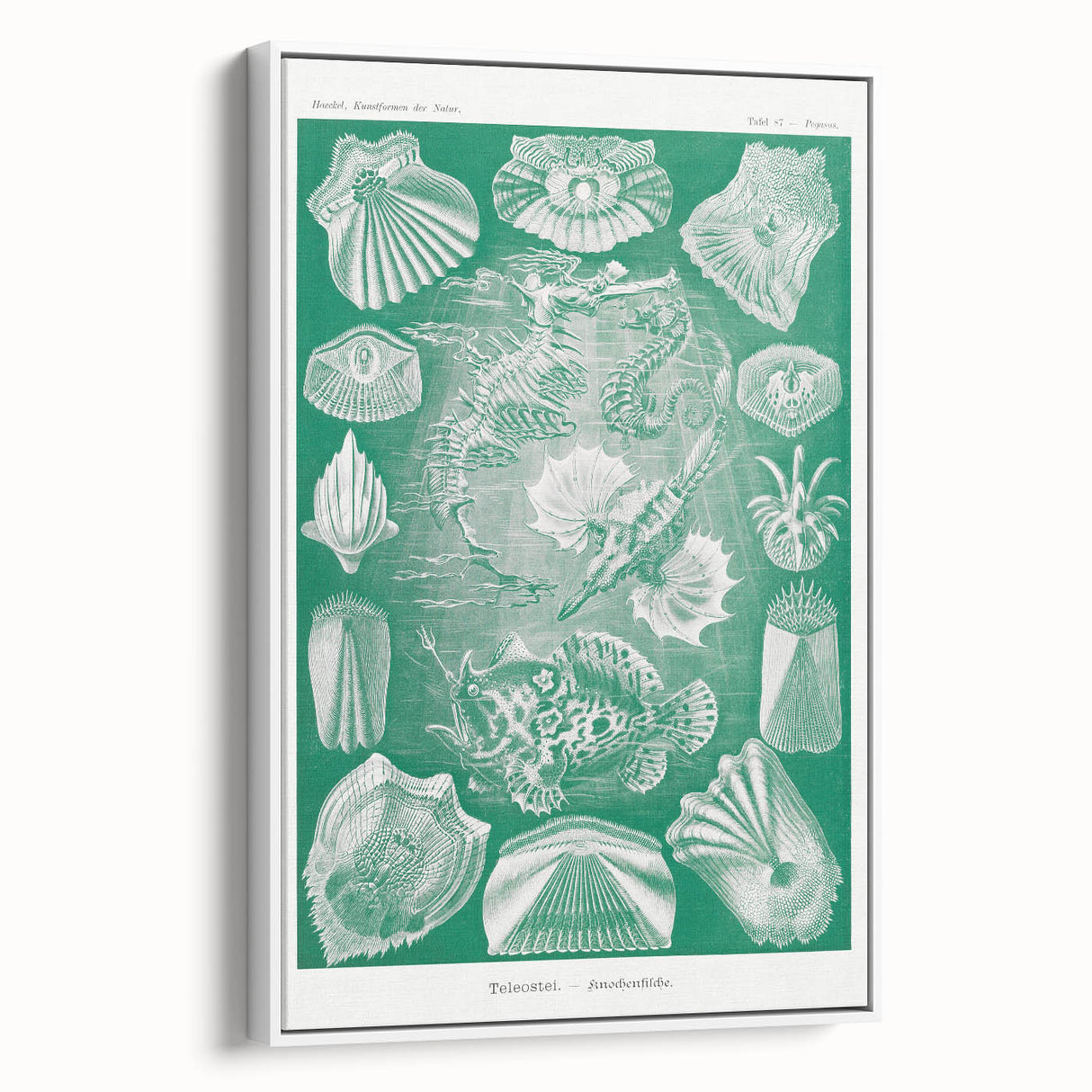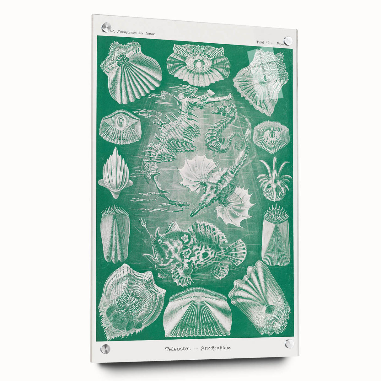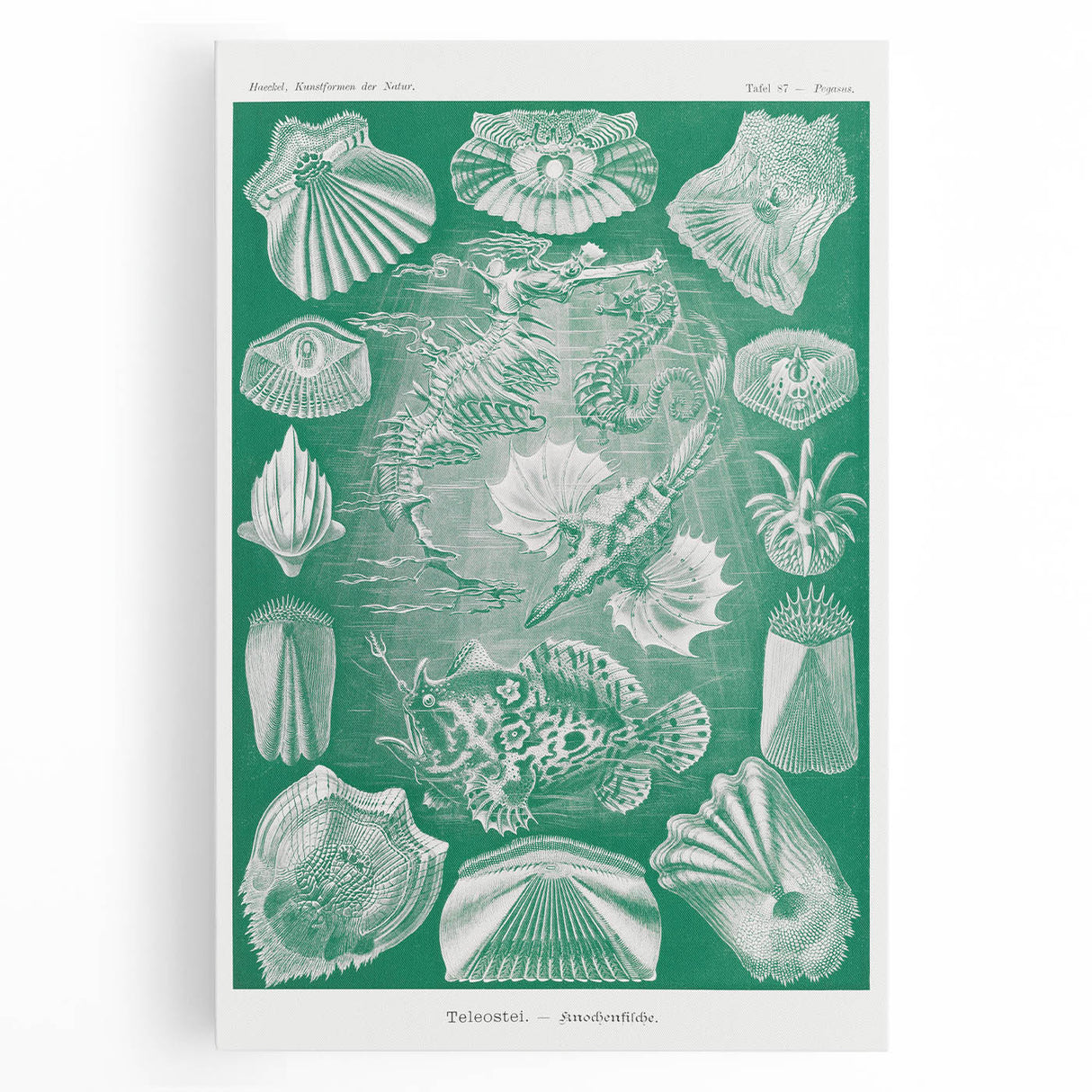 Dive into the world of scientific art with Modern Wall Art, featuring Teleostei – Knochenfische from Ernst Haeckel’s Kunstformen der Natur (1904). This intricate illustration showcases a variety of bony fish and marine creatures, blending artistic precision with scientific accuracy. The green and white palette enhances the details, creating a captivating visual experience for lovers of unique modern art and trendy home decor.