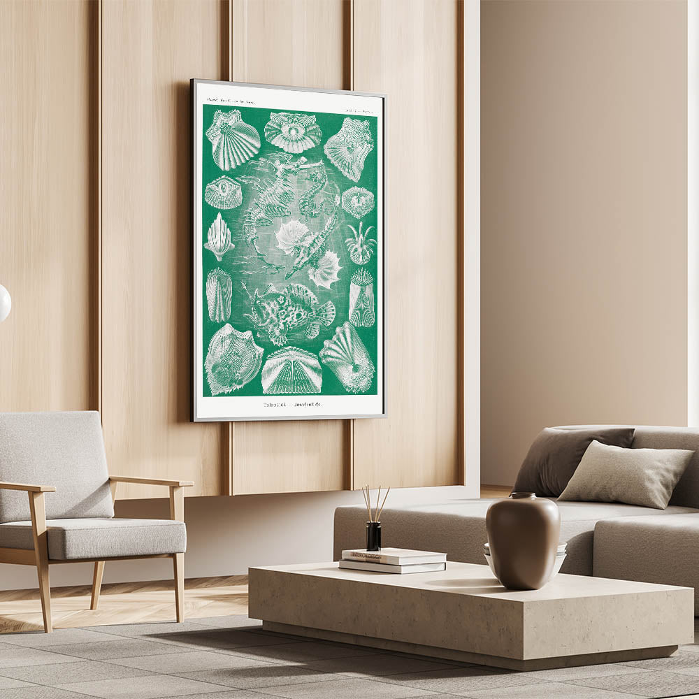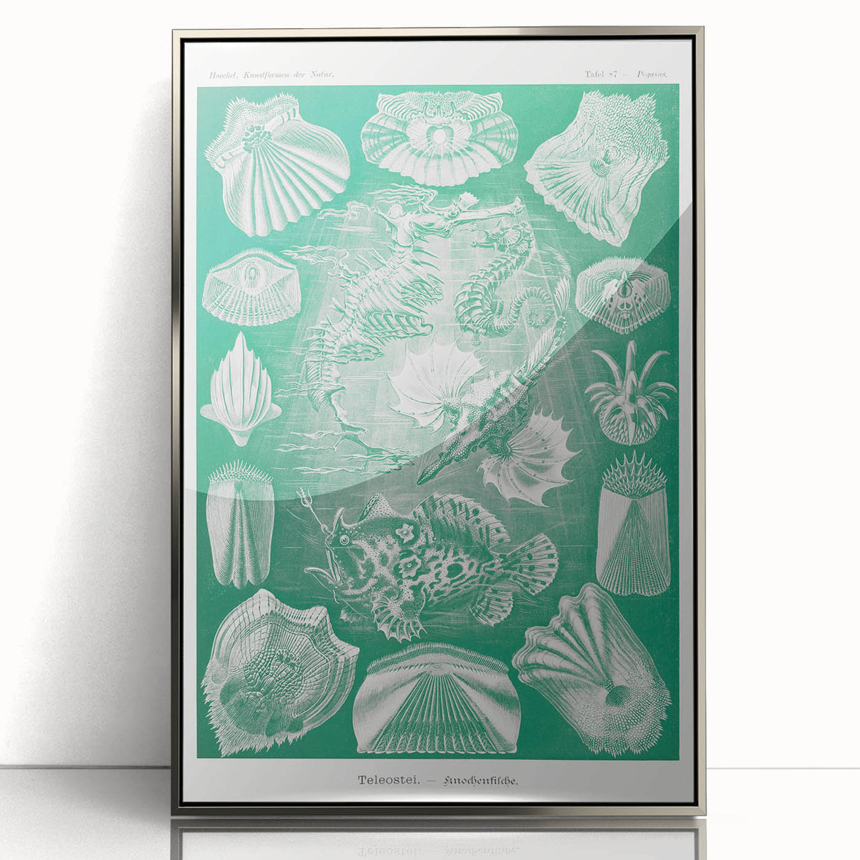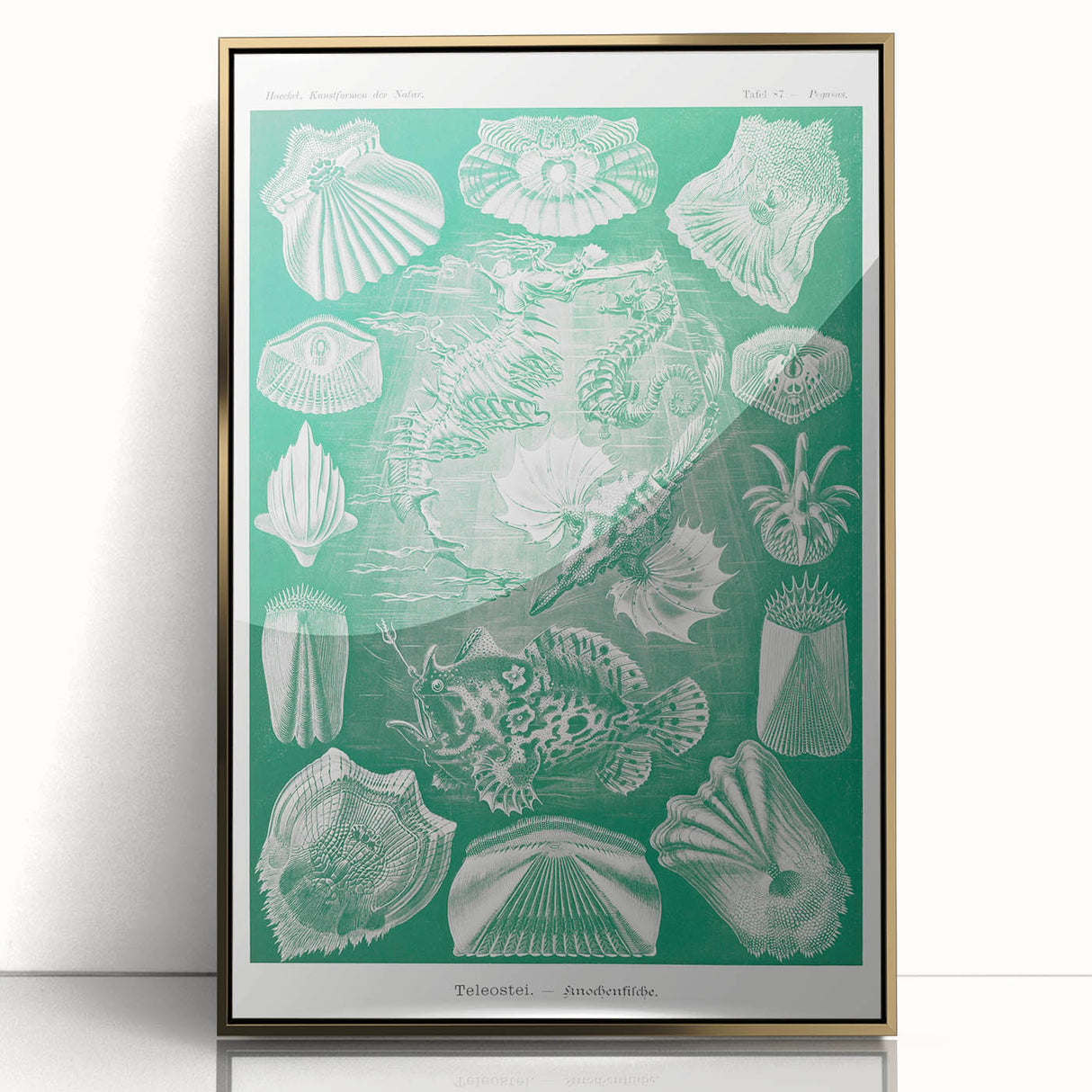 Dive into the world of scientific art with Modern Wall Art, featuring Teleostei – Knochenfische from Ernst Haeckel’s Kunstformen der Natur (1904). This intricate illustration showcases a variety of bony fish and marine creatures, blending artistic precision with scientific accuracy. The green and white palette enhances the details, creating a captivating visual experience for lovers of unique modern art and trendy home decor.