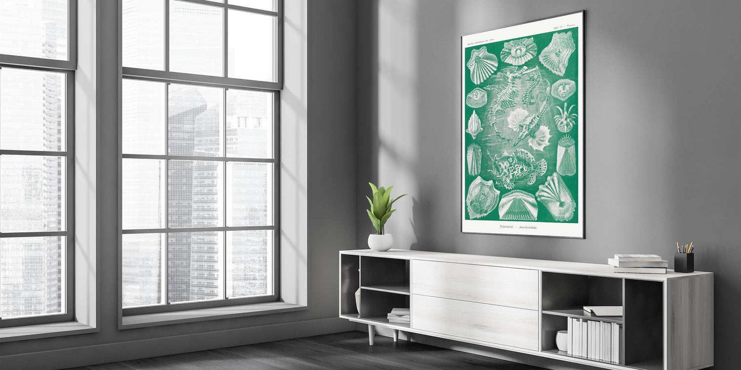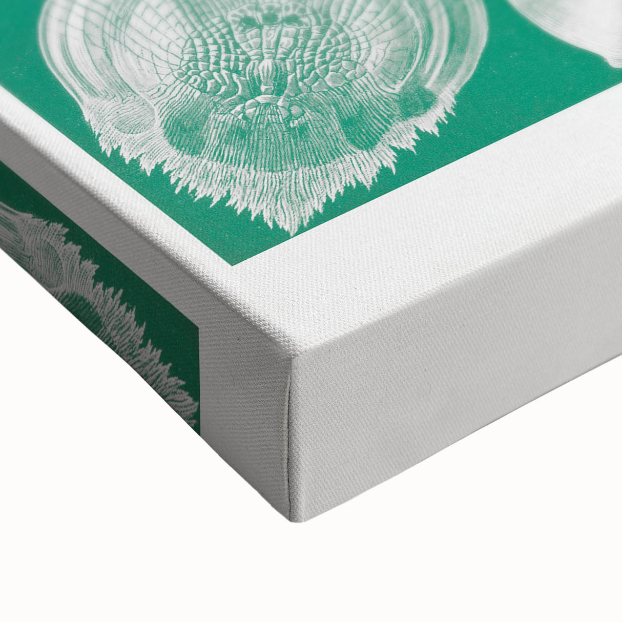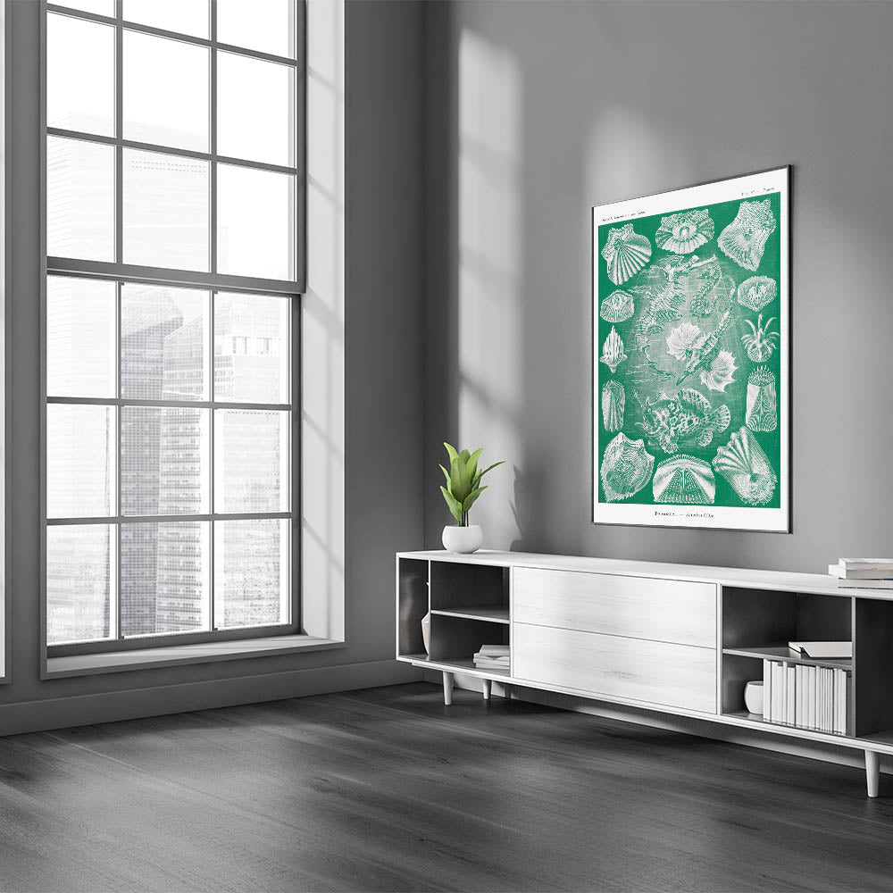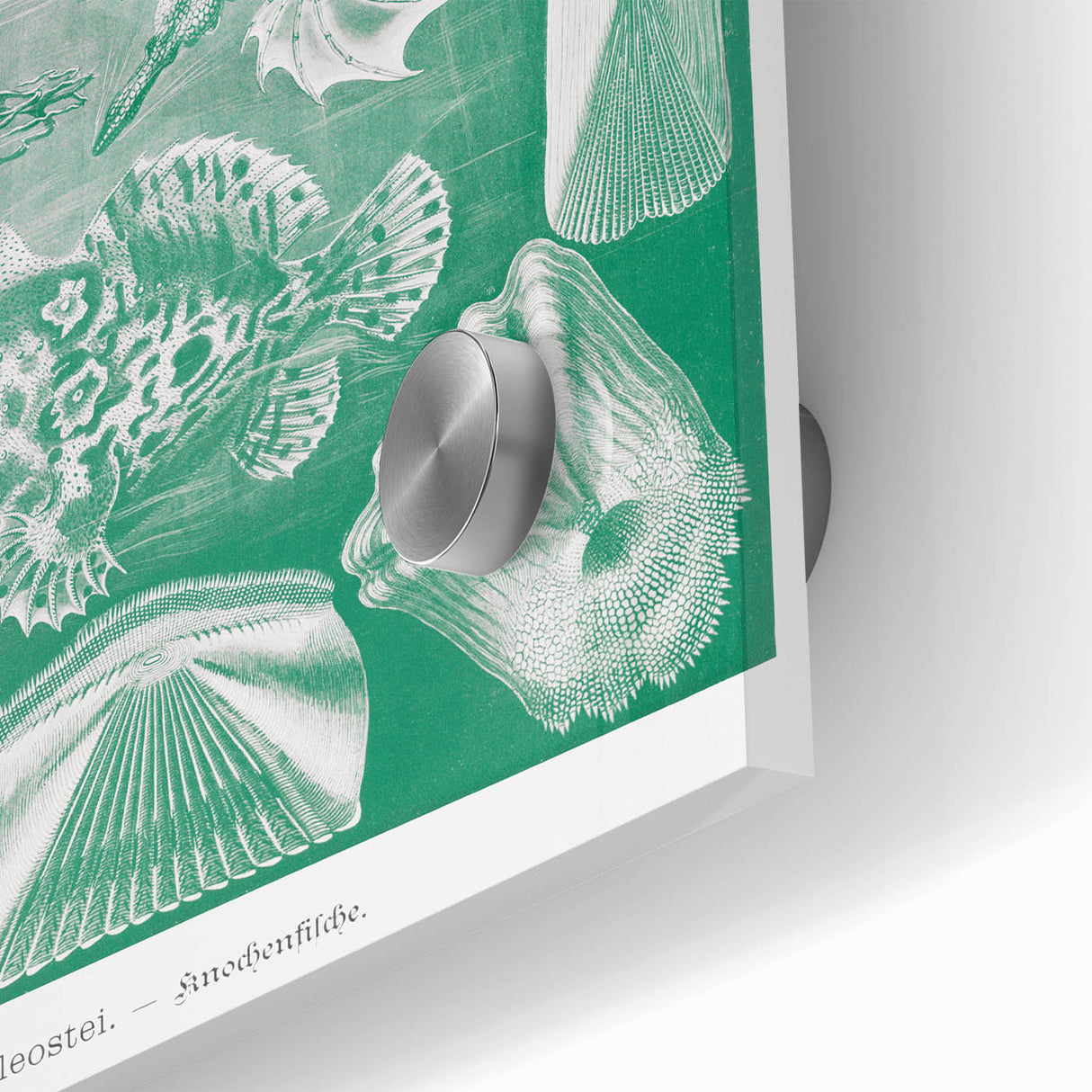 Dive into the world of scientific art with Modern Wall Art, featuring Teleostei – Knochenfische from Ernst Haeckel’s Kunstformen der Natur (1904). This intricate illustration showcases a variety of bony fish and marine creatures, blending artistic precision with scientific accuracy. The green and white palette enhances the details, creating a captivating visual experience for lovers of unique modern art and trendy home decor.