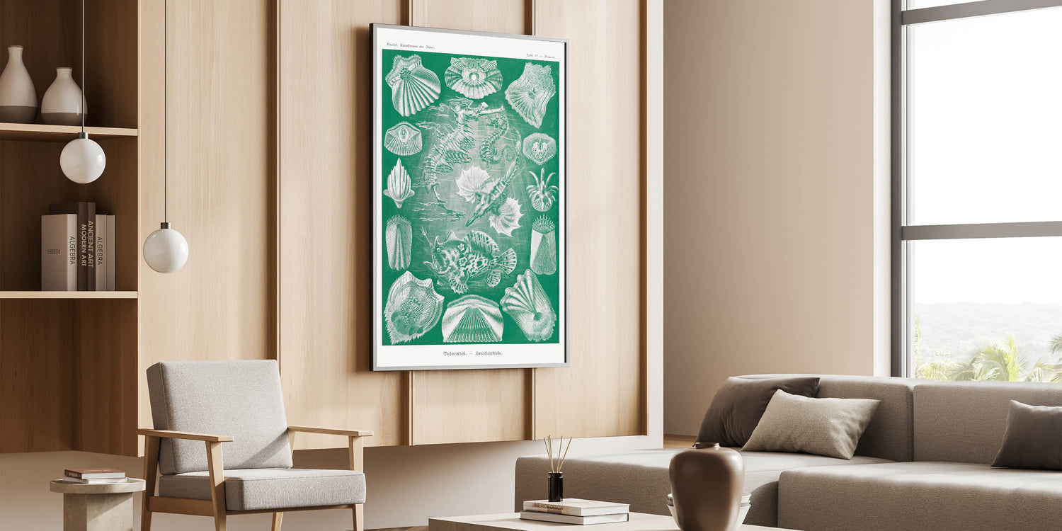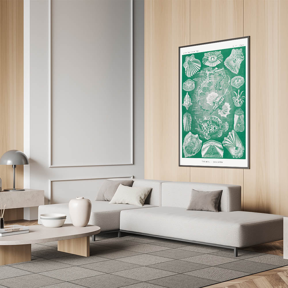 • Design: A stunning composition of marine life forms rendered with intricate detailing, perfect for lovers of scientific illustration and marine aesthetics.