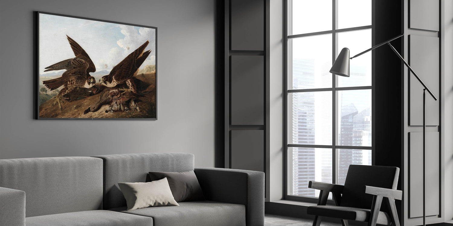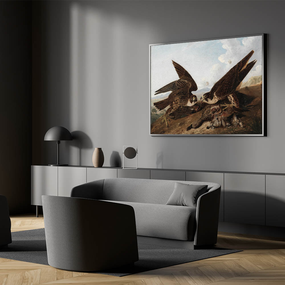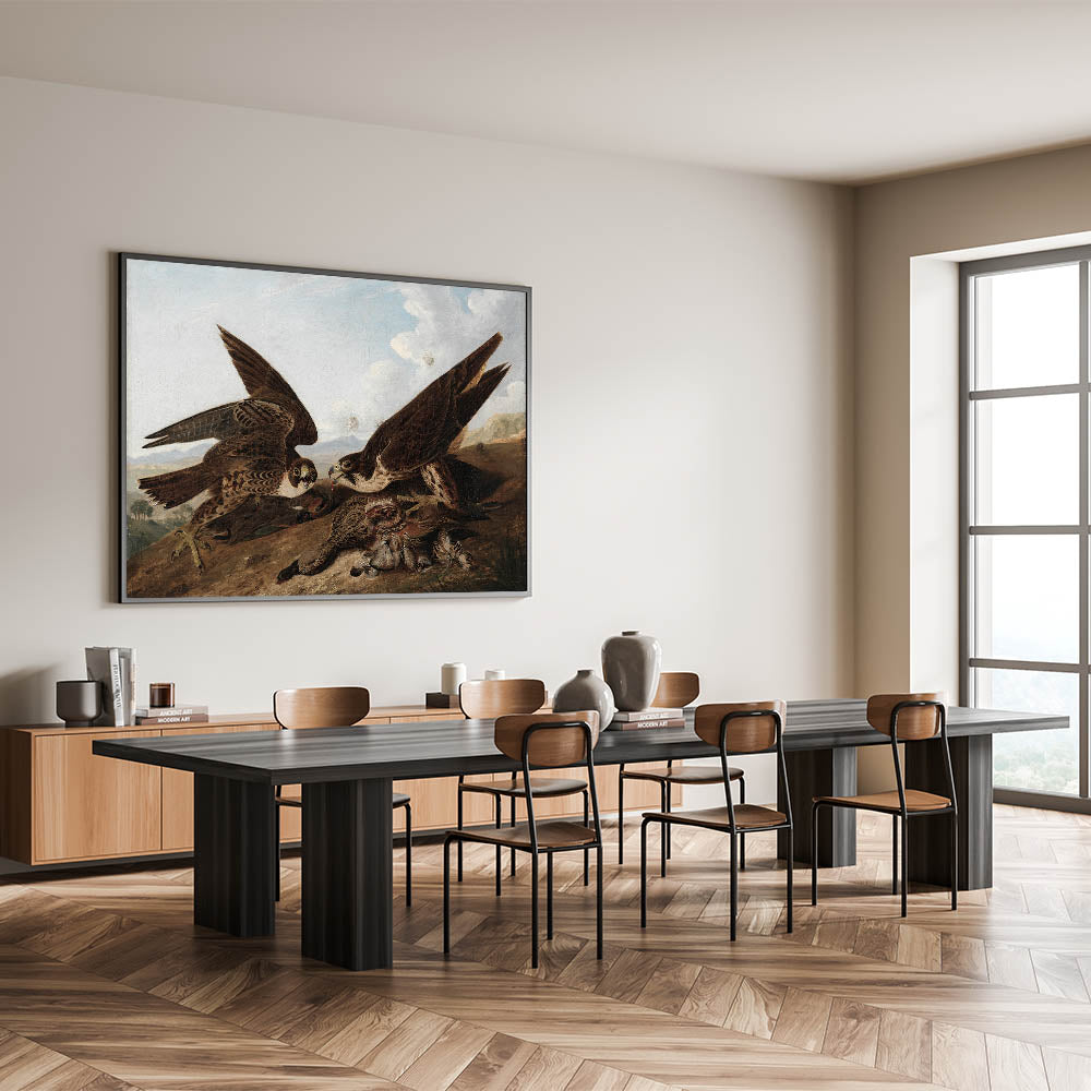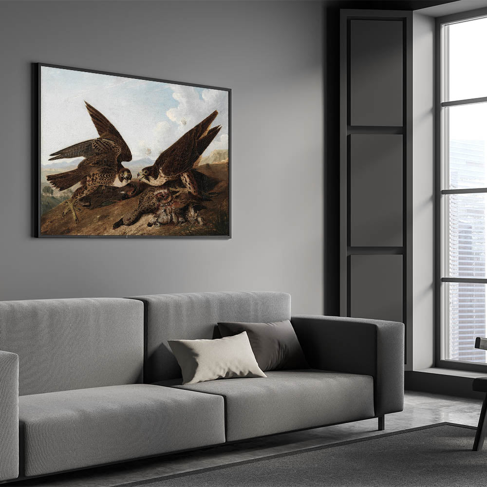 Celebrate the raw beauty of nature with Peregrine Falcons (Duck Hawks) by John James Audubon, an iconic Romantic-era masterpiece. This dramatic artwork depicts two peregrine falcons, also known as duck hawks, in the midst of a hunt, vividly capturing their fierce expressions and dynamic movements. Audubon’s meticulous attention to detail brings these majestic birds to life, with lifelike plumage and a striking natural setting.