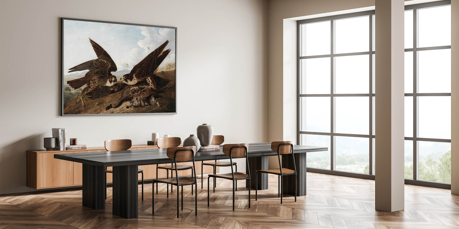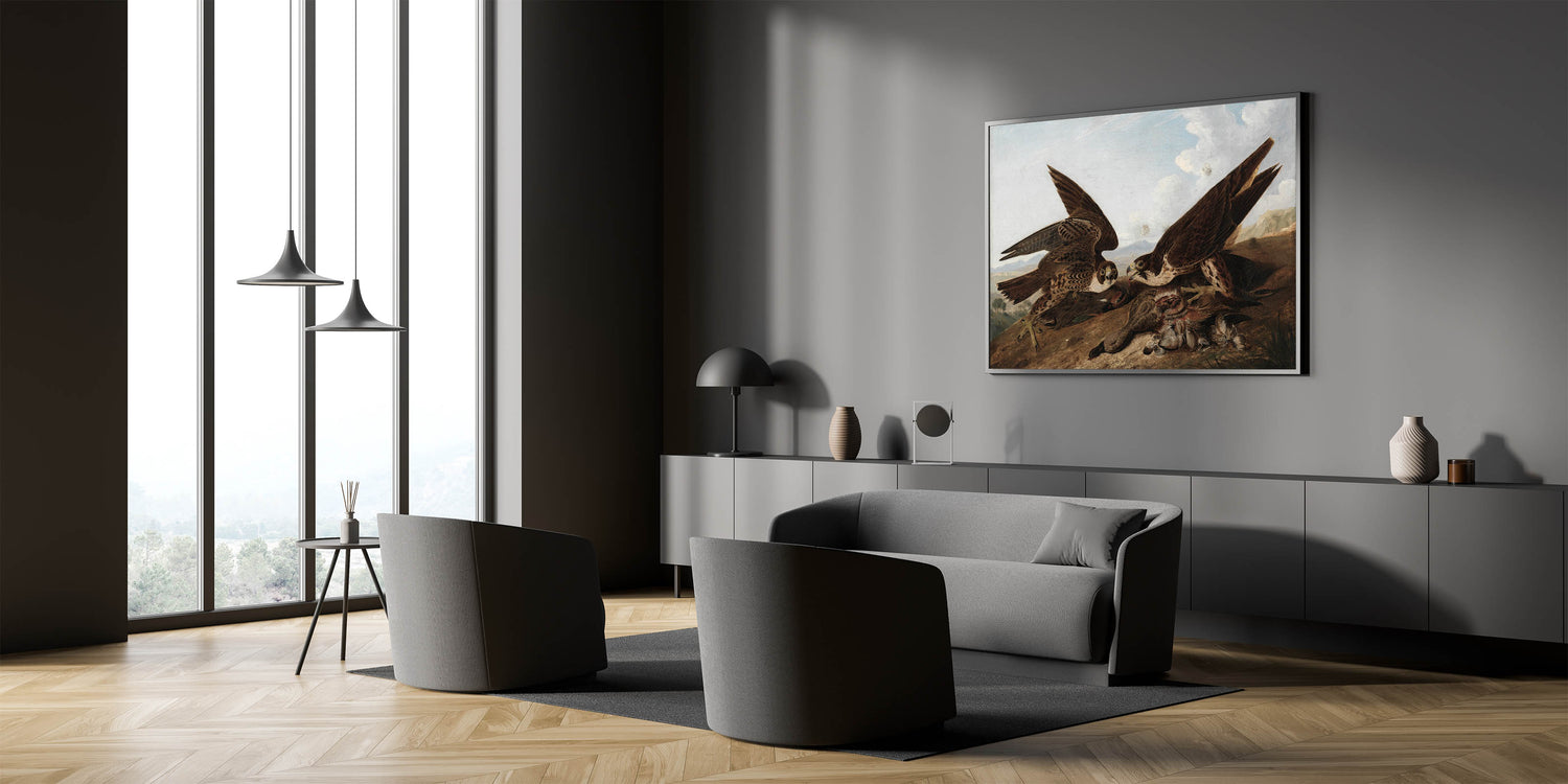 Bring the dramatic energy of Peregrine Falcons into your space, and let this striking artwork inspire and captivate.