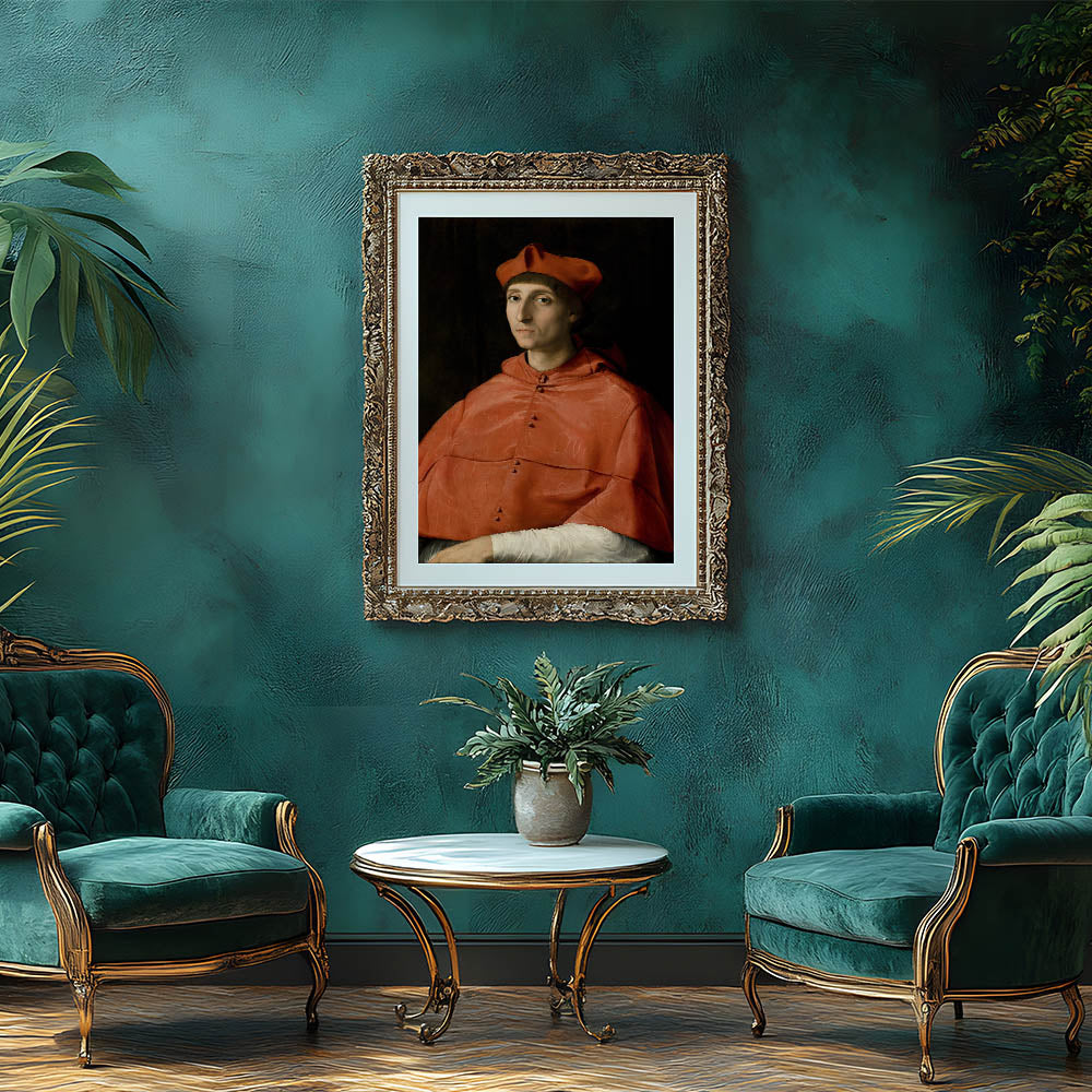 Celebrate the dignity and elegance of the Renaissance with Raphael’s Portrait of a Cardinal. This masterpiece captures the serene yet authoritative expression of the cardinal, reflecting Raphael’s mastery in portraiture and attention to fine details. The vibrant red of the cardinal’s robes contrasts beautifully against the subdued dark background, creating a striking visual that exudes power, piety, and refinement.