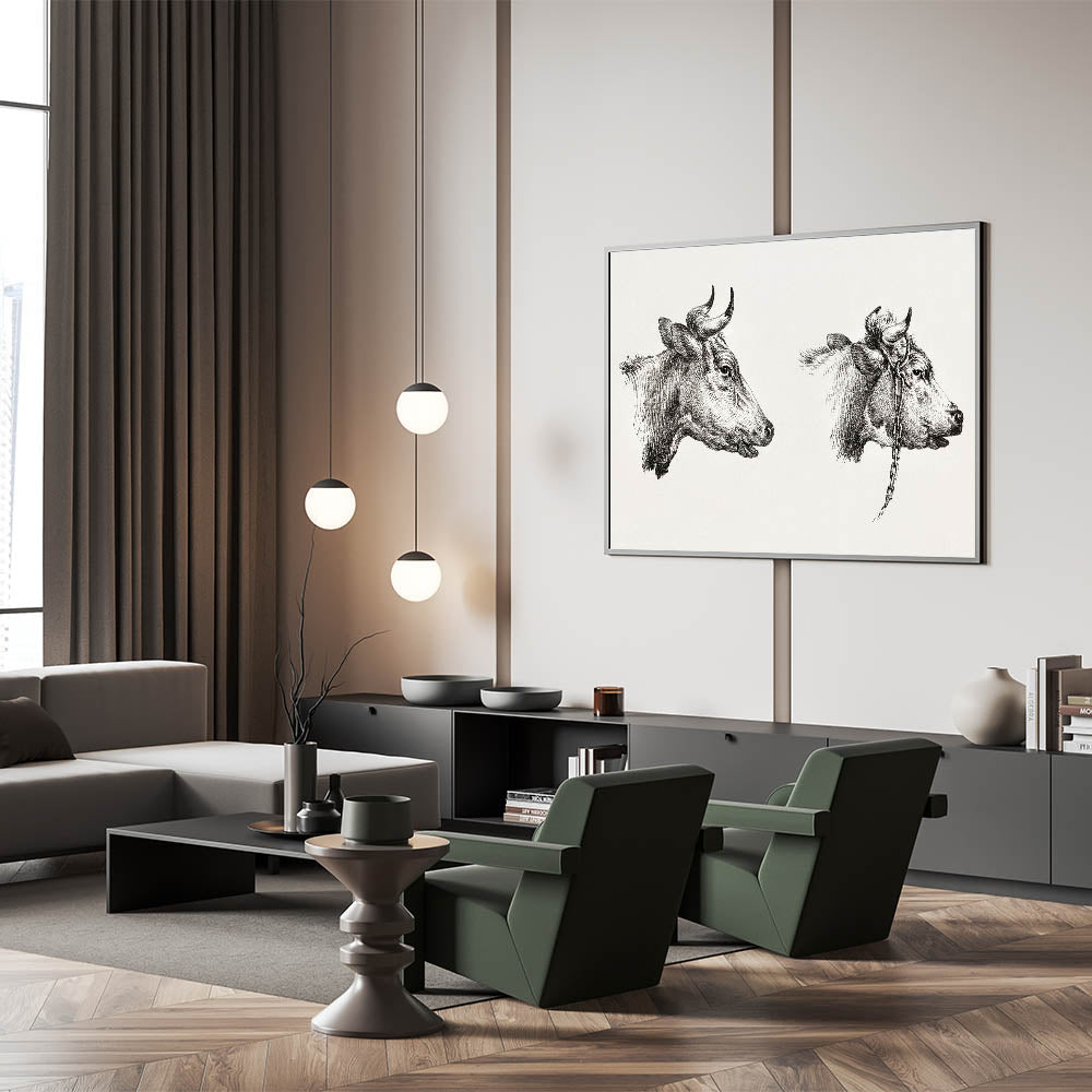 - Detailed Realistic Sketch: Captures the rugged texture and lifelike details of each bull’s head, emphasizing the artist’s skill in realistic representation.