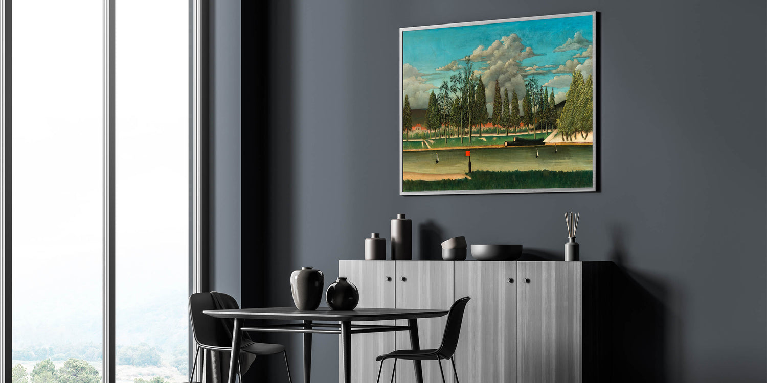 Embrace the tranquil beauty of nature with this realism art print, showcasing the serene landscape of Quai d'Asnières. Featuring lush green trees, a calm waterway, and vibrant skies, this artwork brings a peaceful charm to your interior spaces. The precise detailing and vivid colors highlight the harmony between natural and urban settings, making this classical realism canvas art a timeless addition to any home or office.