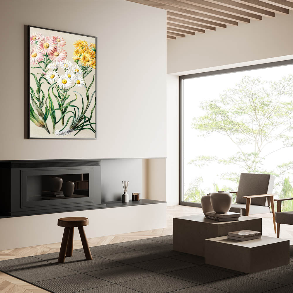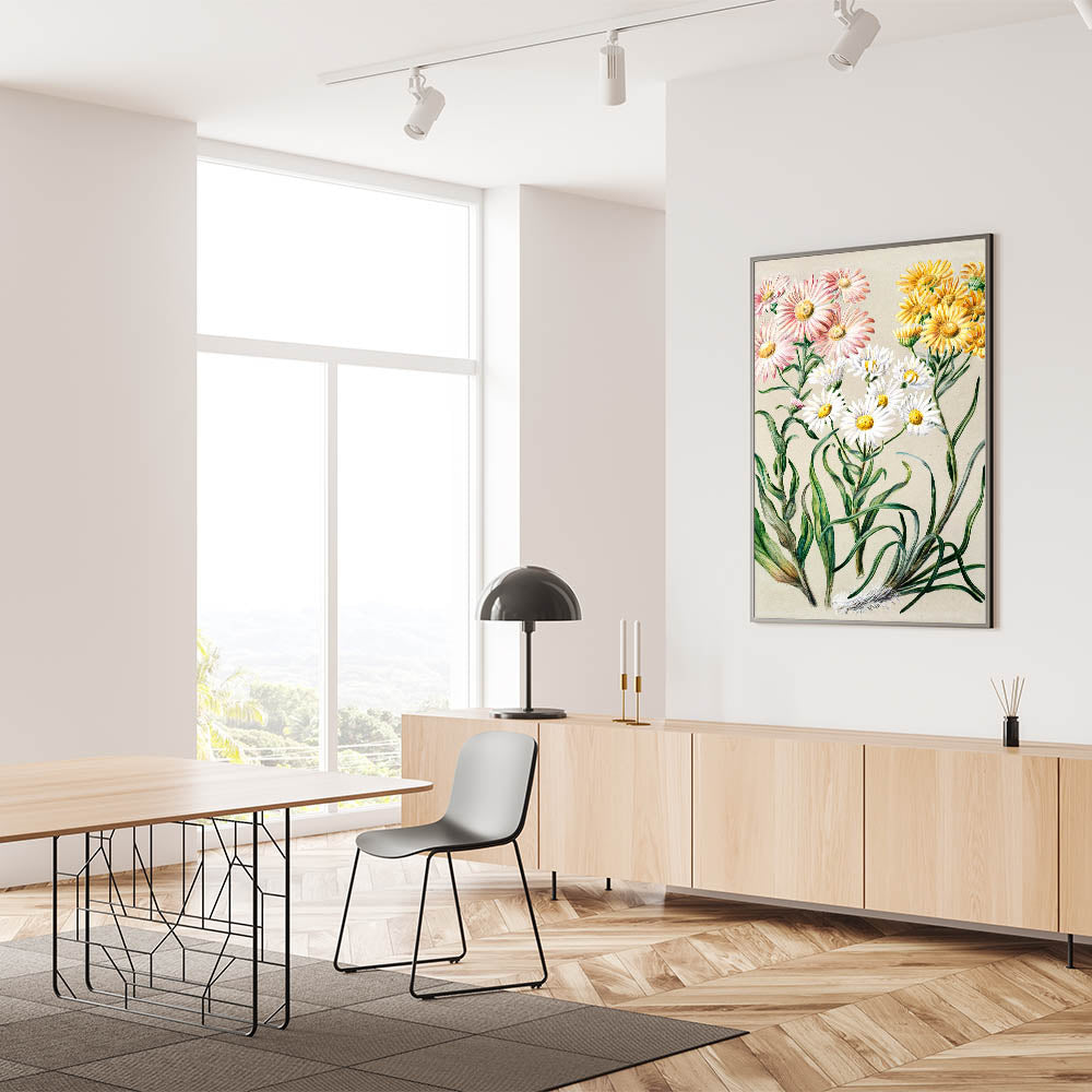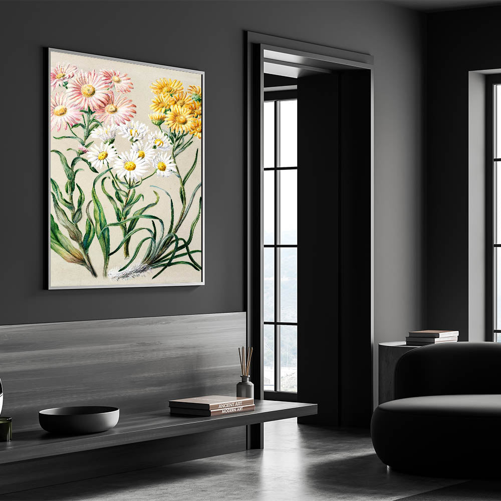 Enhance your space with this captivating Realism art print, featuring delicate flowers meticulously illustrated in soft hues of pink, yellow, and white. This piece is a beautiful example of fine art realism, showcasing the elegance and detail of classical realism painting. Ideal for those seeking a refined touch to their living spaces, this artwork is available in various materials to suit any decor style.