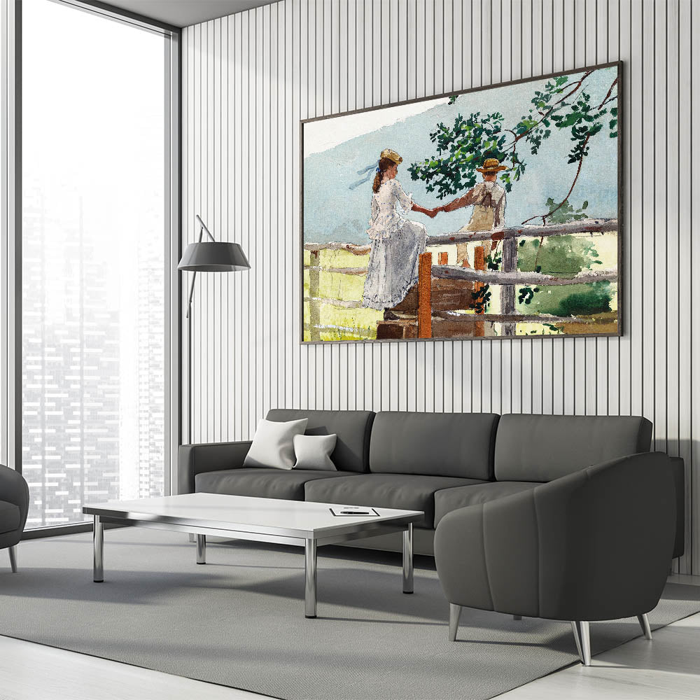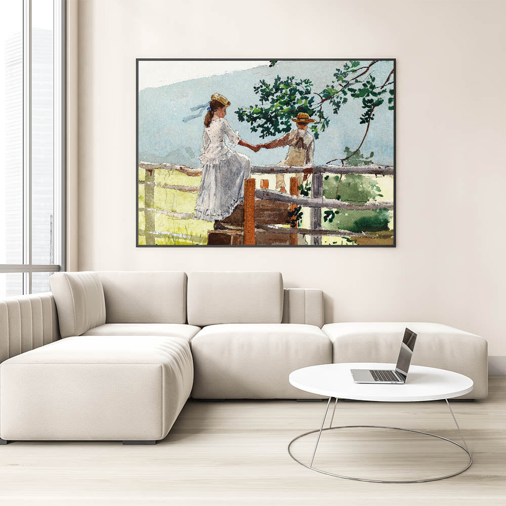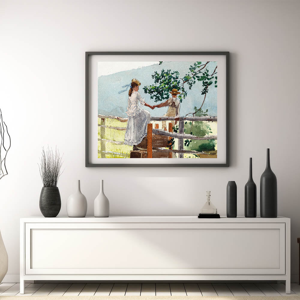 Bring a touch of nostalgia to your decor with this beautifully crafted Realism art print. Featuring two children sharing a quiet moment on a fence stile, this piece captures the innocence and simplicity of childhood in a serene countryside setting. With delicate brushwork and a soft color palette, this artwork is a timeless addition to any room, perfect for those who appreciate classical realism.