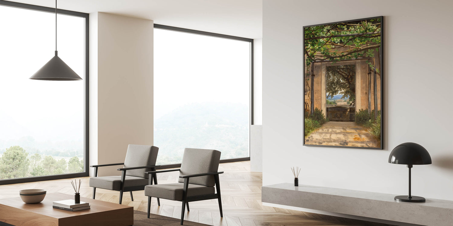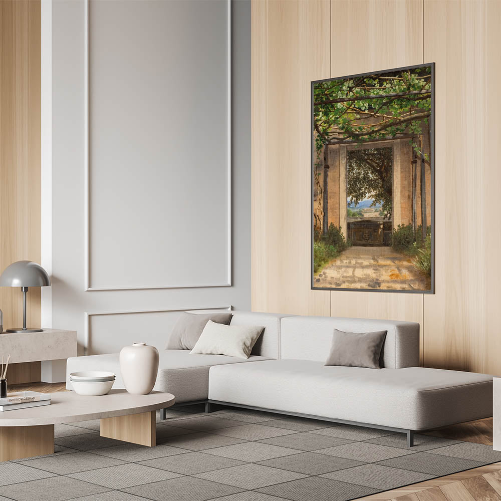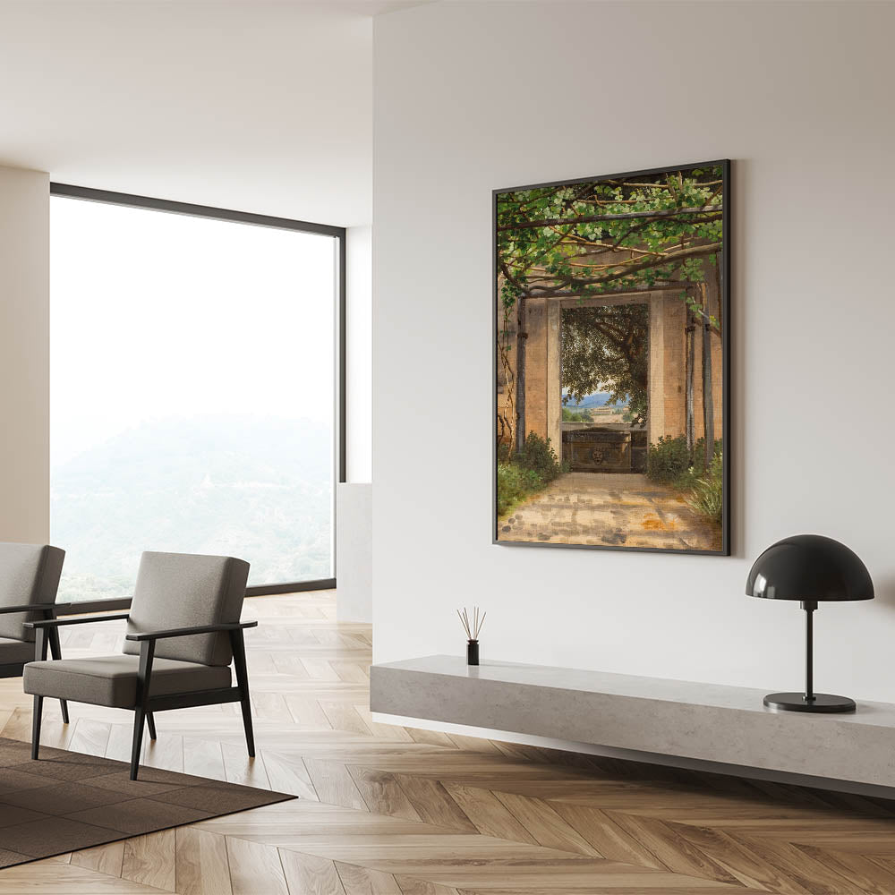 Invite the tranquility of a lush garden into your home with "Verdant View," an exquisite Realism art print by C.W. Eckersberg. This piece captures a shaded archway framed by climbing vines, opening to a serene vista of distant trees and hills. Eckersberg’s attention to detail brings the stone textures, greenery, and dappled sunlight to life, creating a peaceful and inviting scene.