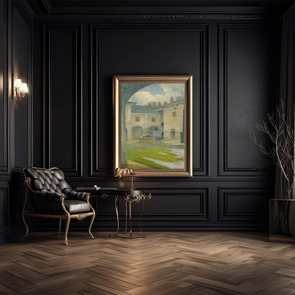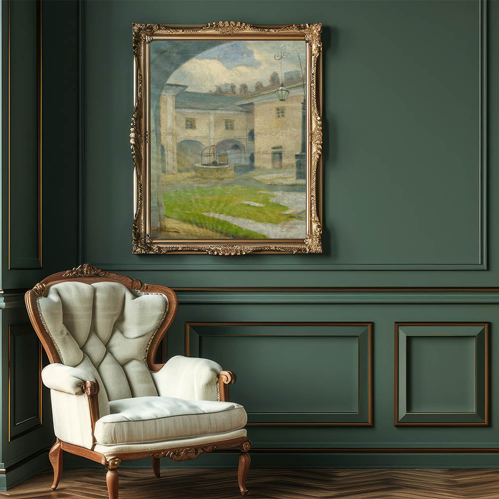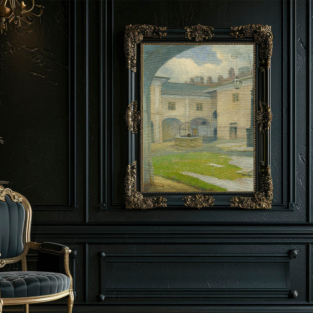 Capture the quiet charm of Renaissance architecture with "The Courtyard of the Renaissance Mansion in Strážky" by Lajos Csordák. This painting beautifully illustrates a serene courtyard bathed in soft, natural light, featuring arched windows, a central well, and intricate architectural details. The muted tones and delicate brushstrokes evoke a sense of nostalgia and tranquility, making it a perfect choice for classic Renaissance decor enthusiasts.