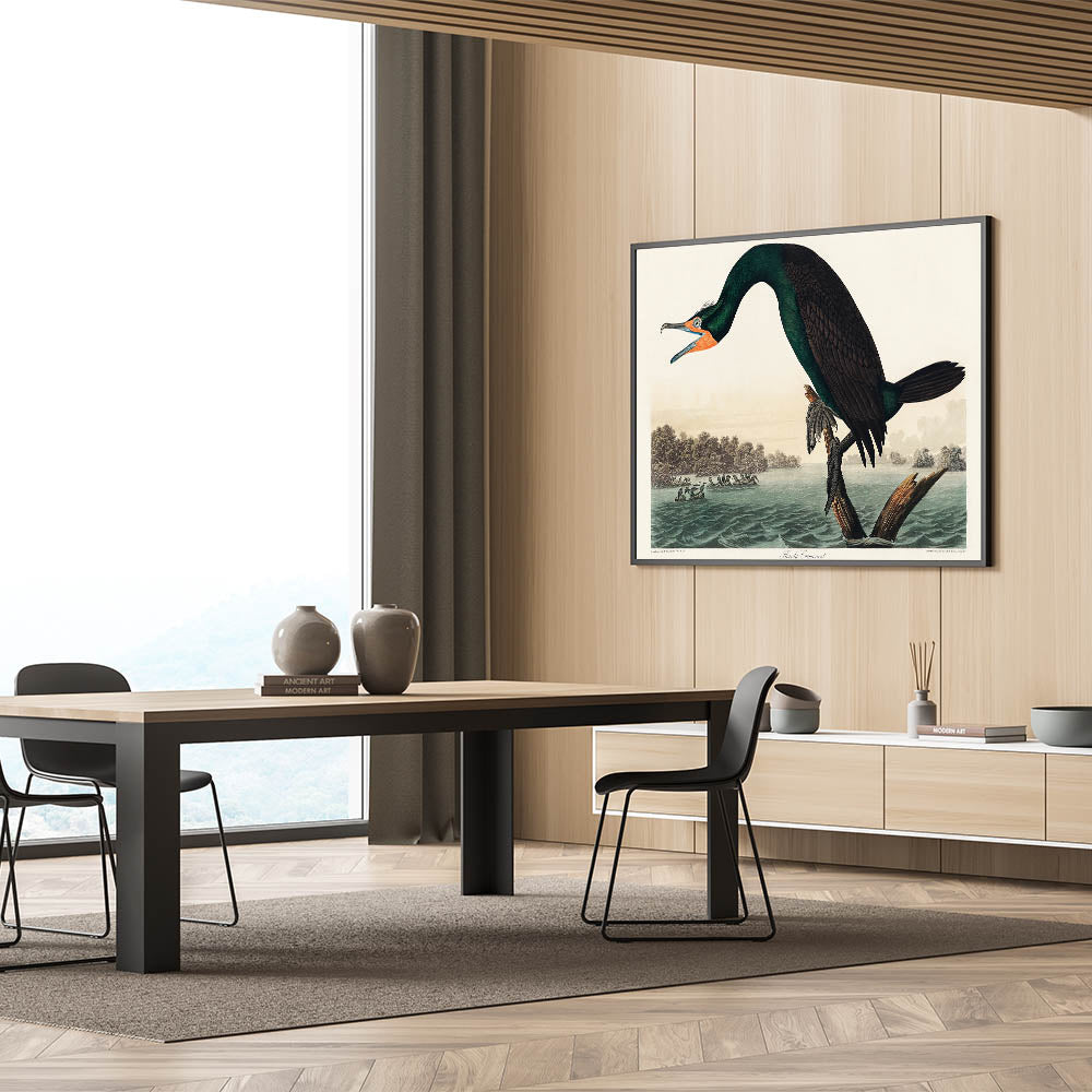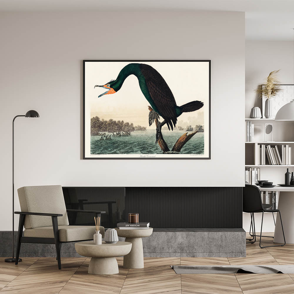 Celebrate the beauty of nature with John James Audubon’s Florida Cormorant, an iconic piece from his Birds of America series. This stunning artwork captures the vivid details of the cormorant perched on a branch against a serene water and forest backdrop. The intricate brushstrokes and lifelike depiction showcase Audubon’s mastery of Romanticism’s love for the natural world. The vibrant green plumage, accented by bold orange and black tones, makes this piece a timeless masterpiece.