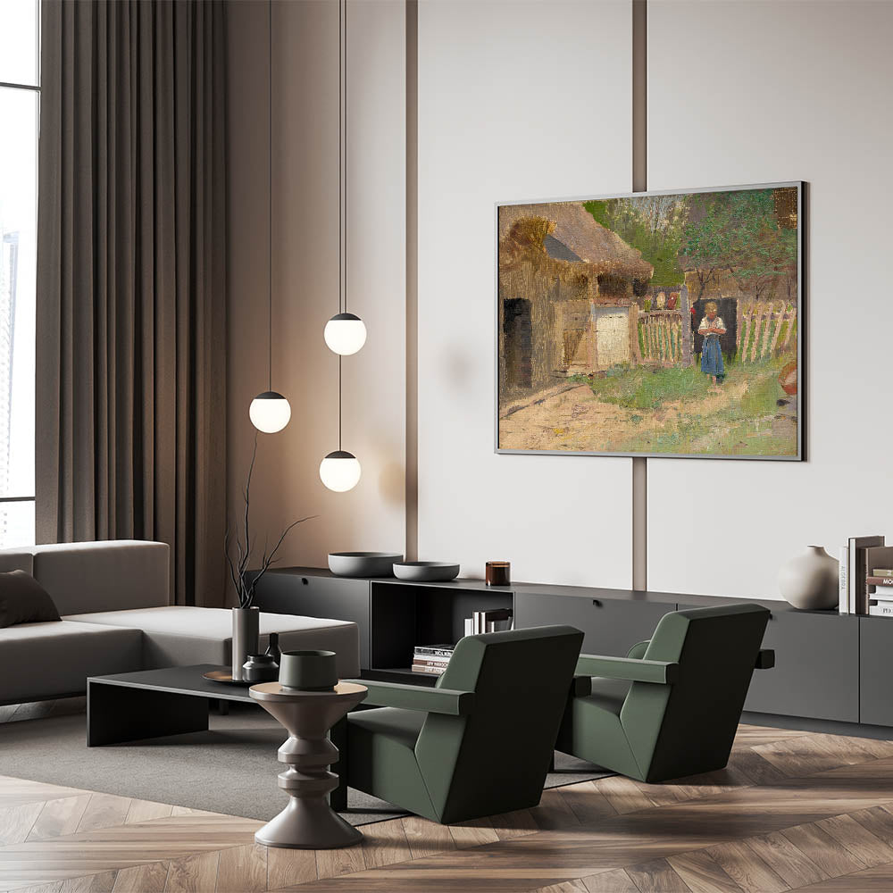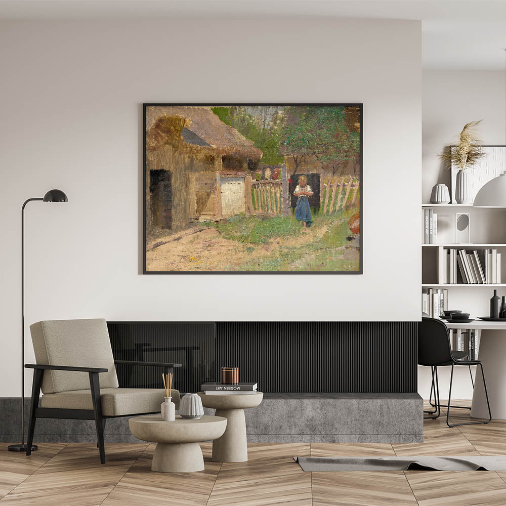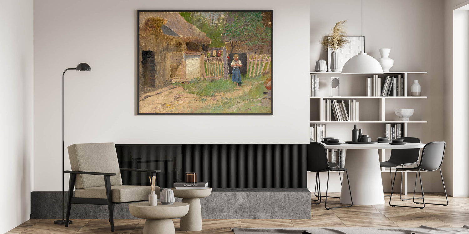 Capture the charm of rural life with "Girl in a Farmyard" by László Mednyánszky, a beautiful example of Romanticism style wall art. This delicate painting portrays a serene farmyard scene, with a young girl standing amidst rustic fences and thatched-roof cottages. The artist's use of earthy tones and soft textures evokes a sense of nostalgia and connection to nature, characteristic of the classic art of the Romantic era.