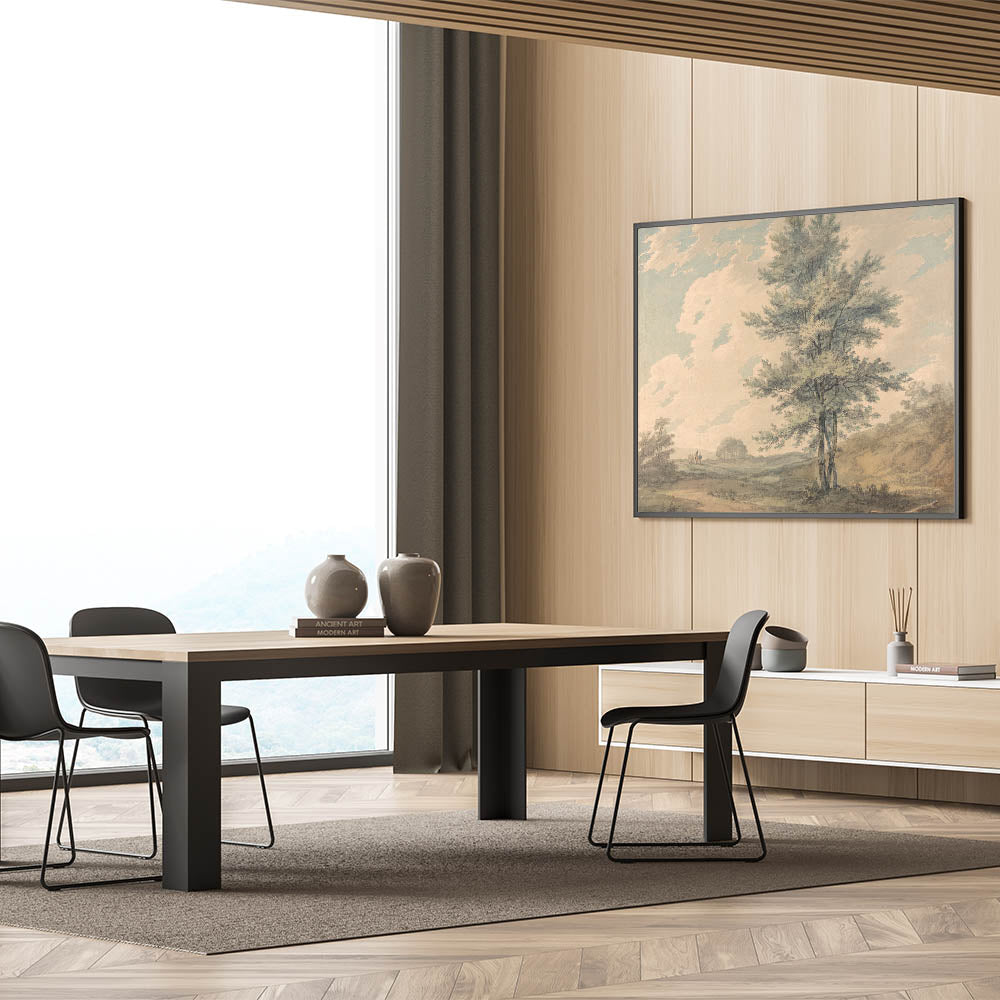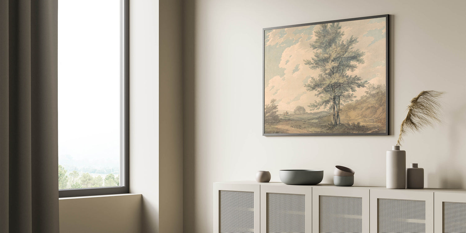 Embrace the tranquility of Romanticism with this beautiful artwork, Landscape with Trees and Figures. This piece masterfully captures the peaceful essence of nature, featuring a towering tree surrounded by a serene countryside scene. Subtle details of the figures in the distance evoke a sense of harmony and connection to nature, a hallmark of the Romantic art movement. The soft, muted tones of green, beige, and pale blue give this artwork a calming and timeless quality, making it ideal for any home or office decor.