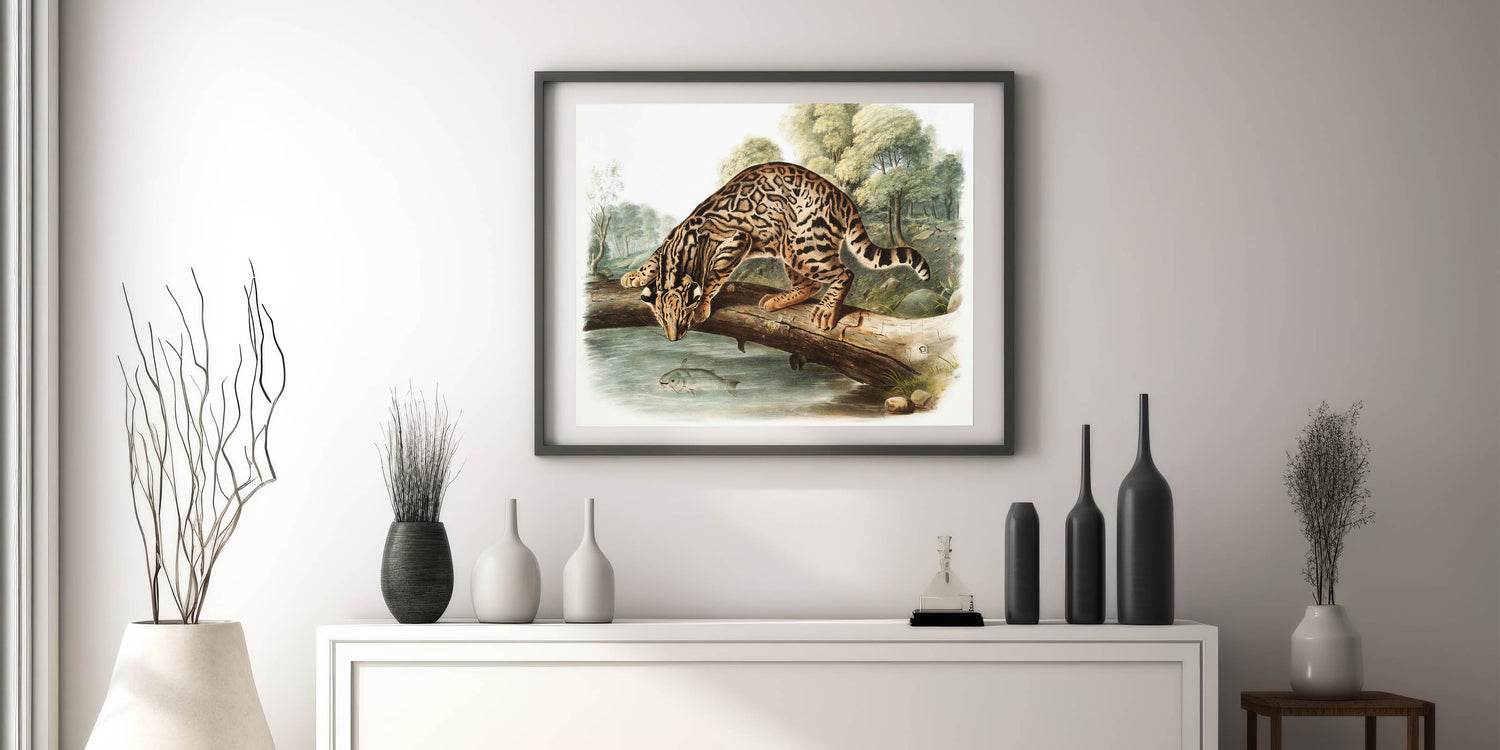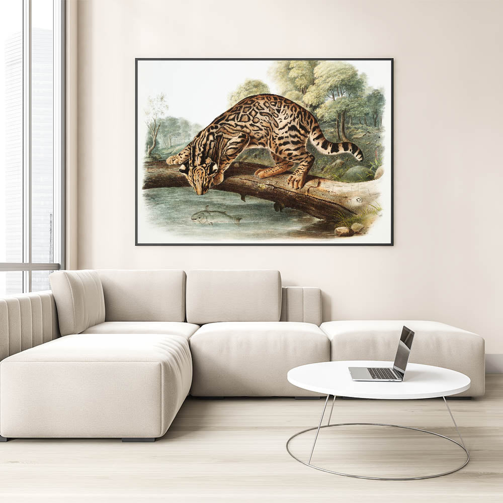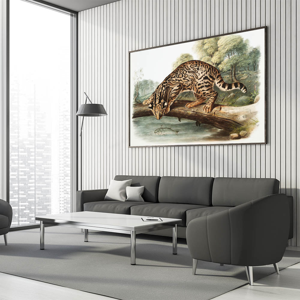 Explore the wild beauty of nature with "Ocelot or Leopard Cat" by John Woodhouse Audubon, an exquisite example of Romanticism style wall art. This captivating illustration features a meticulously detailed ocelot perched on a fallen tree, peering into the water below where a fish swims. The lush forest backdrop and lifelike representation of the ocelot’s fur patterns embody the classic art of the Romantic era, celebrating the untamed majesty of the natural world.