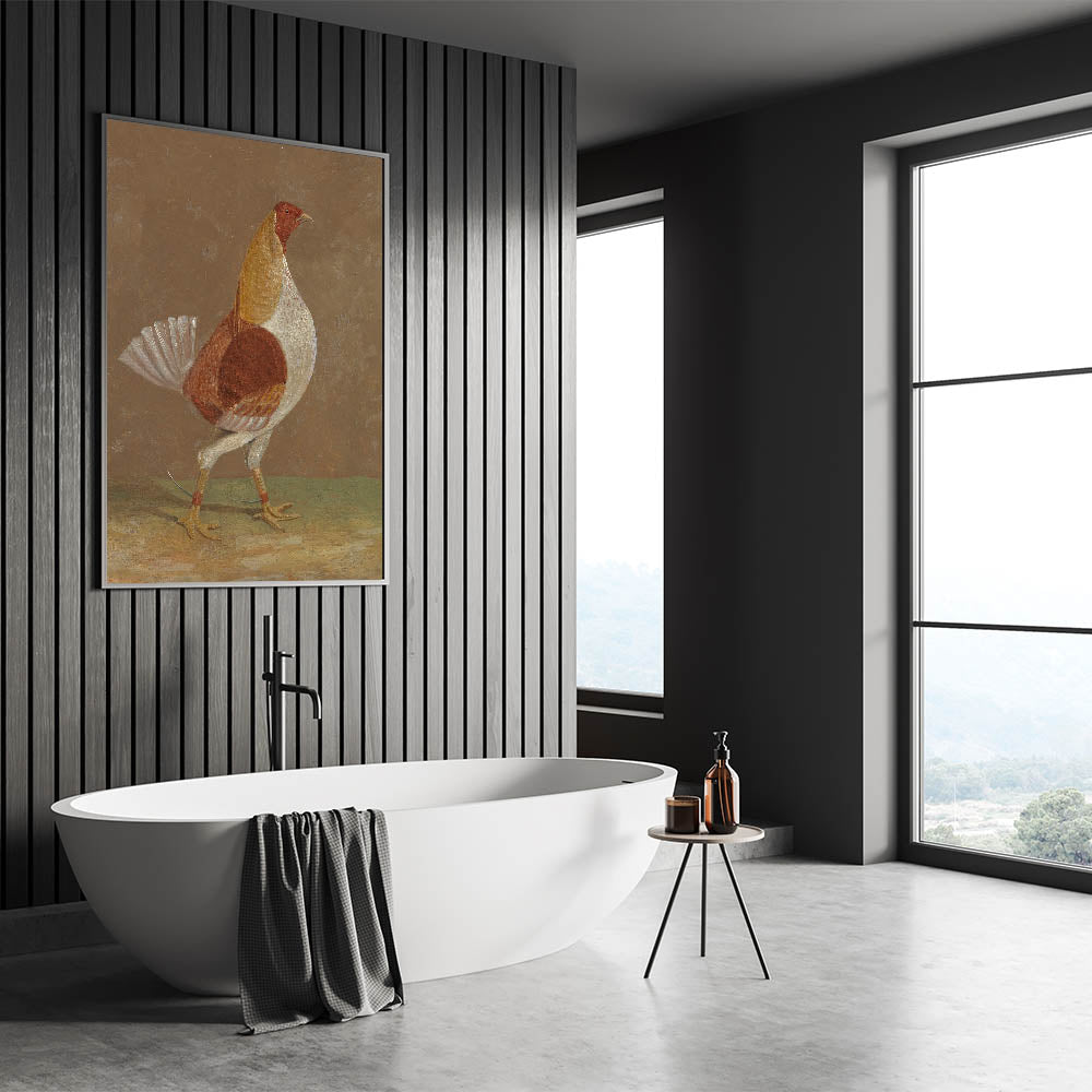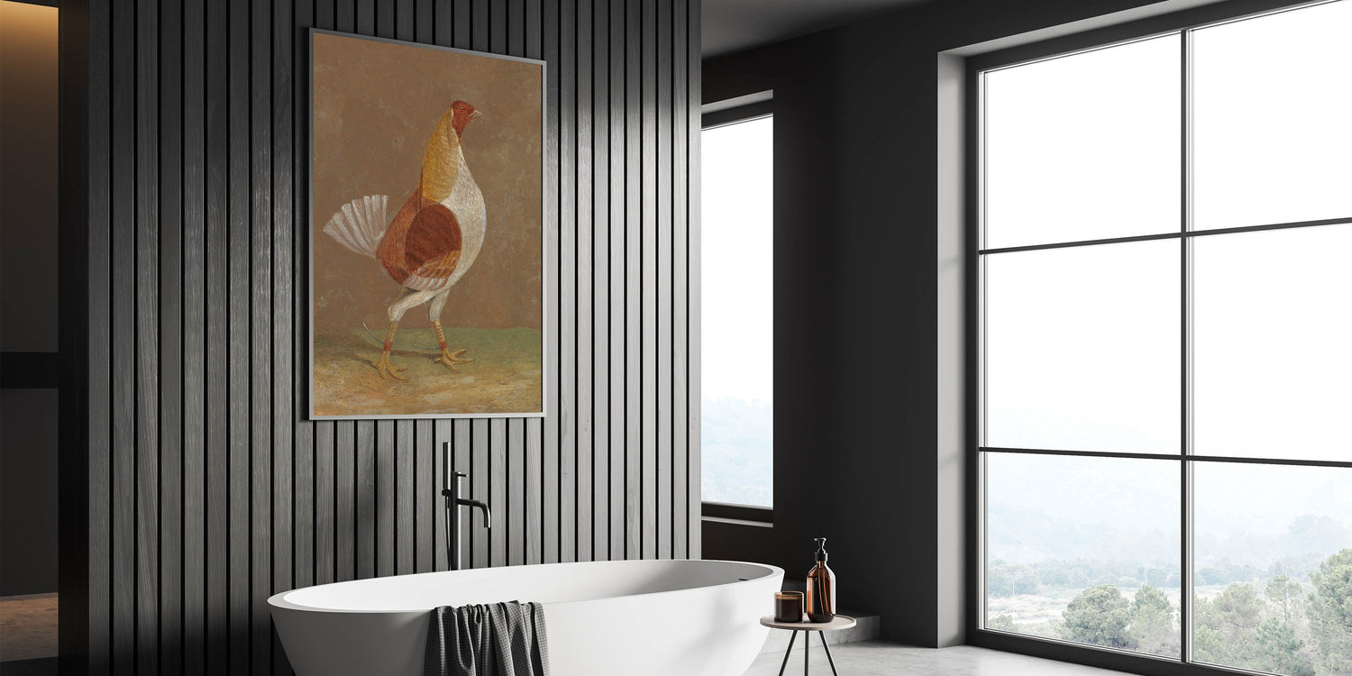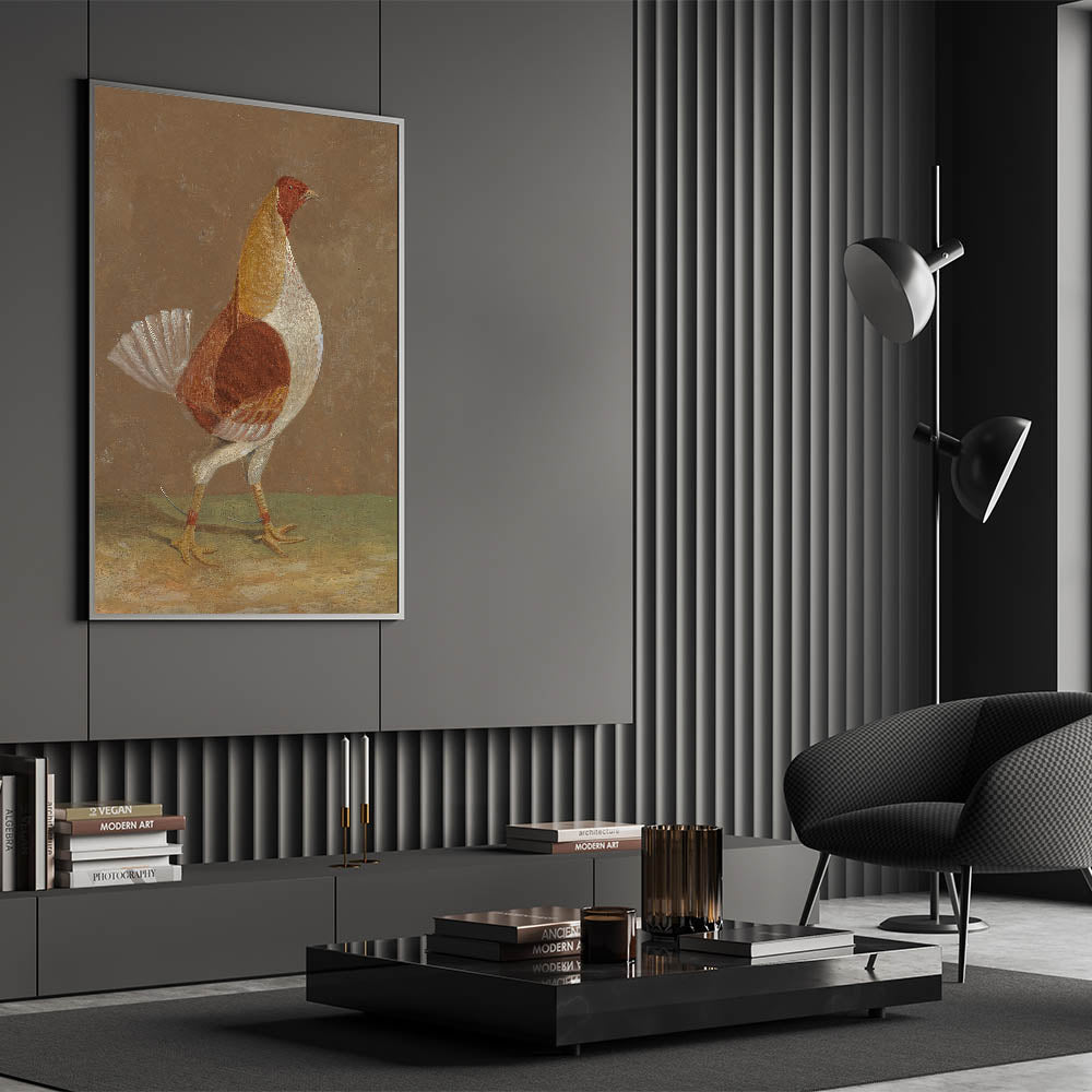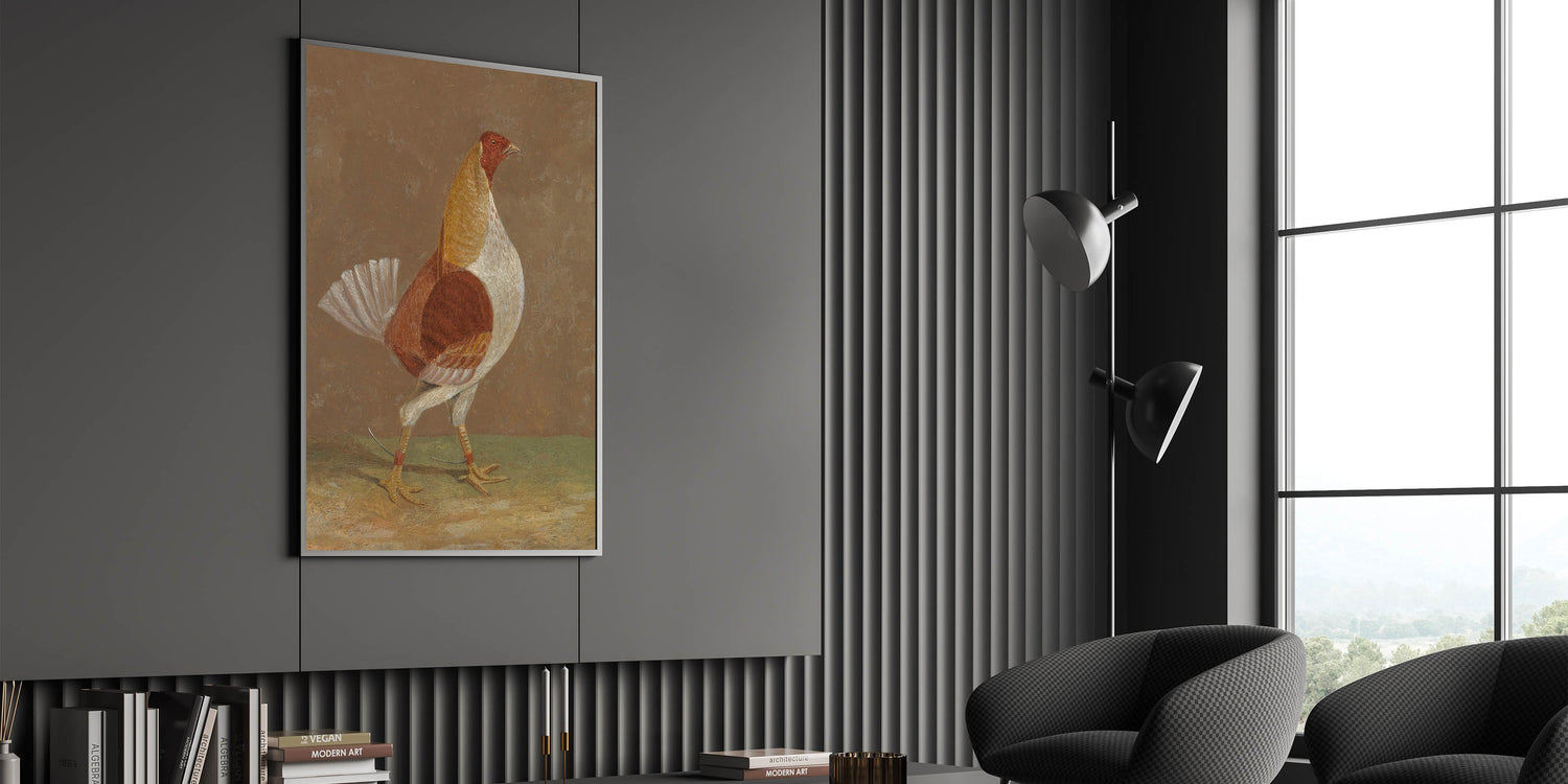 Celebrate the artistry of Romanticism style wall art with "Pale-Breasted Fighting Cock" (1829) by John Frederick Herring. This striking painting showcases the intricate details of a proud fighting cock with vibrant tones of burgundy, gold, and earthy hues. The meticulous brushwork captures the bird's stance and feathers, reflecting the Romantic era’s admiration for natural beauty and elegance in everyday life.