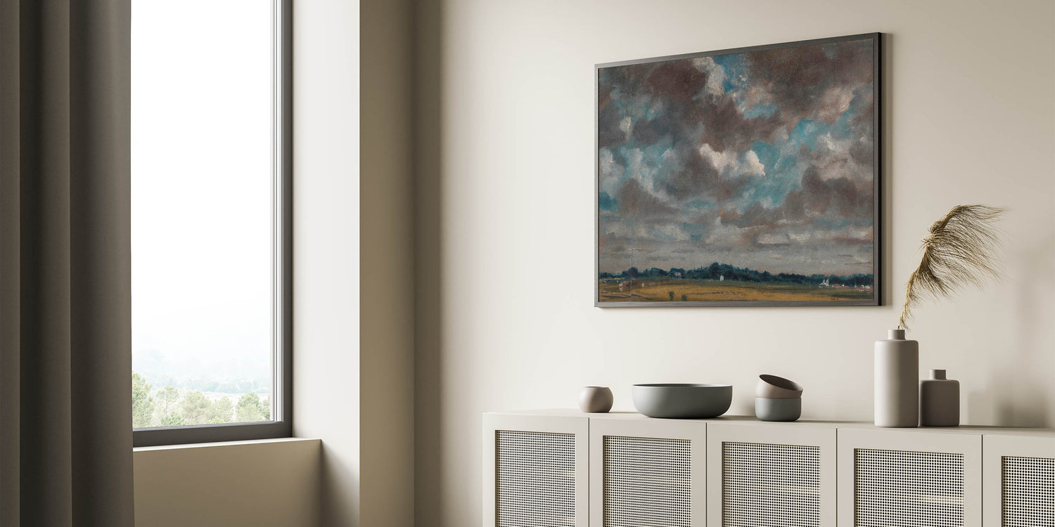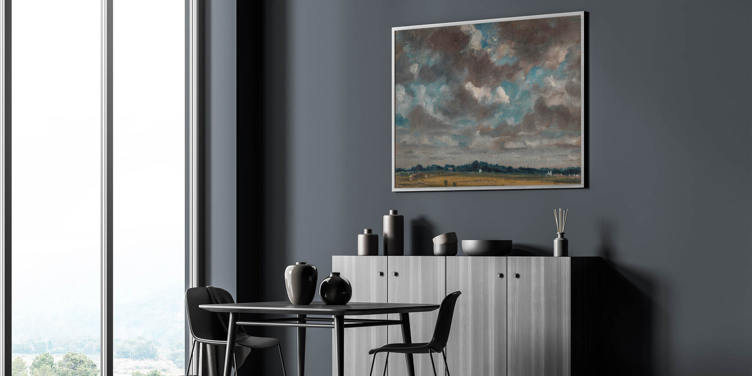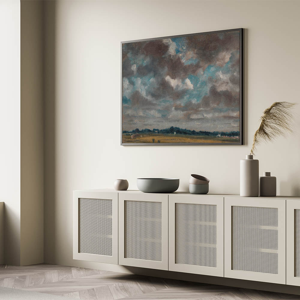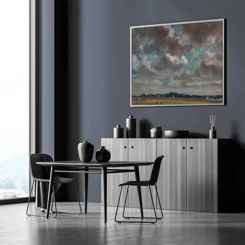 Experience the dramatic beauty of Romanticism with this Extensive Landscape with Grey Clouds by John Constable. This stunning artwork captures the shifting moods of nature, showcasing a stormy sky contrasted with tranquil pastoral scenery. Constable's mastery of light and shadow brings an emotional depth to this painting, making it a quintessential piece of Romantic era art.