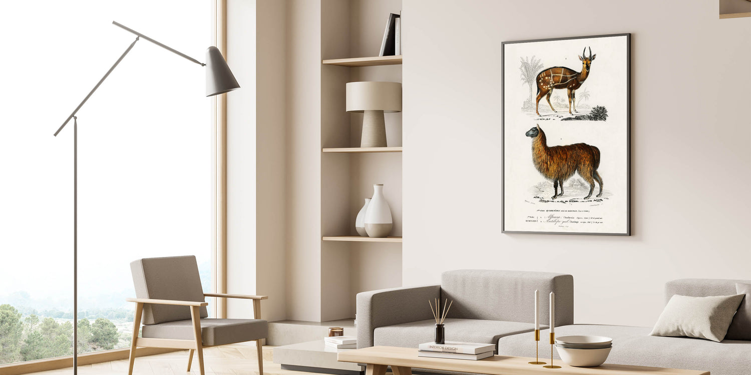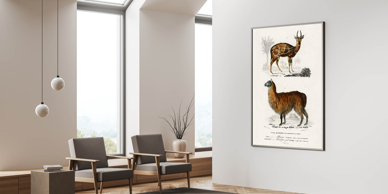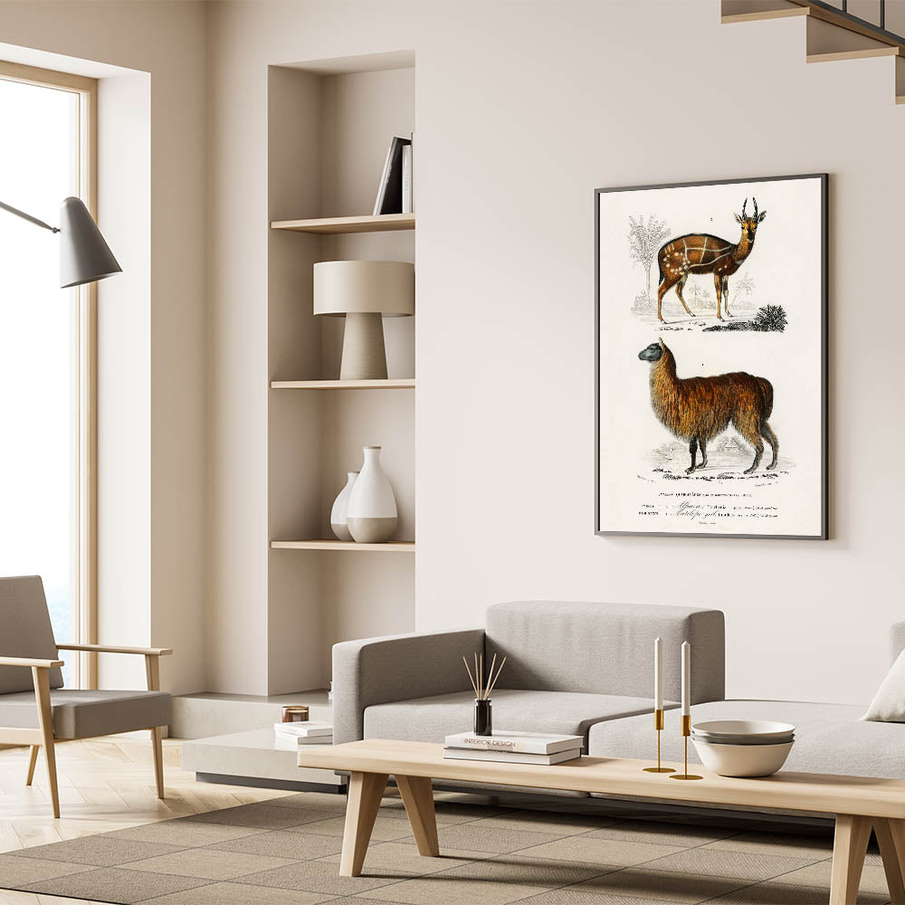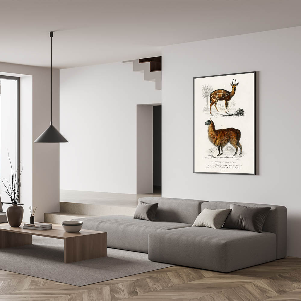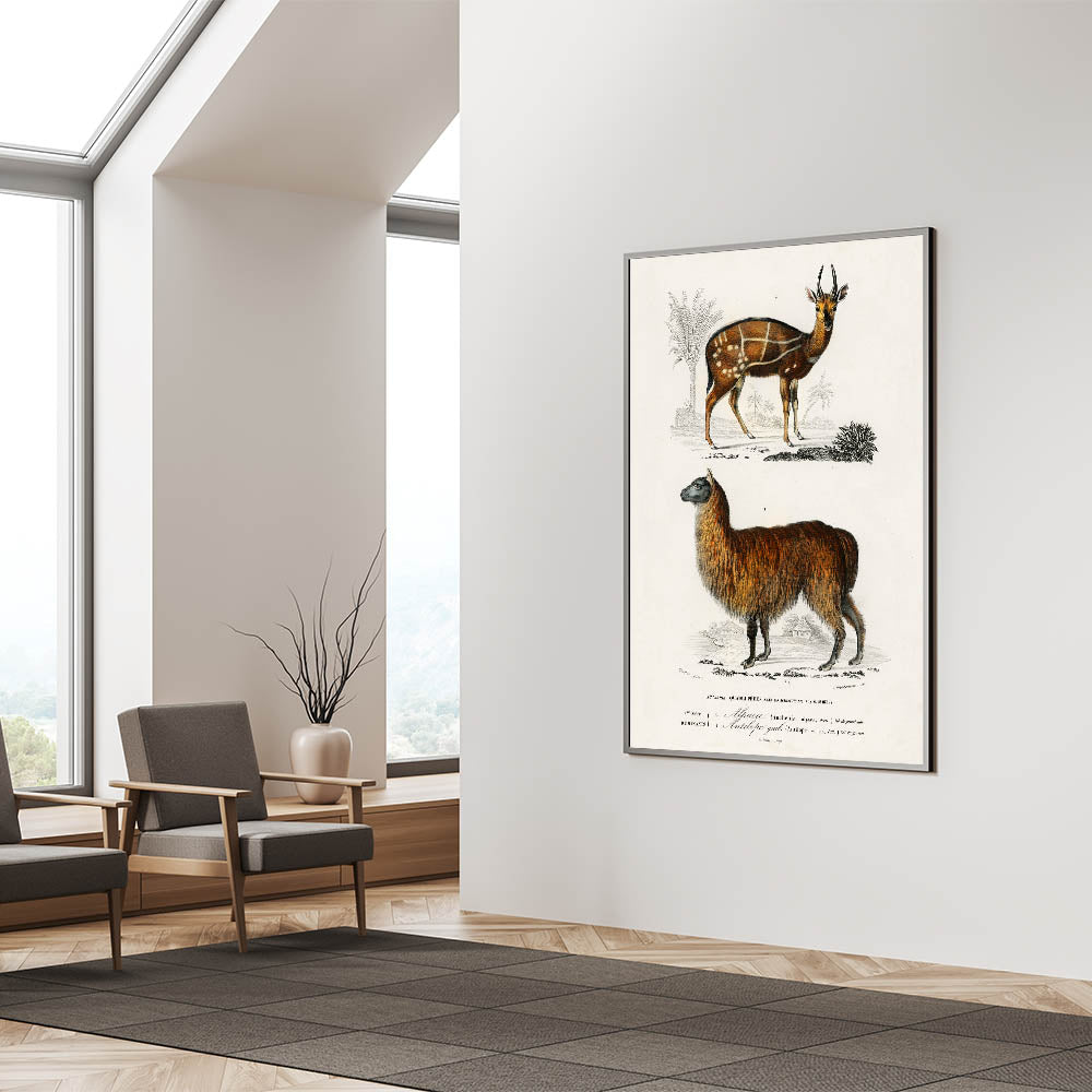 Bring the charm of the Romanticism style wall art into your home with this meticulously detailed illustration of an alpaca (Vicugna Pacos) and antelope by Charles Dessalines D'Orbigny. This artwork embodies the essence of the classic art of the Romantic era, combining emotional expression with nature's majesty. Perfect for anyone who appreciates wildlife art and historical artistry.