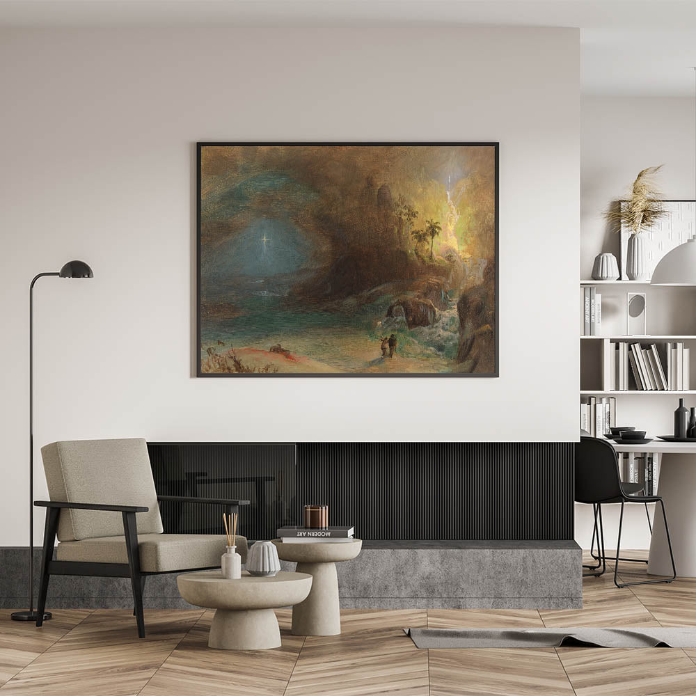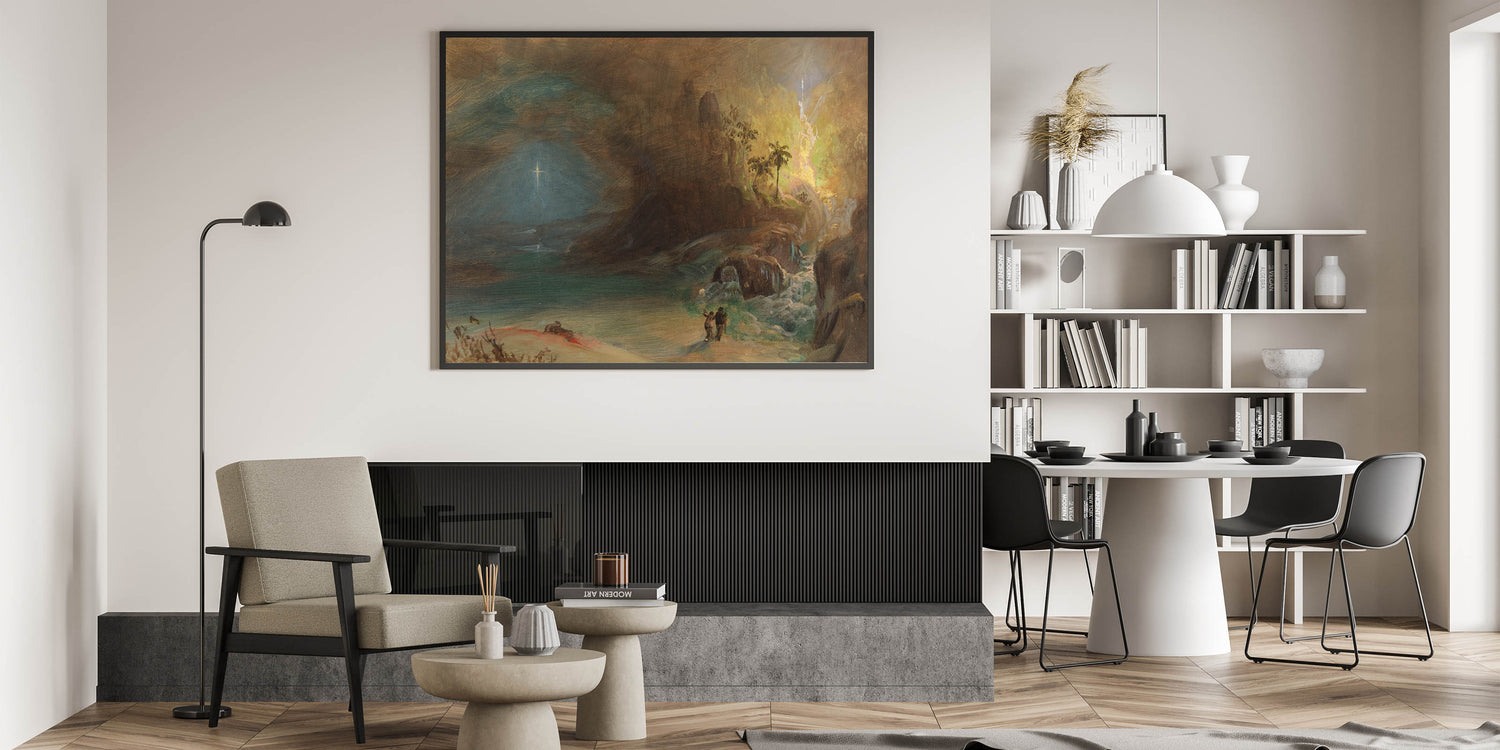 Immerse yourself in the sublime beauty of Romanticism with "Study for Apotheosis to Thomas Cole" by Frederic Edwin Church. This atmospheric masterpiece captures the dramatic interplay of light and shadow, with a radiant cross illuminating the serene waterscape on one side and lush, glowing vegetation on the other. The figures in the foreground enhance the painting’s scale and evoke a sense of awe, perfectly embodying the Romantic era’s fascination with nature’s grandeur and spiritual depth.