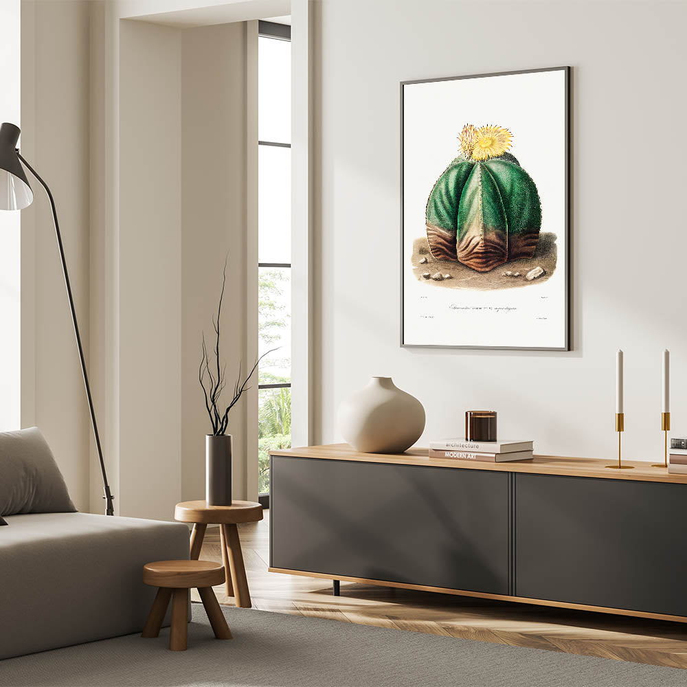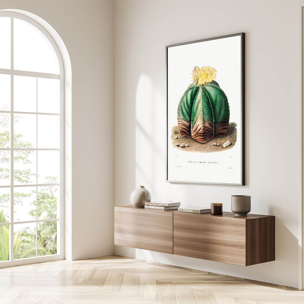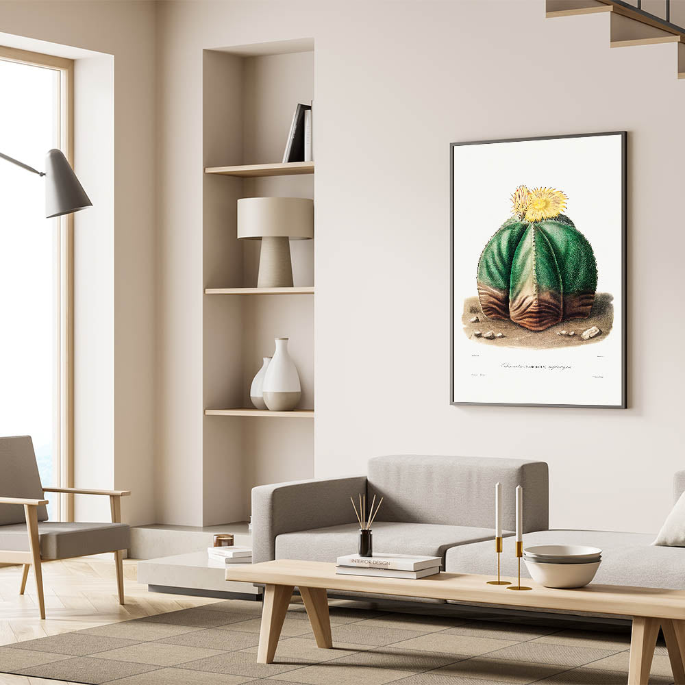 Bring a touch of botanical elegance to your décor with this stunning Romanticism style wall art, featuring the Bishop’s Cap Cactus (Astrophytum Myriostigma). This intricate illustration from Iconographie Descriptive des Cactées by Charles Antoine Lemaire showcases the harmonious blend of art and nature that defines the classic art of the Romantic era. With its vibrant green hues, golden flowers, and lifelike details, this artwork exudes sophistication and charm.