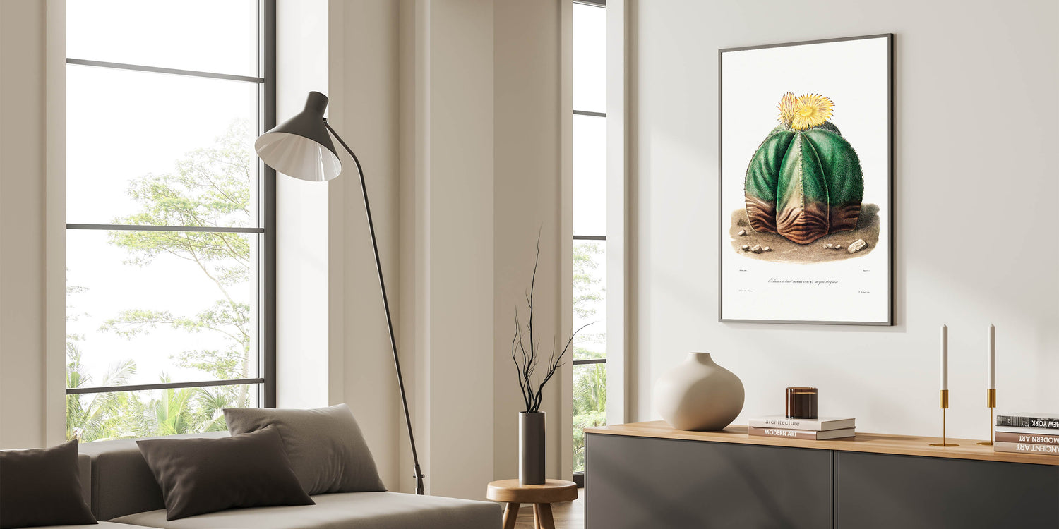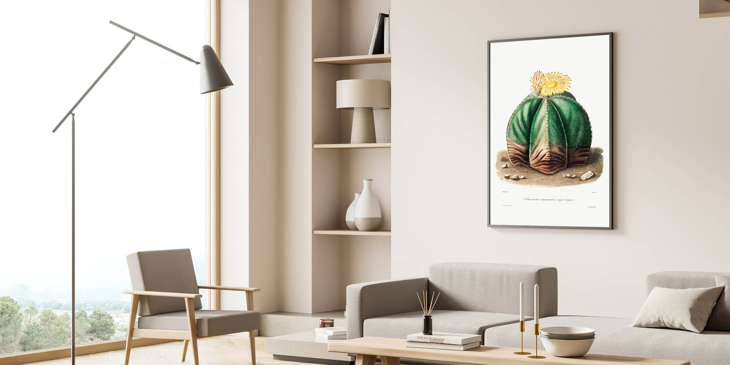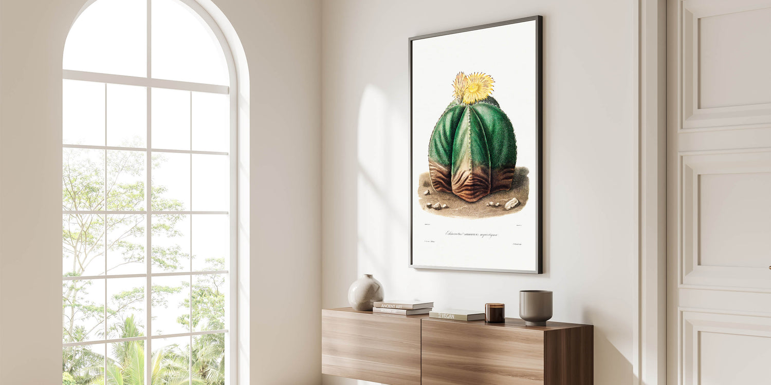 Bring a touch of botanical elegance to your décor with this stunning Romanticism style wall art, featuring the Bishop’s Cap Cactus (Astrophytum Myriostigma). This intricate illustration from Iconographie Descriptive des Cactées by Charles Antoine Lemaire showcases the harmonious blend of art and nature that defines the classic art of the Romantic era. With its vibrant green hues, golden flowers, and lifelike details, this artwork exudes sophistication and charm.