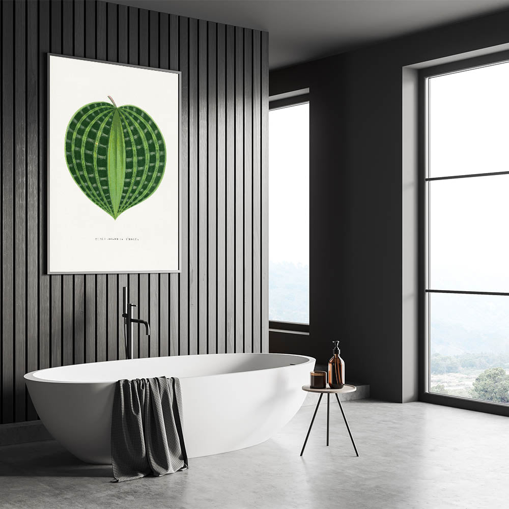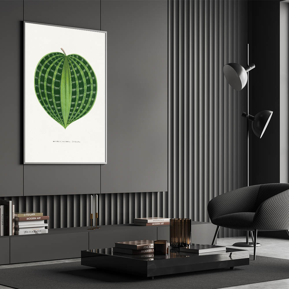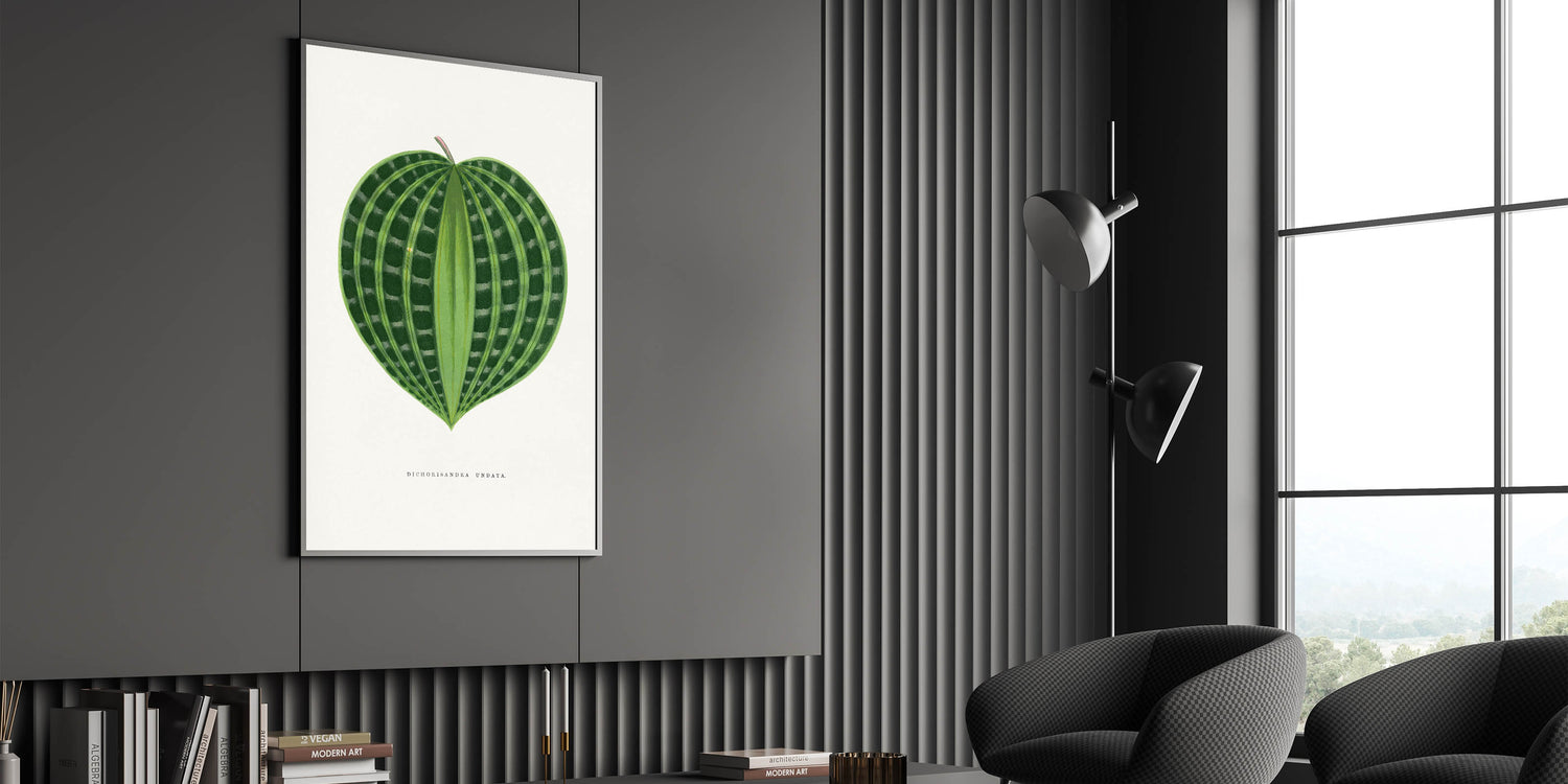 This exquisite botanical illustration of the Dichorisandra Undata leaf captures the beauty and precision of Romanticism art. The intricately patterned green leaf, with its striped and textured details, embodies the Romantic era’s fascination with nature's artistry. The vibrant tones and balanced symmetry make this piece a timeless addition to any decor, celebrating the elegance of botanical art.