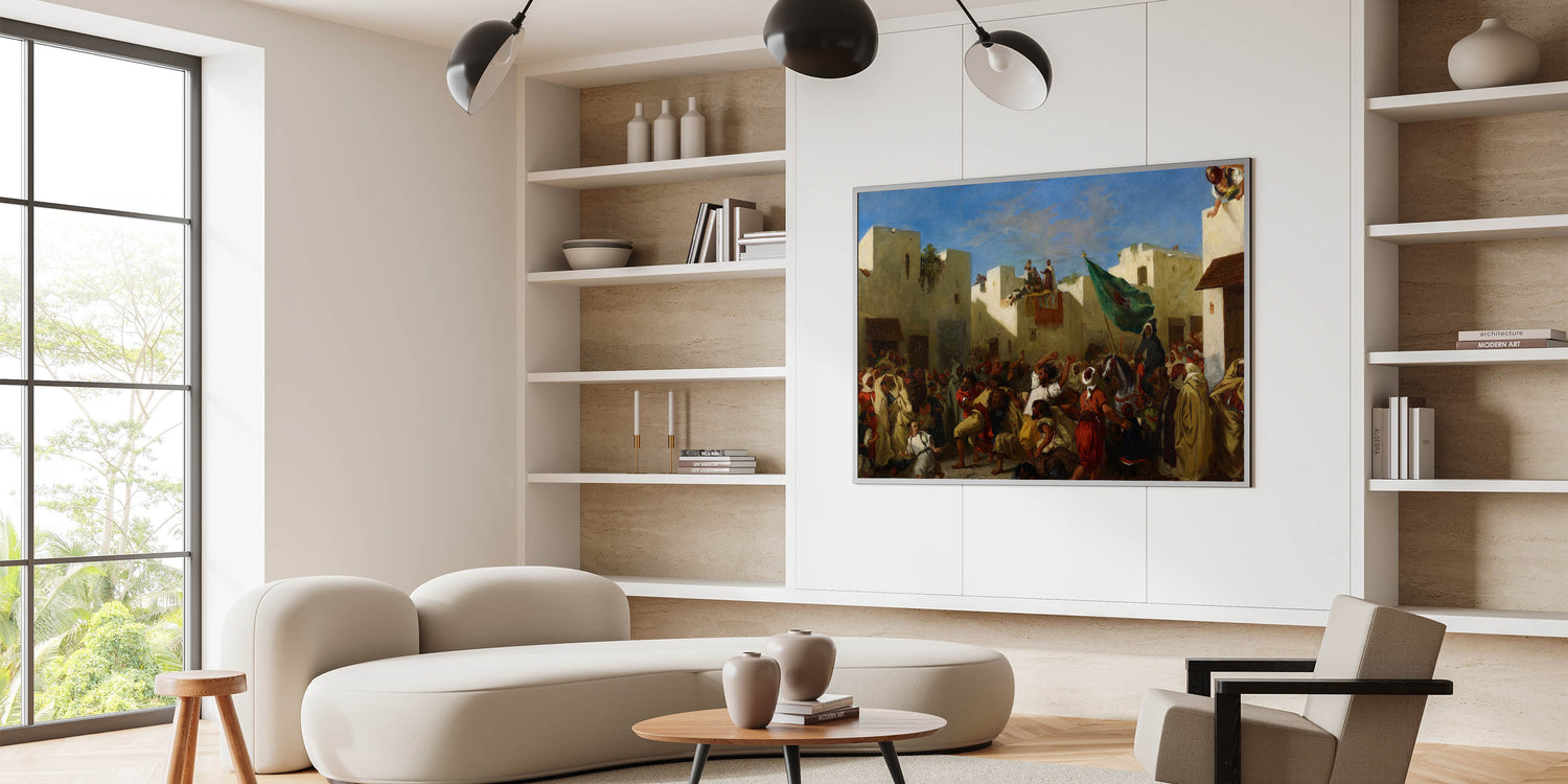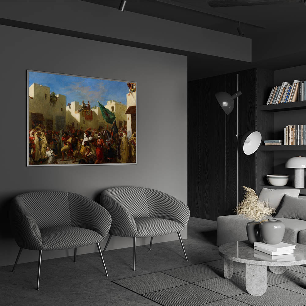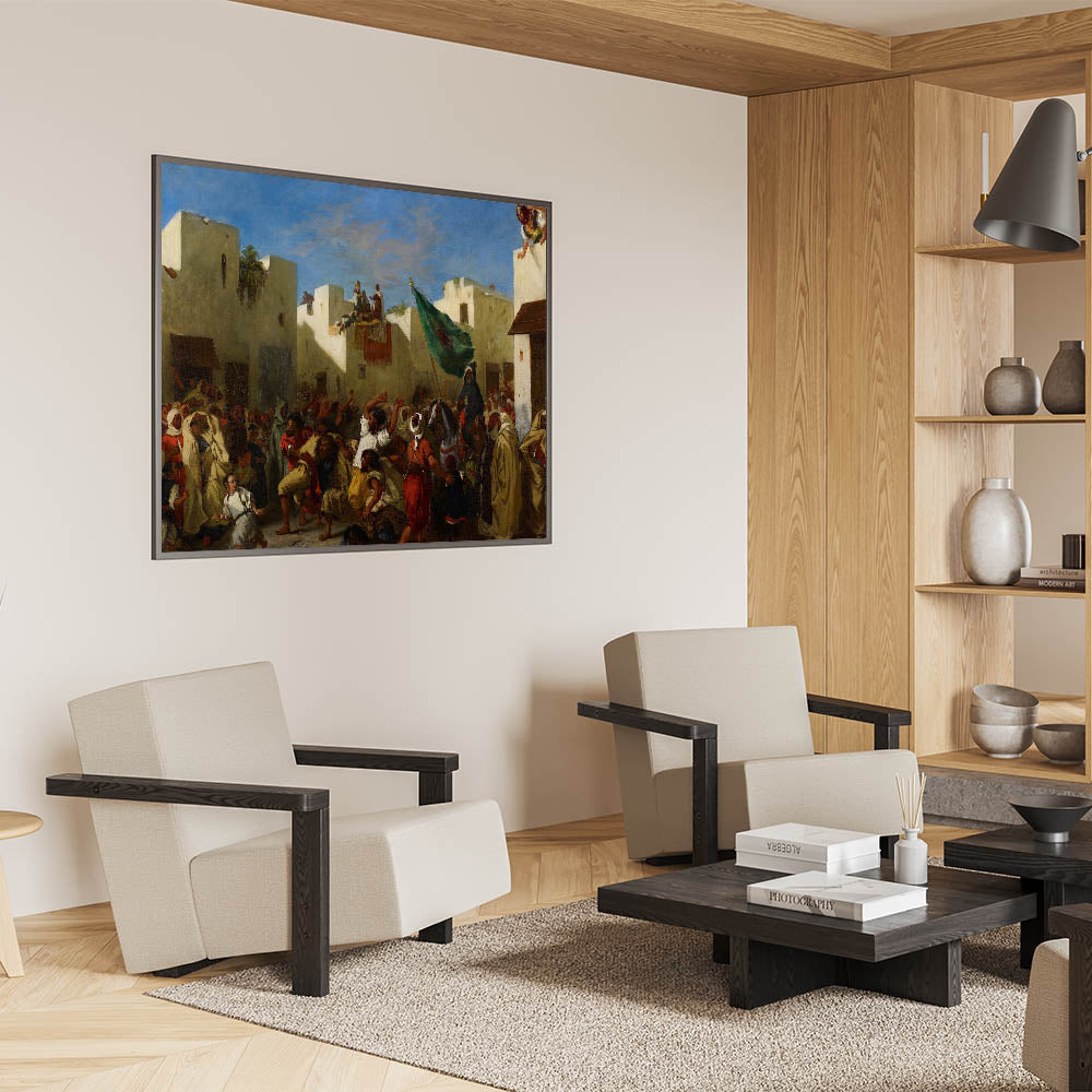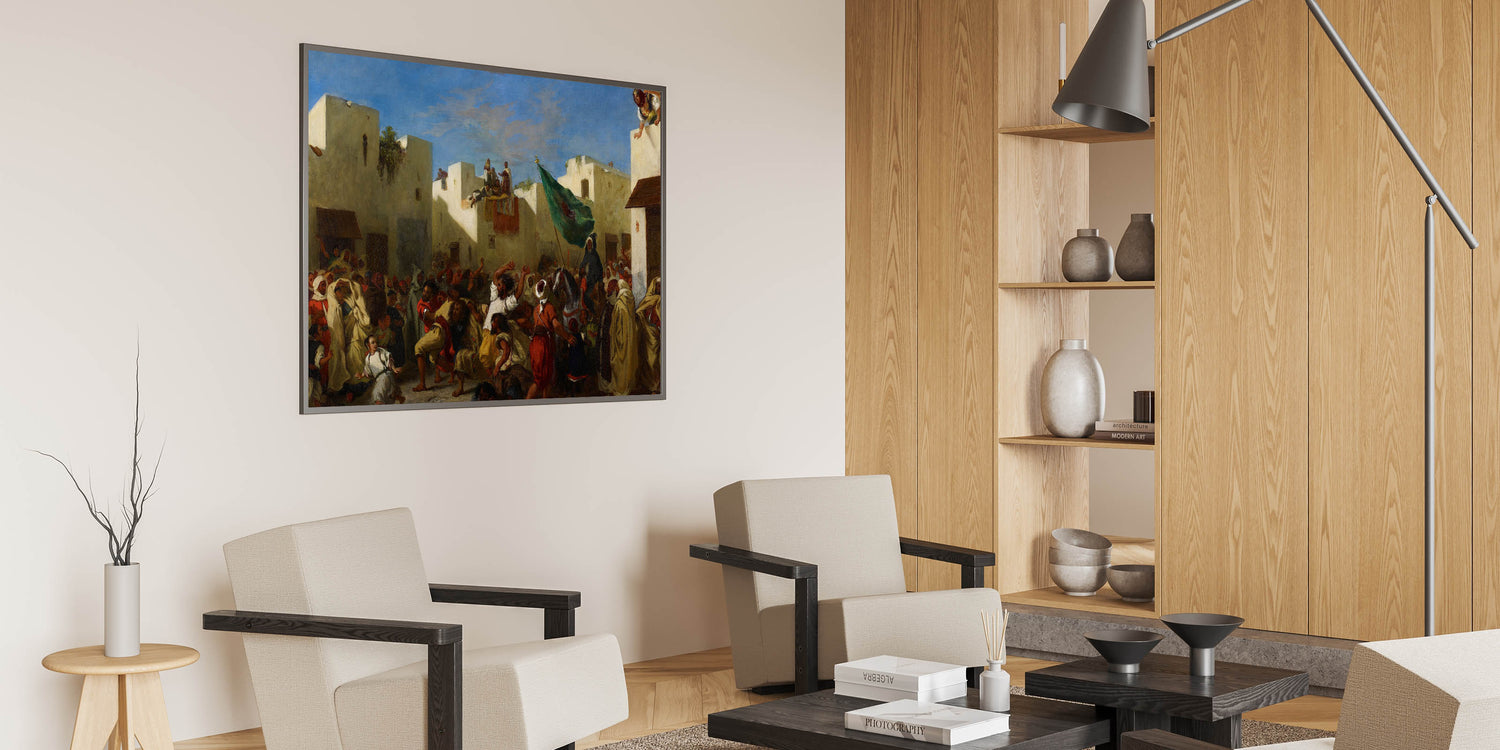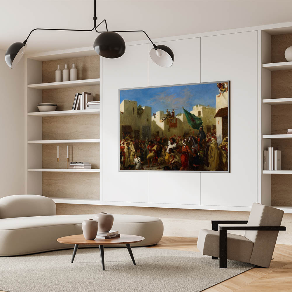Celebrate the dynamic and emotional storytelling of the Romanticism era with this masterpiece, “Convulsionists of Tangier” by Eugène Delacroix. This iconic painting captures the vibrancy and chaos of a bustling Moroccan street, illustrating the Romanticism style’s emphasis on emotion, movement, and cultural exploration.