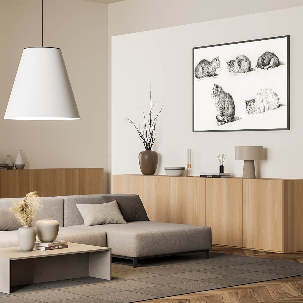 Delight in the charm of Jean Bernard's "Five Studies of Cats," a masterpiece that captures the serene beauty and natural grace of cats through the Romanticism lens. This detailed pencil illustration features five poses of resting cats, each rendered with exquisite precision and soft textures. The simplicity and elegance of this piece evoke a timeless sense of calm, making it a perfect addition to any art collection or interior decor.