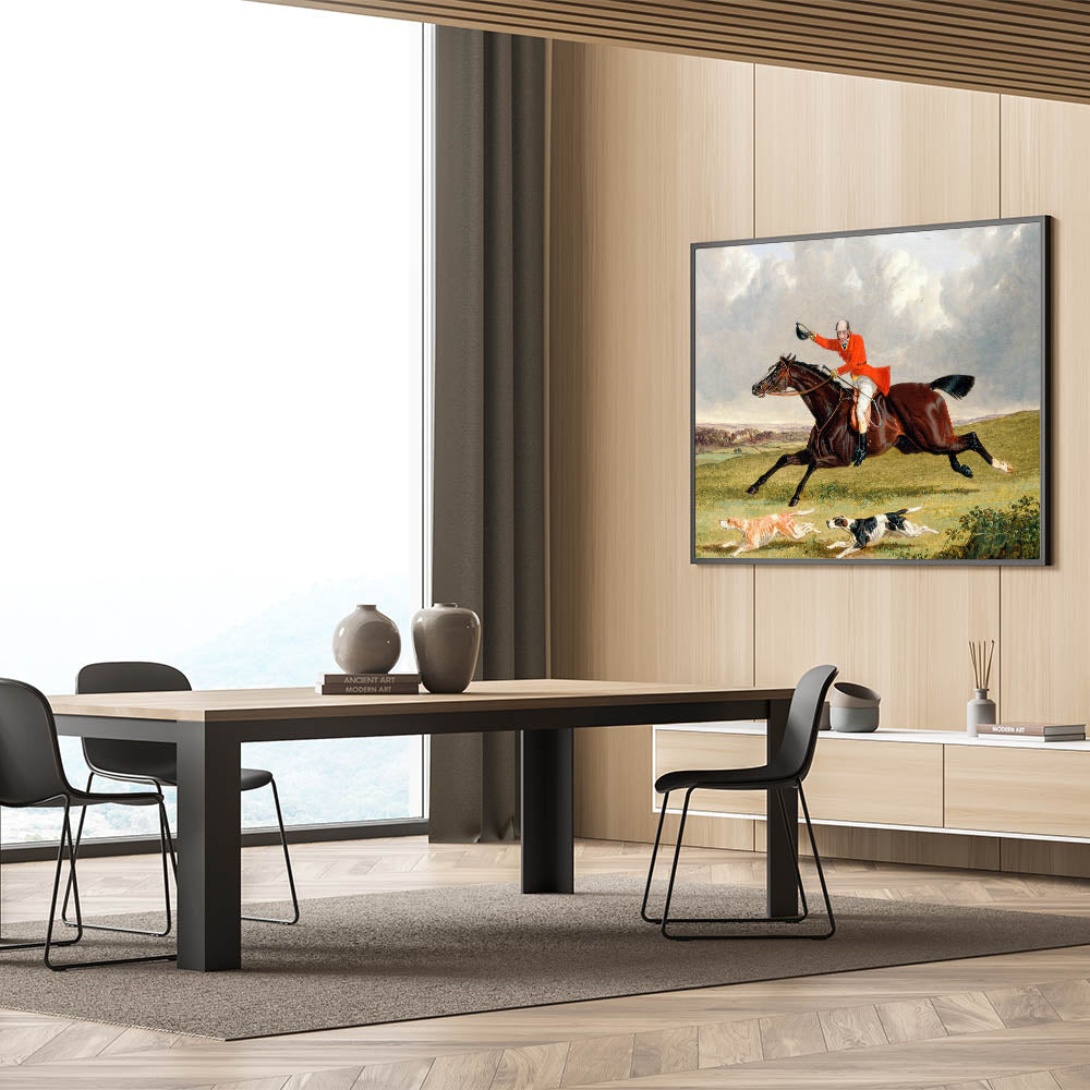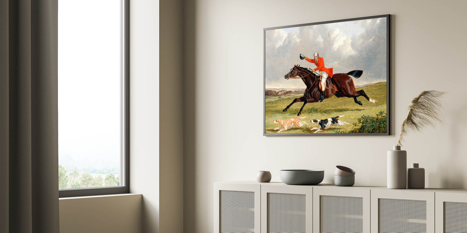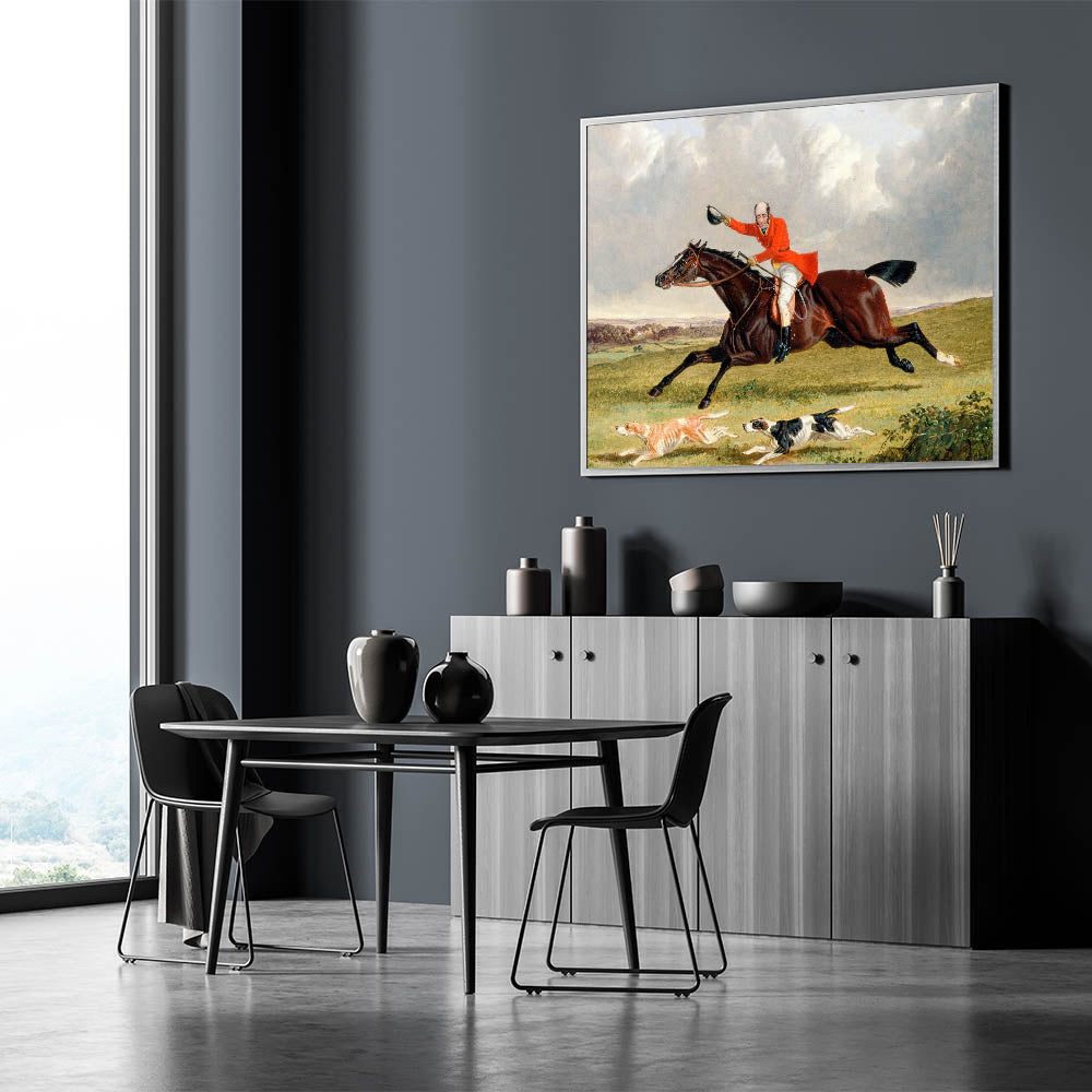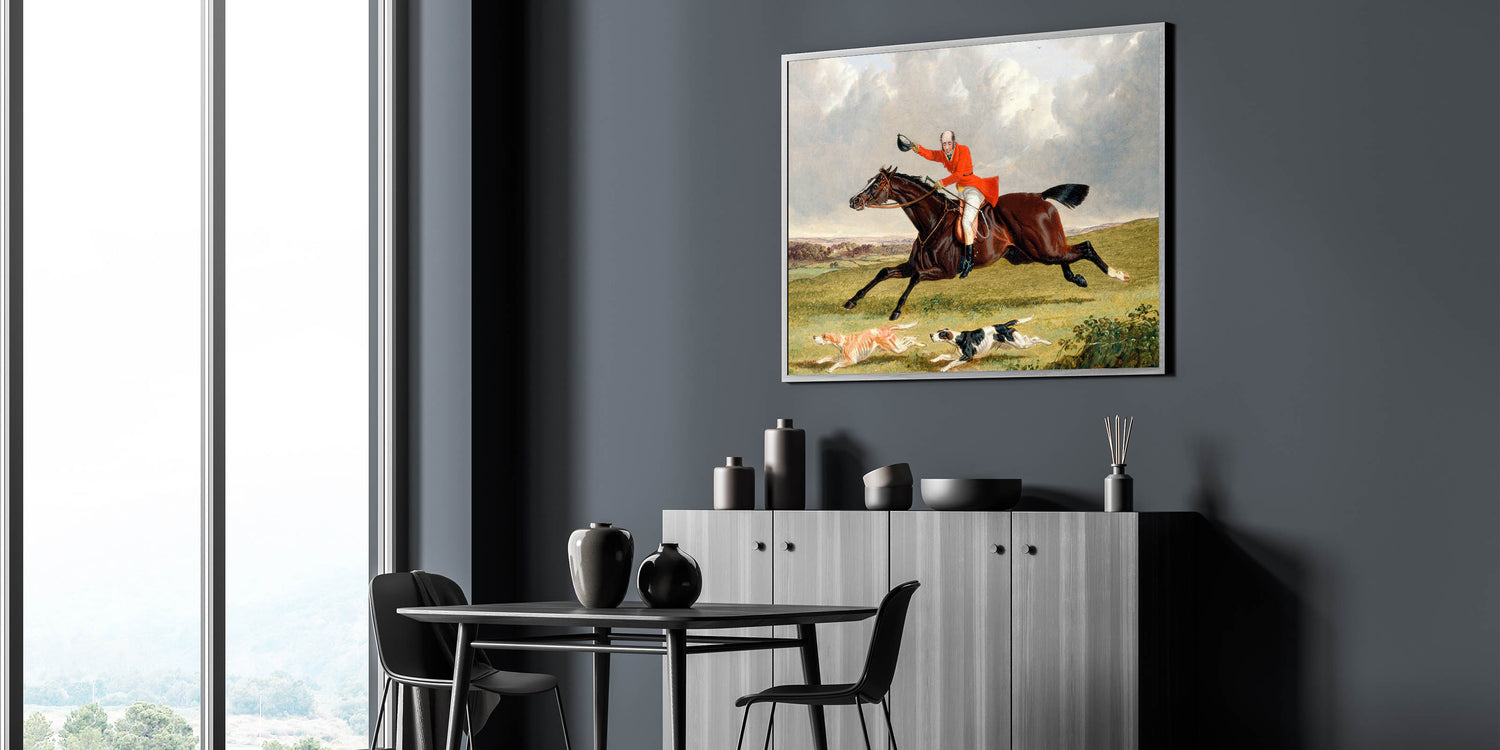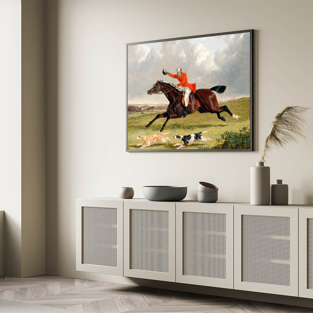 Immerse yourself in the lively spirit of the countryside with John Frederick Herring’s Foxhunting: Encouraging Hounds (1839). This vibrant painting captures the thrill of a fox hunt, showcasing a gallant rider, his spirited horse, and eager hounds in full pursuit. The dramatic composition, rich colors, and meticulous details reflect the Romantic era’s fascination with action, emotion, and nature.