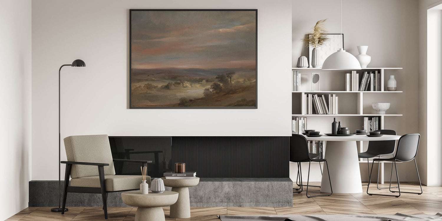 Experience the gentle tranquility of A View on Hampstead Heath, Early Morning, a serene Romanticism artwork by John Constable. This masterpiece captures the soft hues of dawn over Hampstead Heath, with a delicate interplay of muted greens, soft browns, and pastel pinks. The atmospheric brushstrokes evoke the calmness and quietude of an early morning landscape, reflecting the Romantic era's deep connection to nature's beauty and simplicity.