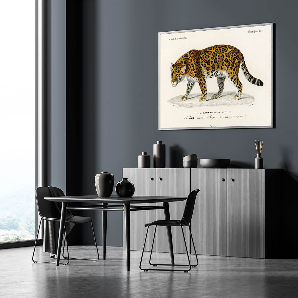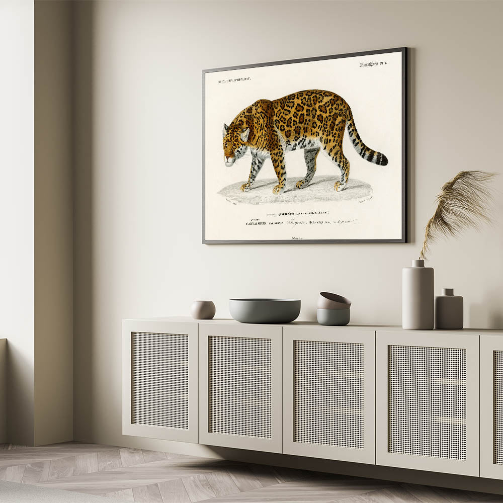 Embrace the beauty of Romanticism style wall art with this detailed illustration of the jaguar (Panthera Onca), crafted by Charles Dessalines D’Orbigny. This exquisite piece is part of 19th-century scientific artistry, showcasing the jaguar in all its majestic glory. The intricate detailing, from the striking spots on its coat to the lifelike gaze, reflects the Romantic era’s admiration for the natural world and its creatures. This timeless illustration perfectly balances scientific precision and artistic beauty, making it a standout addition to any space.