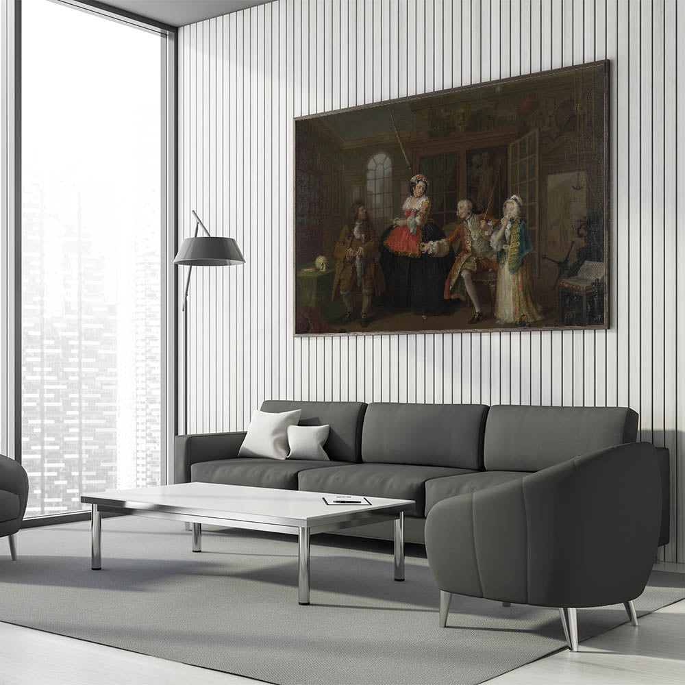 Experience the satirical brilliance of William Hogarth’s Marriage A-la-Mode 3: The Inspection, a thought-provoking masterpiece from the Romantic era. This intricate scene is part of Hogarth’s renowned series critiquing societal norms and the institution of marriage in 18th-century England. The detailed composition captures the tension, drama, and humor of this moment, with each character contributing to the rich storytelling.