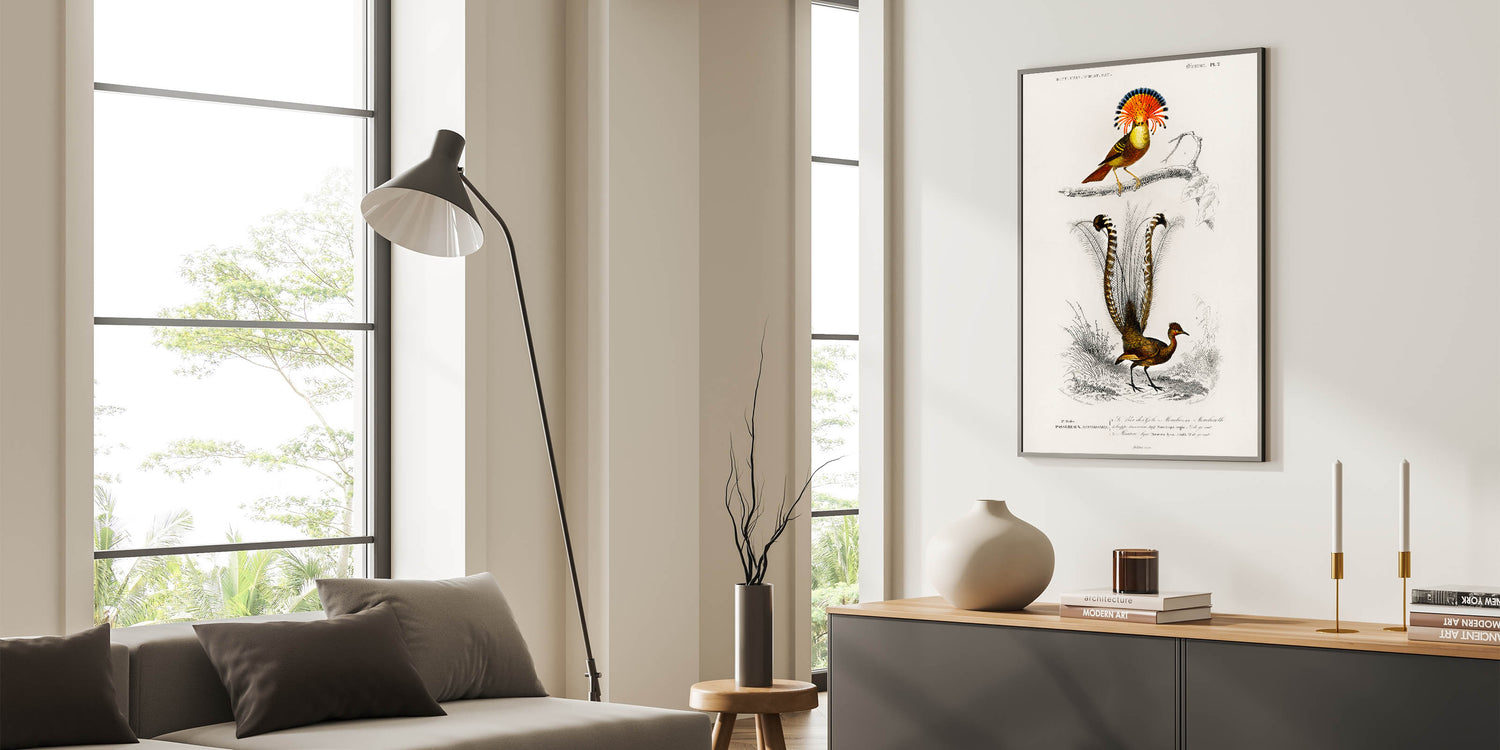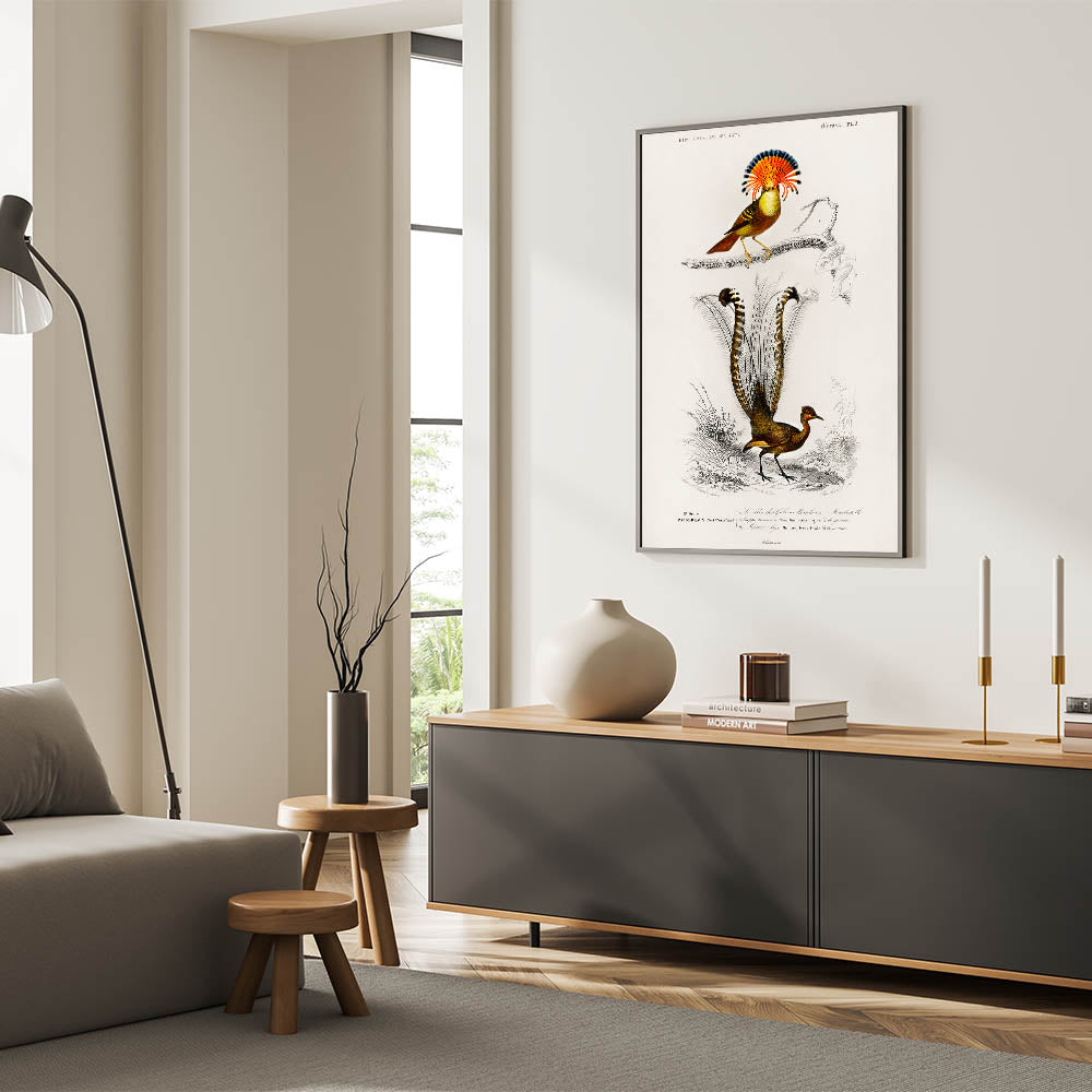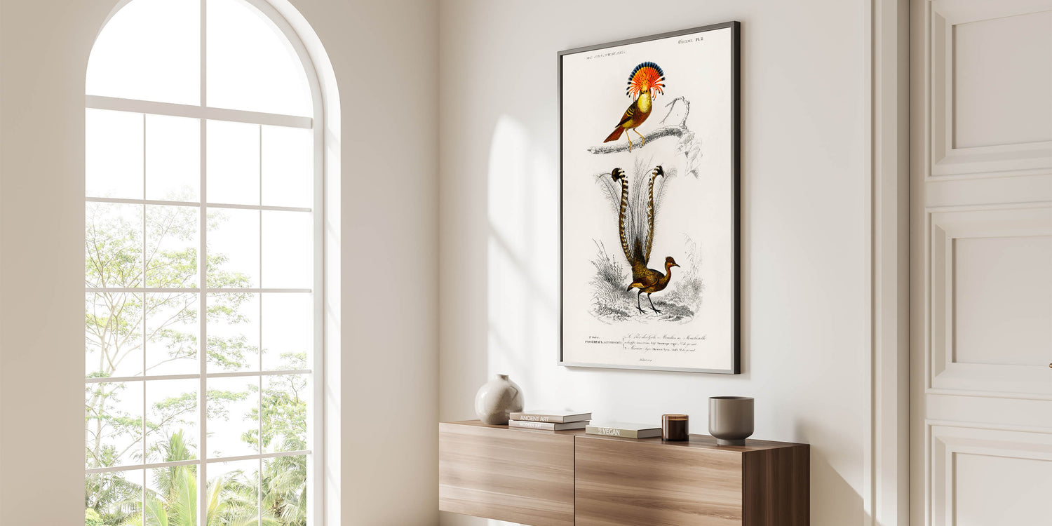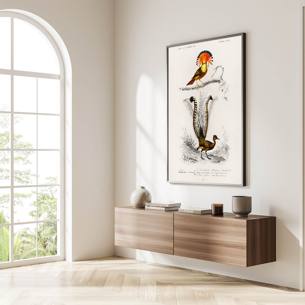 Enhance your home with this captivating artwork inspired by Romanticism, showcasing a detailed and elegant illustration of exotic birds. This exquisite piece reflects the Romantic era’s appreciation for nature, beauty, and intricate detail, making it a perfect addition to any art collection.
