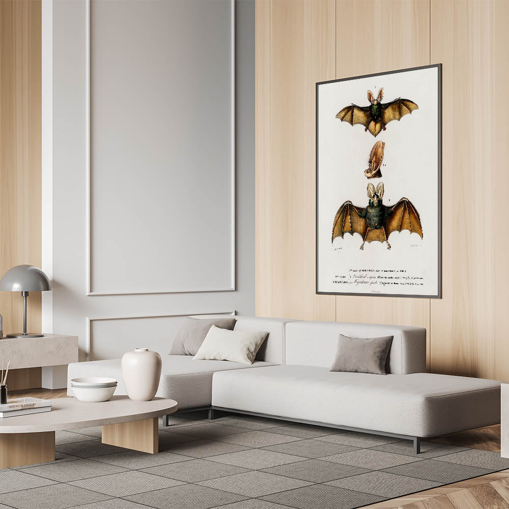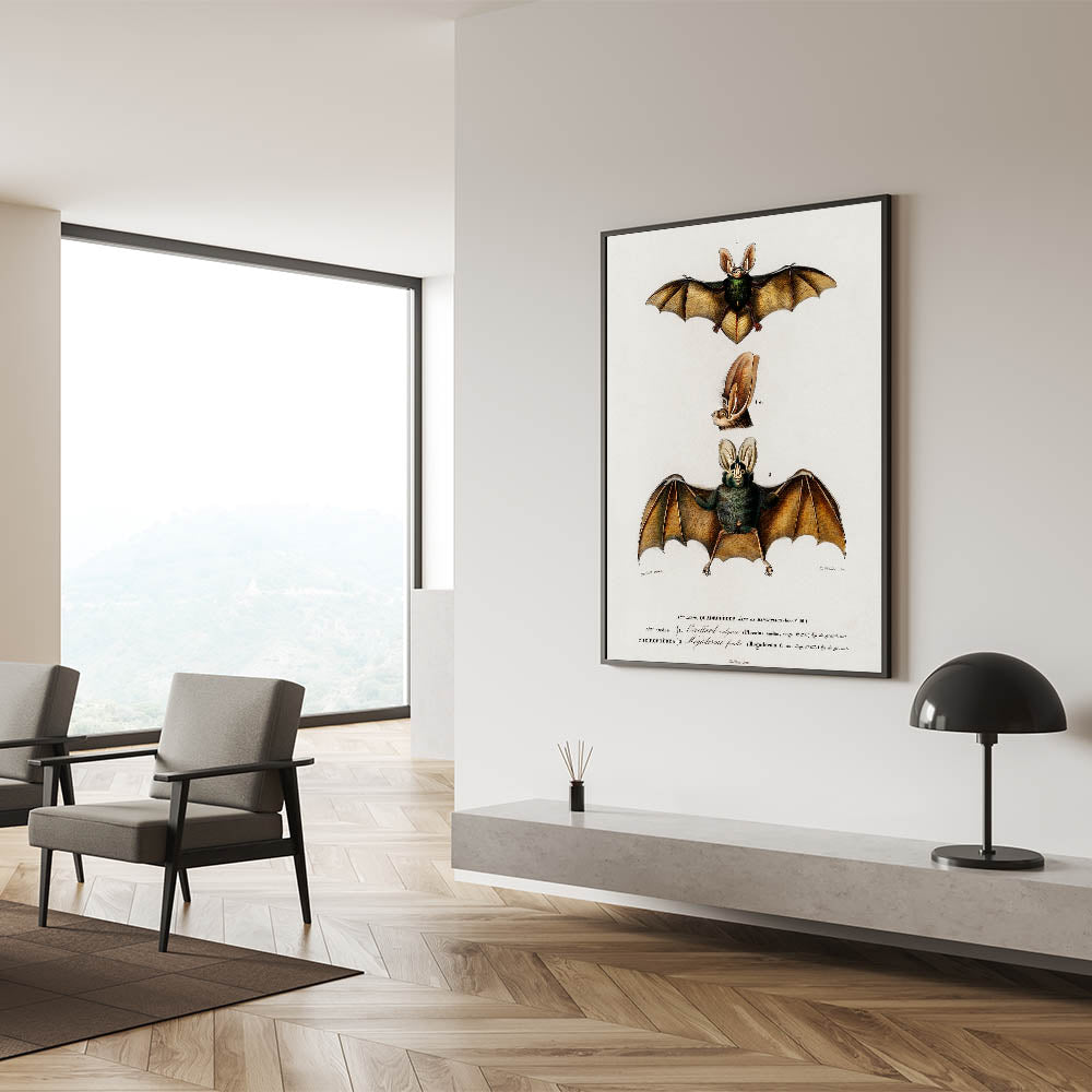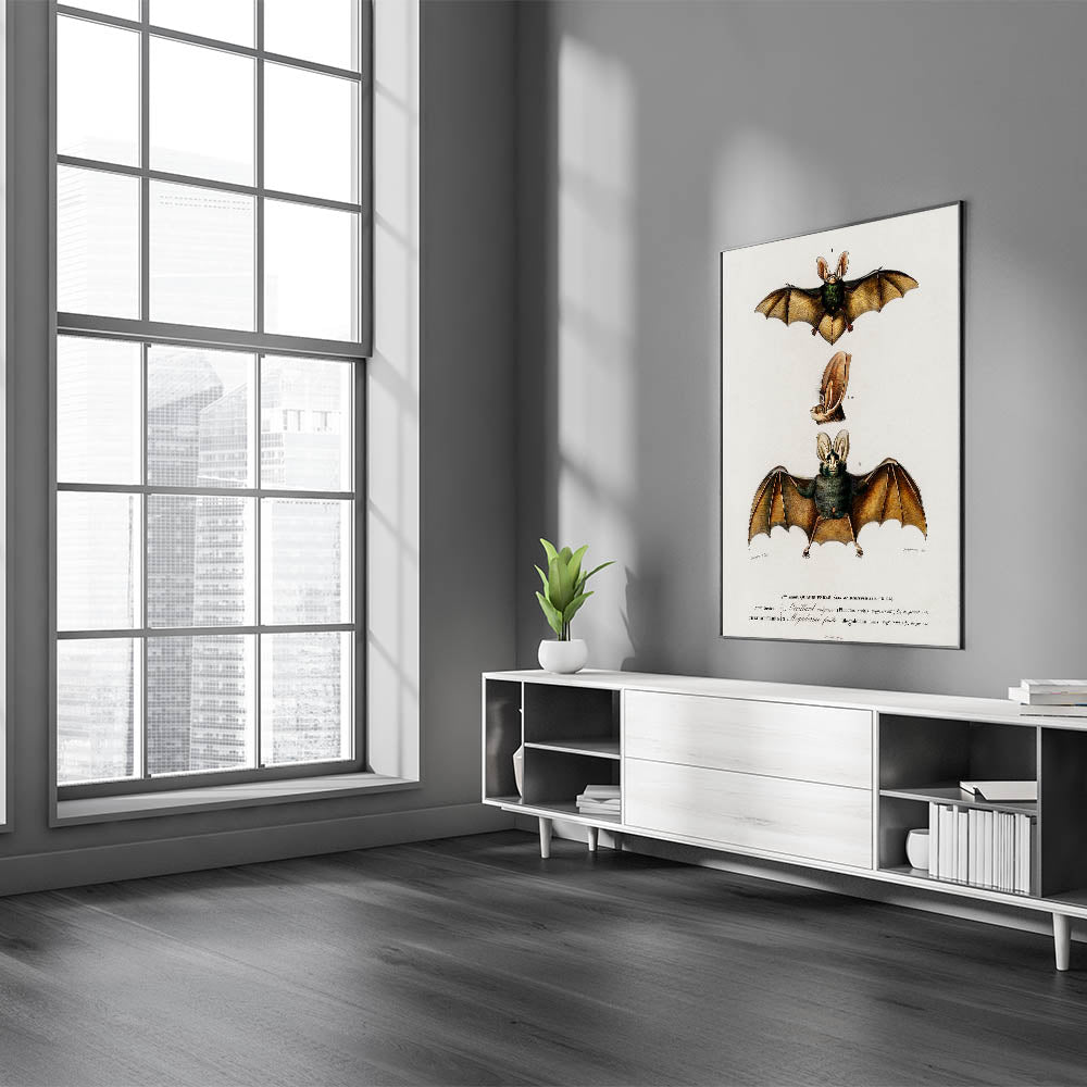 This fascinating scientific illustration of the Plecotus bat, created by Charles Dessalines D'Orbigny, beautifully showcases the Romanticism era's dedication to natural history and detailed artistry. Featuring multiple views of the bat with its distinctive elongated ears and intricate wing structure, this artwork highlights the intersection of scientific study and aesthetic beauty. Perfect for nature lovers, this piece offers a unique and timeless perspective on the marvels of the natural world.