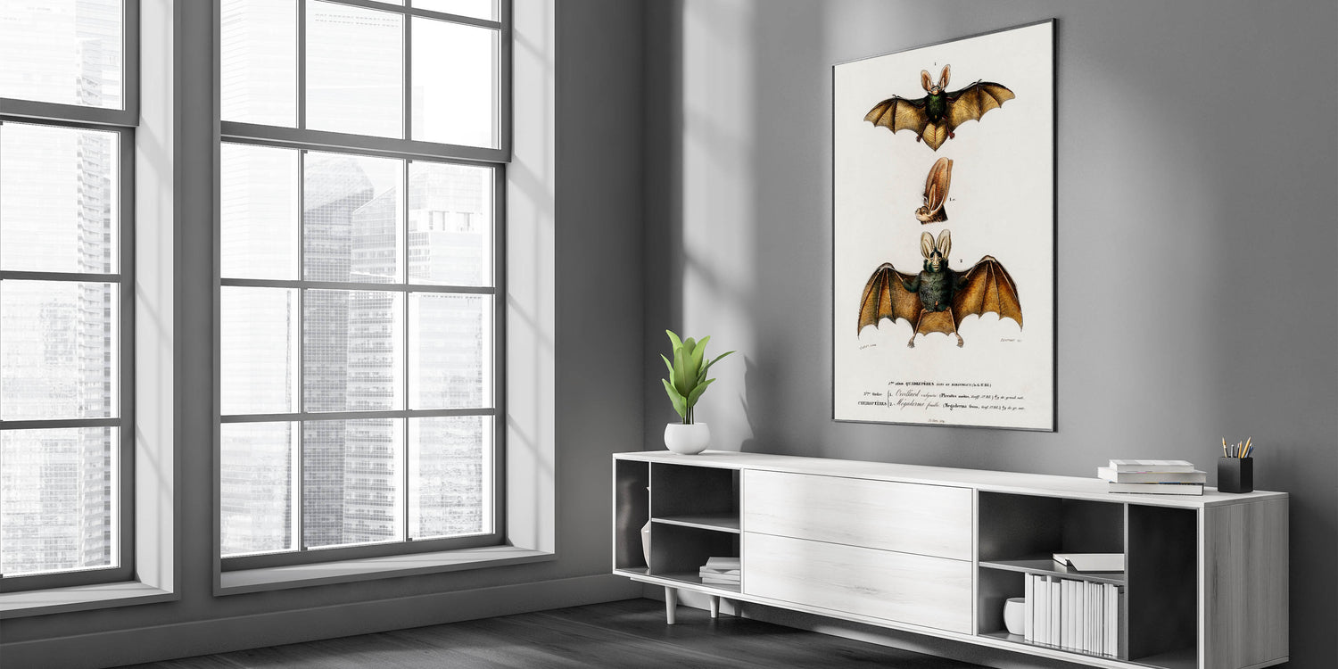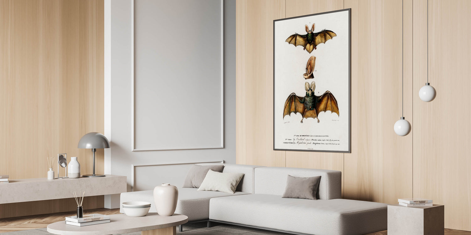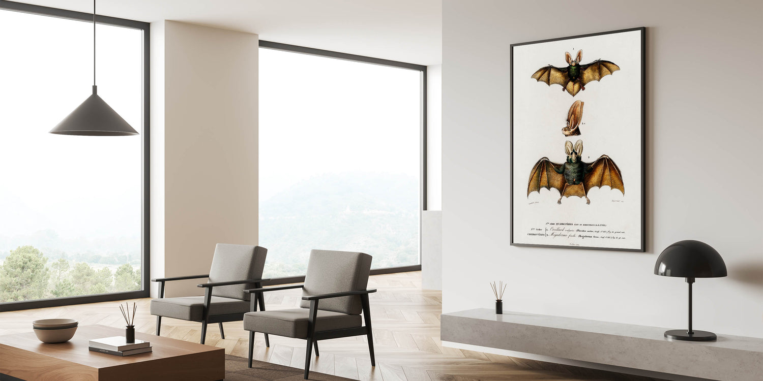 This fascinating scientific illustration of the Plecotus bat, created by Charles Dessalines D'Orbigny, beautifully showcases the Romanticism era's dedication to natural history and detailed artistry. Featuring multiple views of the bat with its distinctive elongated ears and intricate wing structure, this artwork highlights the intersection of scientific study and aesthetic beauty. Perfect for nature lovers, this piece offers a unique and timeless perspective on the marvels of the natural world.