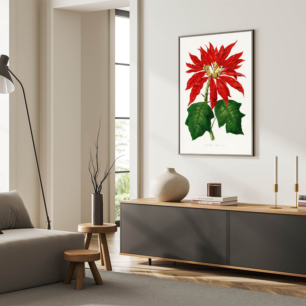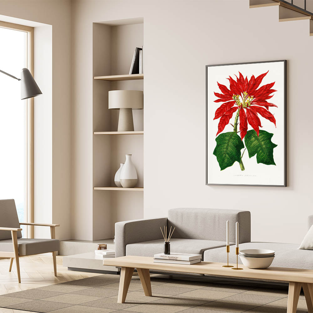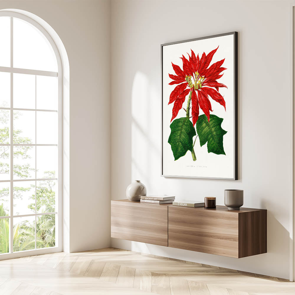 Brighten your space with the timeless beauty of Romanticism style wall art through this exquisite illustration of the Poinsettia (Poinsettia pulcherrima). Created by Alexander Francis Lydon and Benjamin Fawsett for the 1865 edition of Les Plantes à Feuillage Coloré, this artwork beautifully showcases the vibrant red bracts and rich green leaves of the Poinsettia. Known as the "Christmas flower," this illustration exudes elegance and botanical precision, making it a perfect addition to your decor.