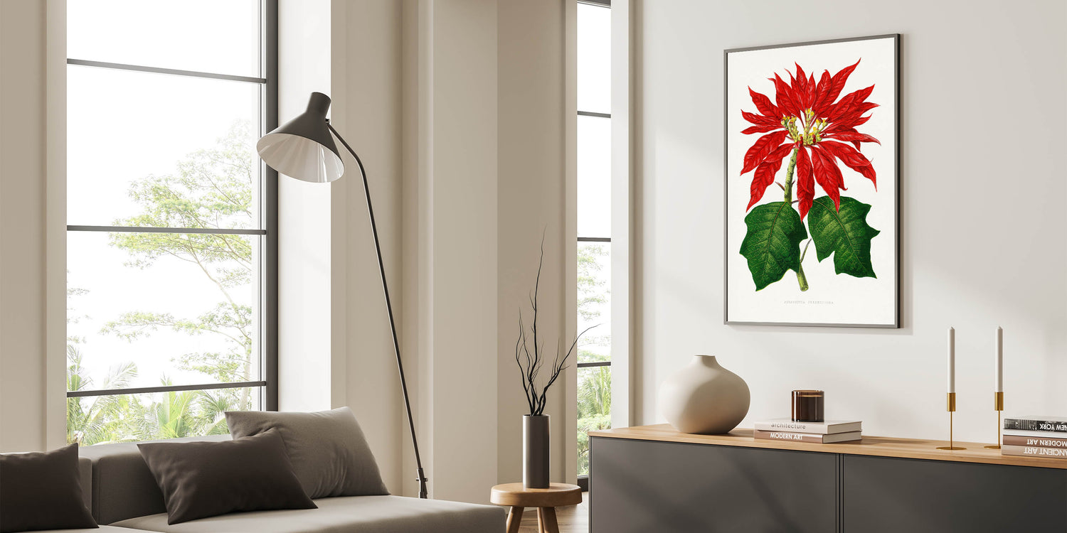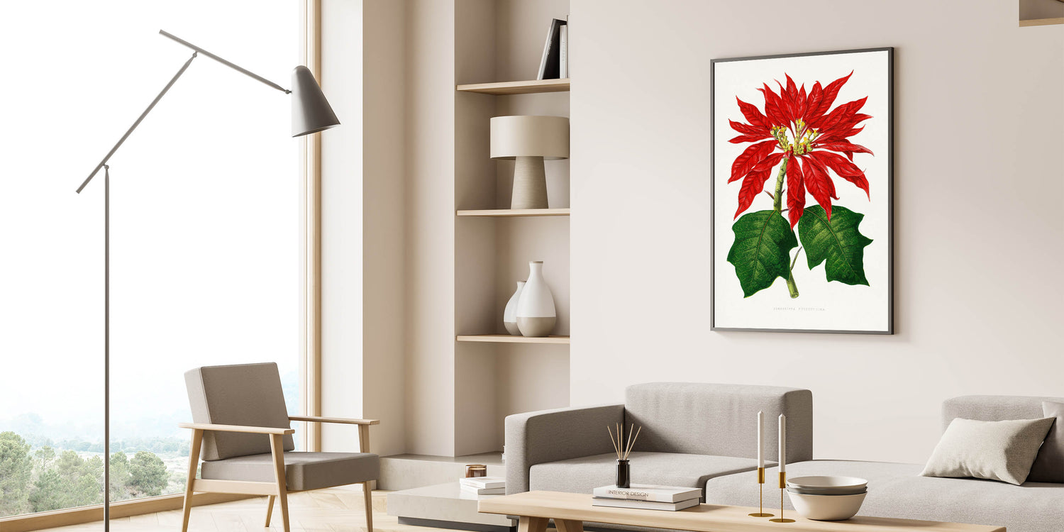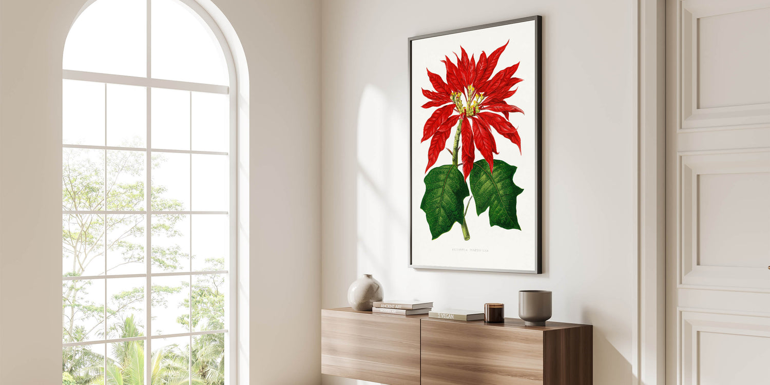 This classic art of the Romantic era celebrates the natural beauty of flora while embodying the elegance and charm of historic botanical art. Whether displayed as a seasonal focal point or part of a year-round gallery, this Poinsettia illustration is a stunning choice for Romantic art for home decor.
