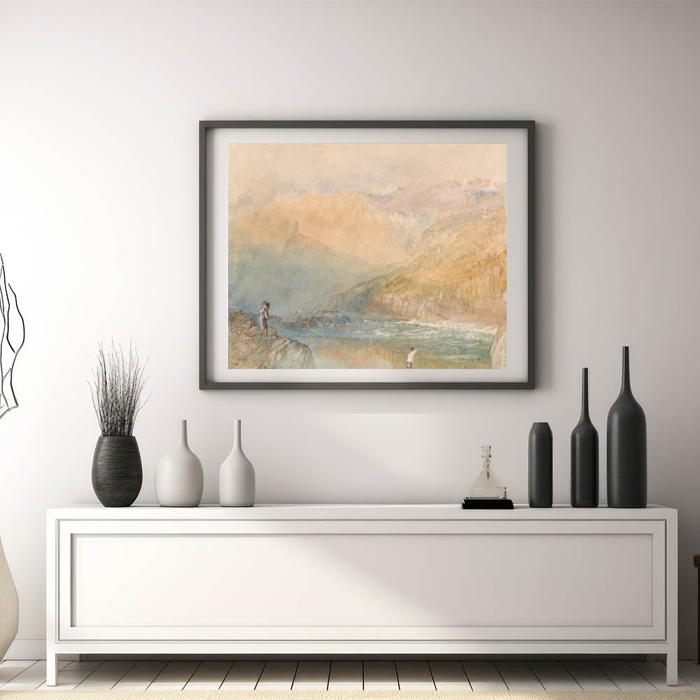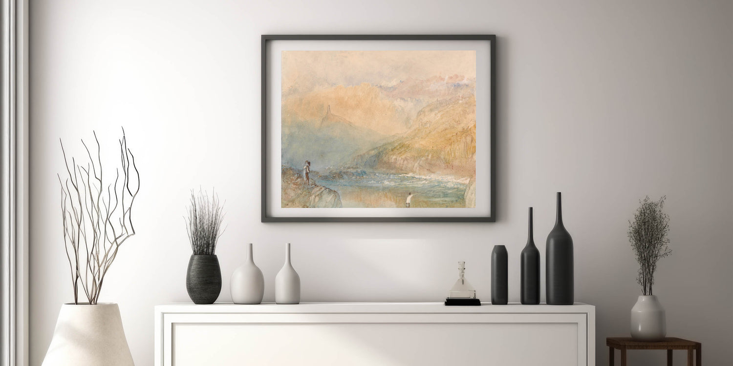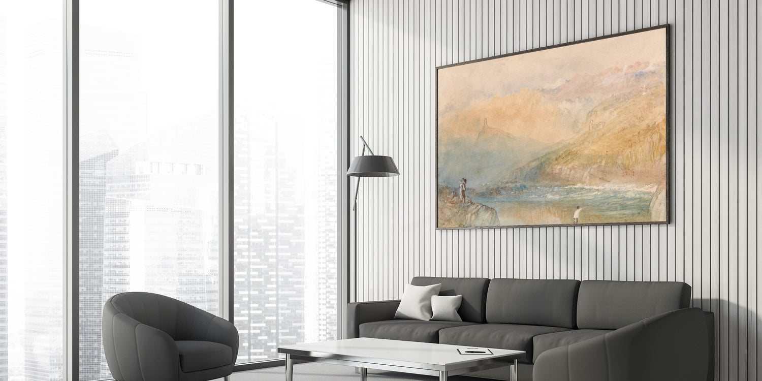 Immerse yourself in the tranquil beauty of the Moselle Valley with this Romanticism-era landscape. This ethereal painting captures the soft interplay of light and mist as it blankets the hills and riverbanks. The subtle details, such as the figures along the shore and distant architectural silhouettes, evoke a serene yet emotive connection to nature. This timeless artwork embodies the Romantic era's reverence for landscapes, offering a sense of calm and reflection.