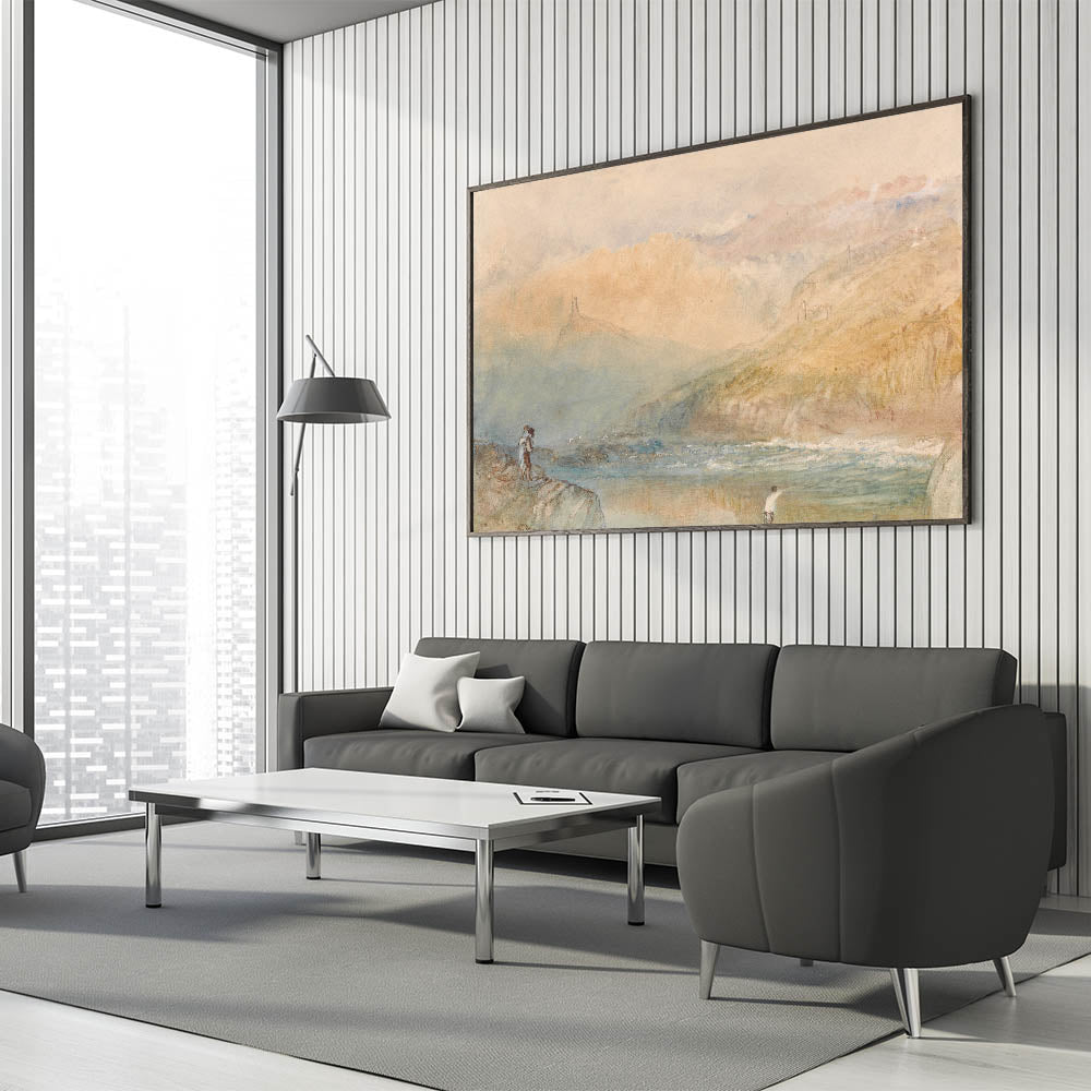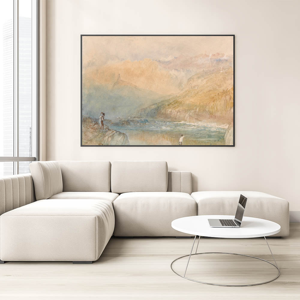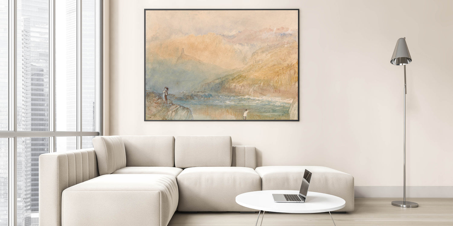 Immerse yourself in the tranquil beauty of the Moselle Valley with this Romanticism-era landscape. This ethereal painting captures the soft interplay of light and mist as it blankets the hills and riverbanks. The subtle details, such as the figures along the shore and distant architectural silhouettes, evoke a serene yet emotive connection to nature. This timeless artwork embodies the Romantic era's reverence for landscapes, offering a sense of calm and reflection.
